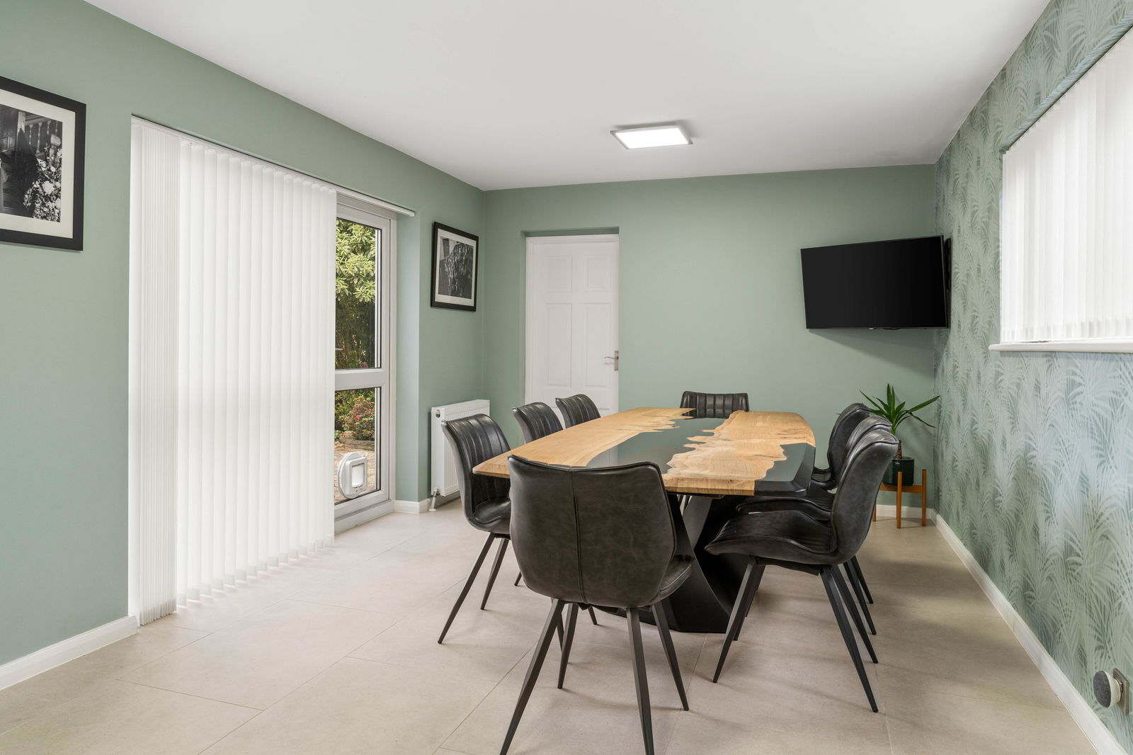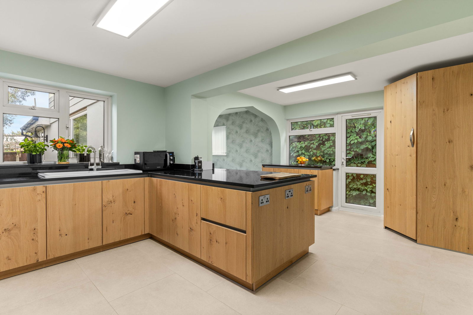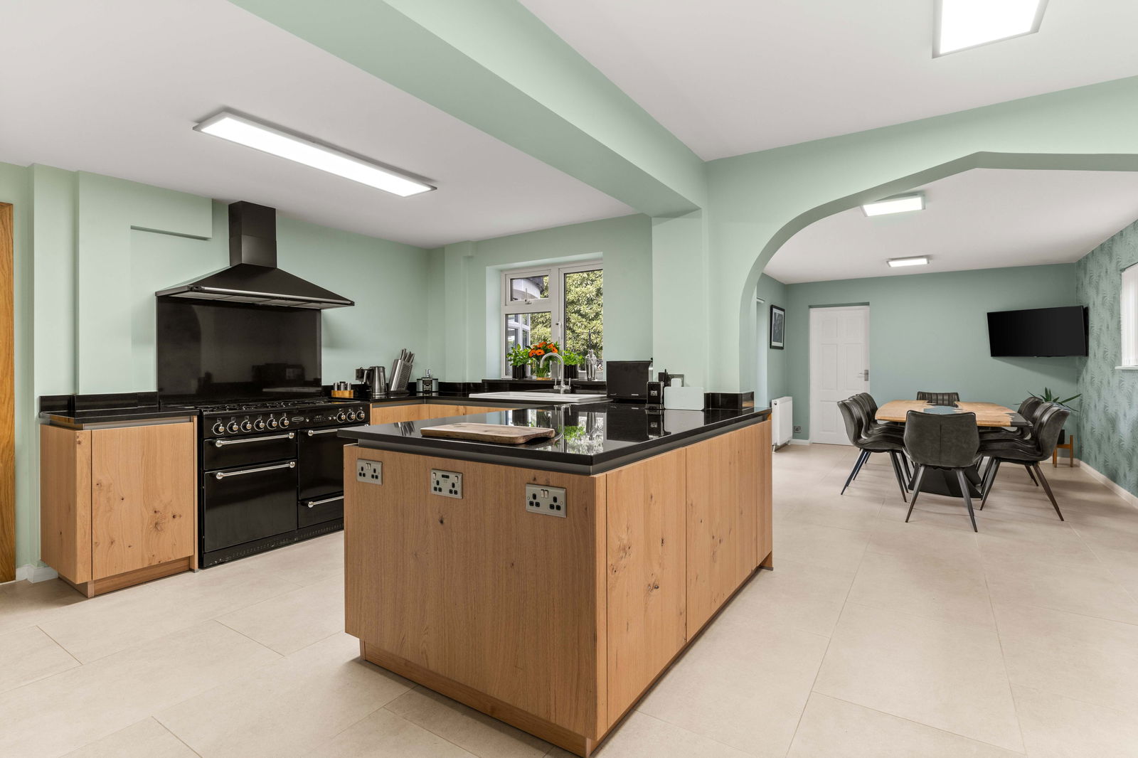 The bespoke kitchen is by the German kitchen design company Schuller and features a Rangemaster cooker, integrated freezer and dishwasher. The fridge is by the Corner Fridge Company and provides a fully integrated fridge and larder offering 1200litres of refrigerated storage. This beautifully styled kitchen flows seamlessly into a further reception room for entertaining. Doors from this entertaining space lead outside onto the morning patio and through to office number two.