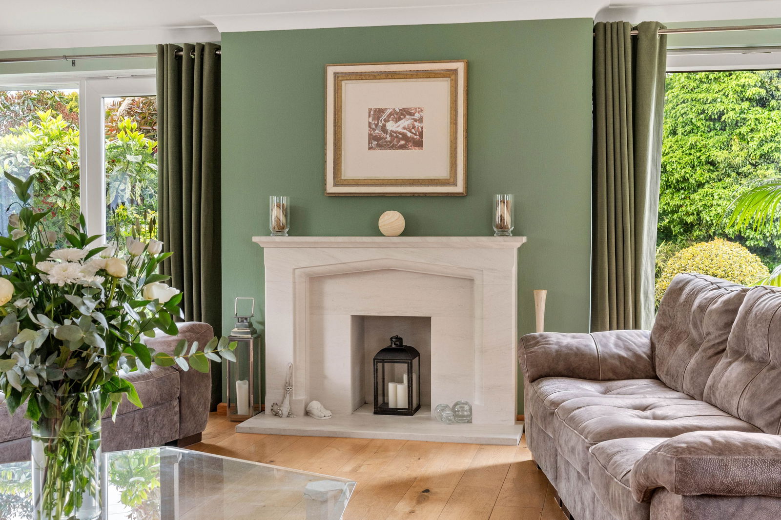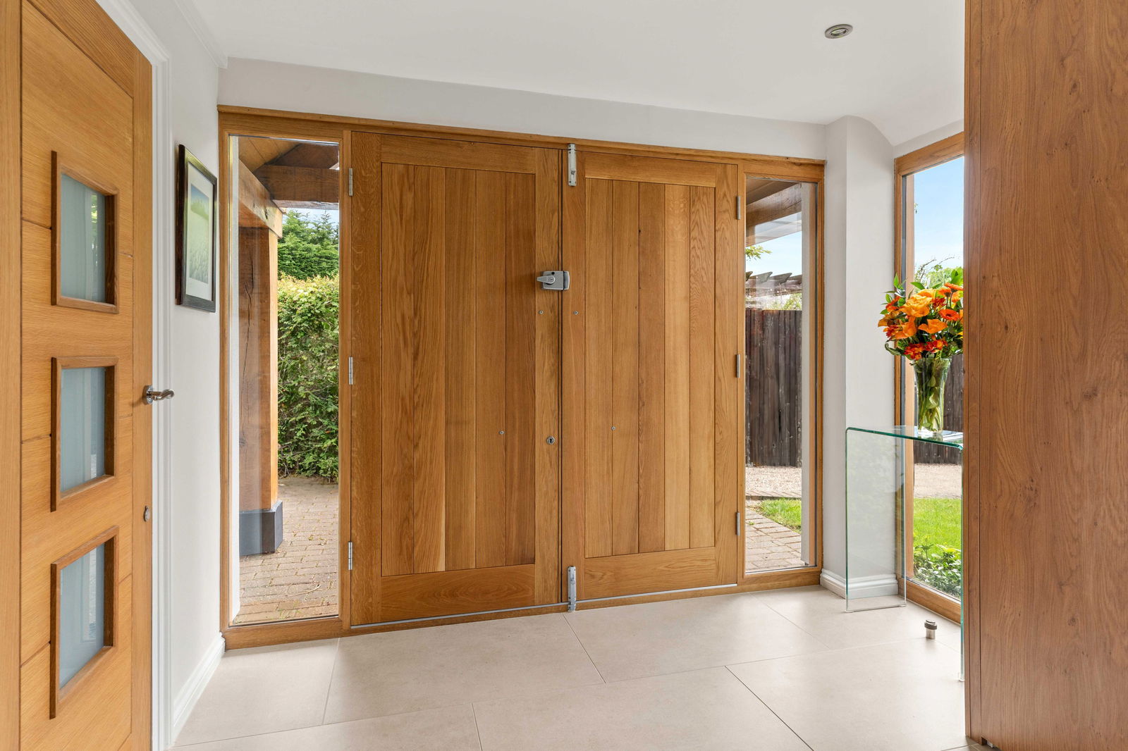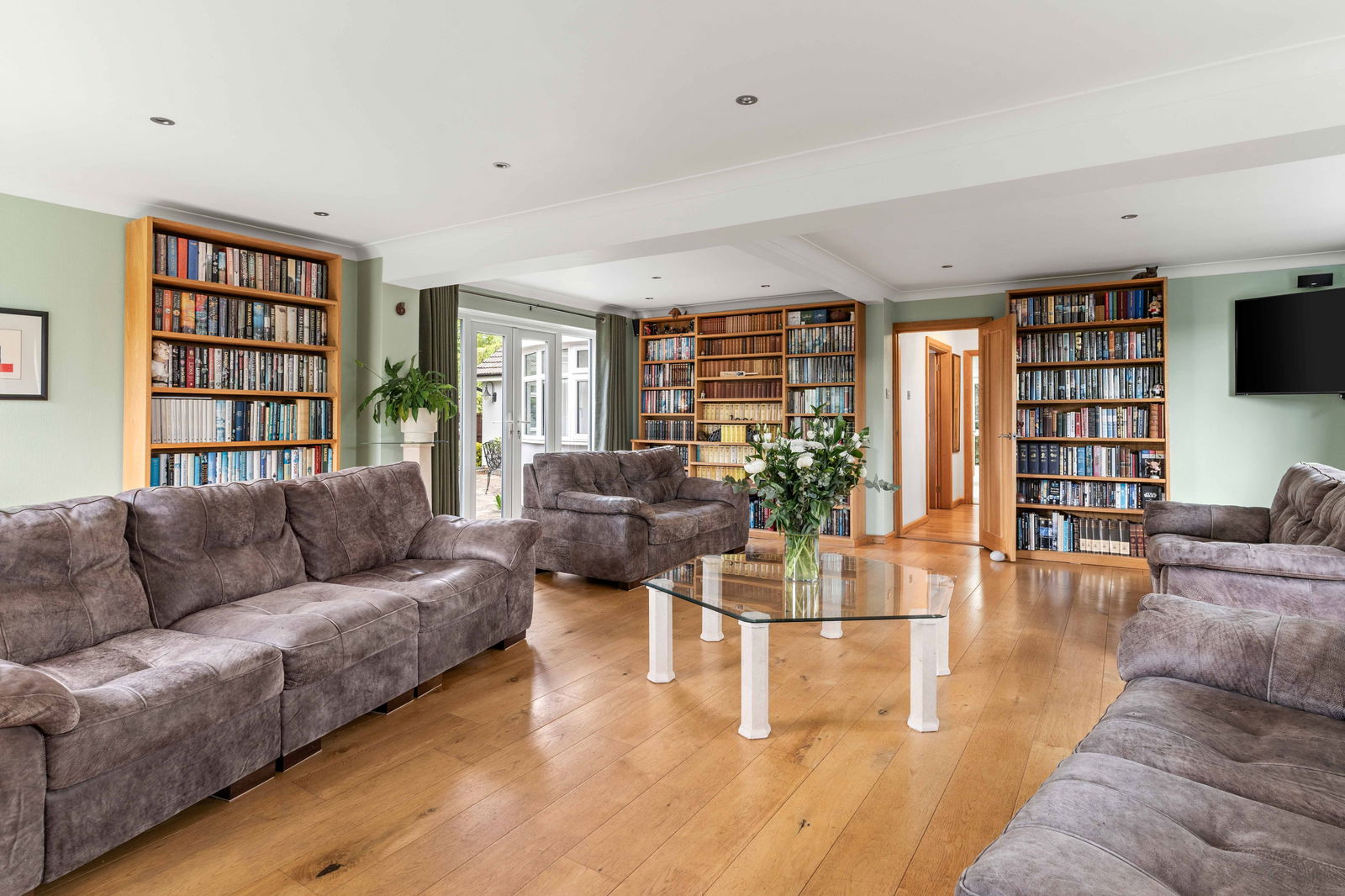 The impressive entrance comprises a solid oak portico leading to a fully glazed entrance hall with built-in storage and doors to two hallways. The first hallway gives access to the large, bright and airy triple-aspect main reception room which has a feature fireplace and doors leading to the gardens and morning patio. Also off of this hallway is the dining room with a beautiful, large bay window which overlooks the garden and floods the room with natural light. One of the two offices is accessed from the main hallway.