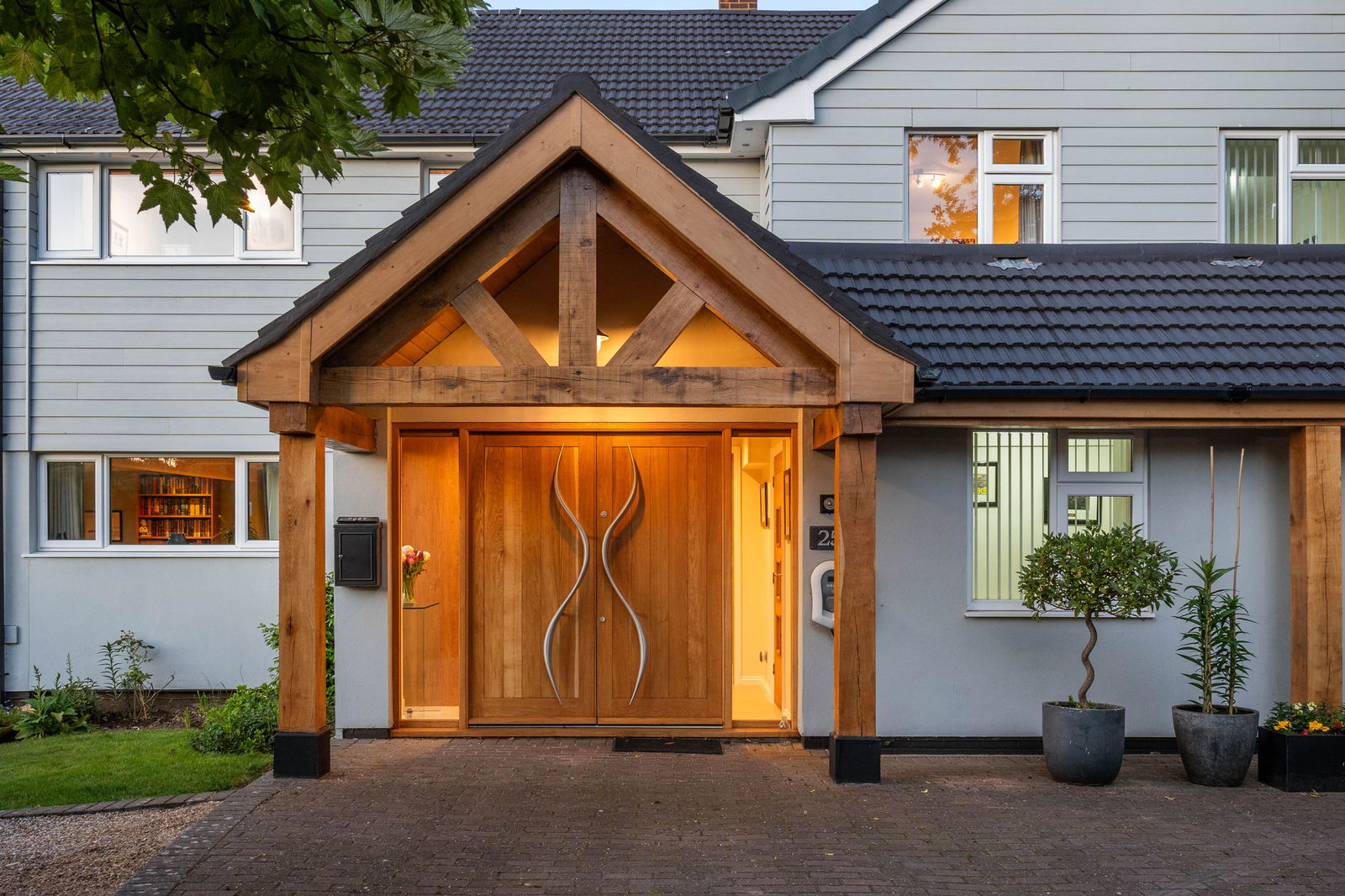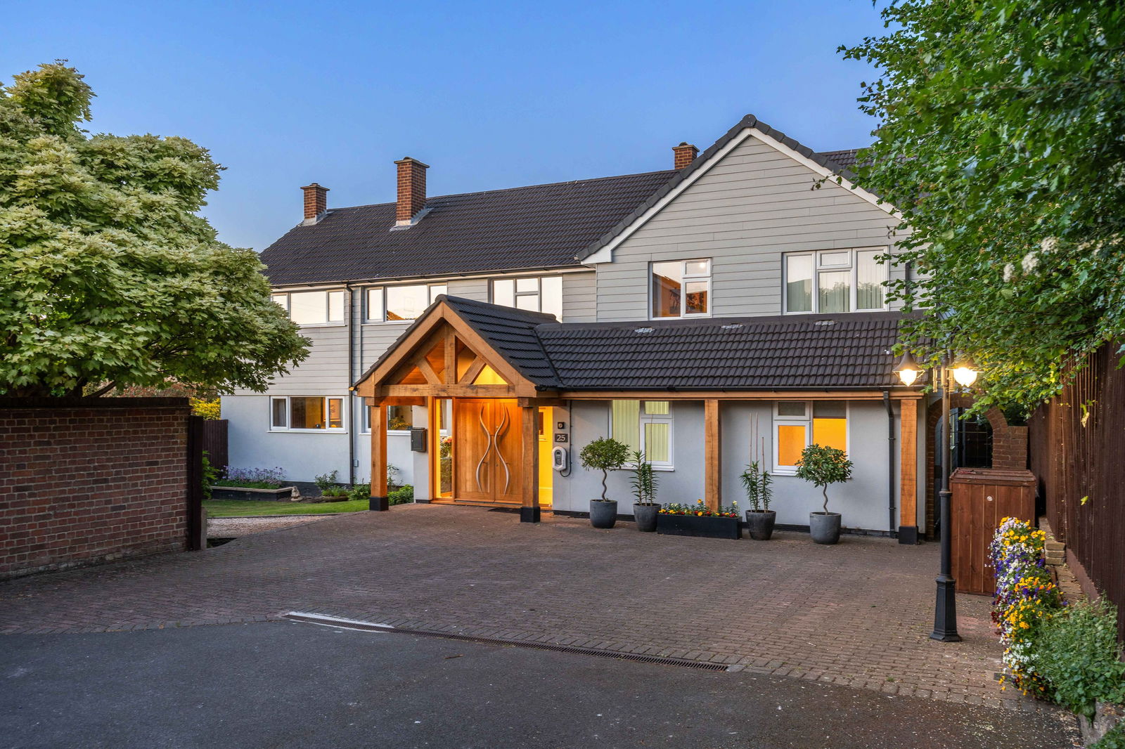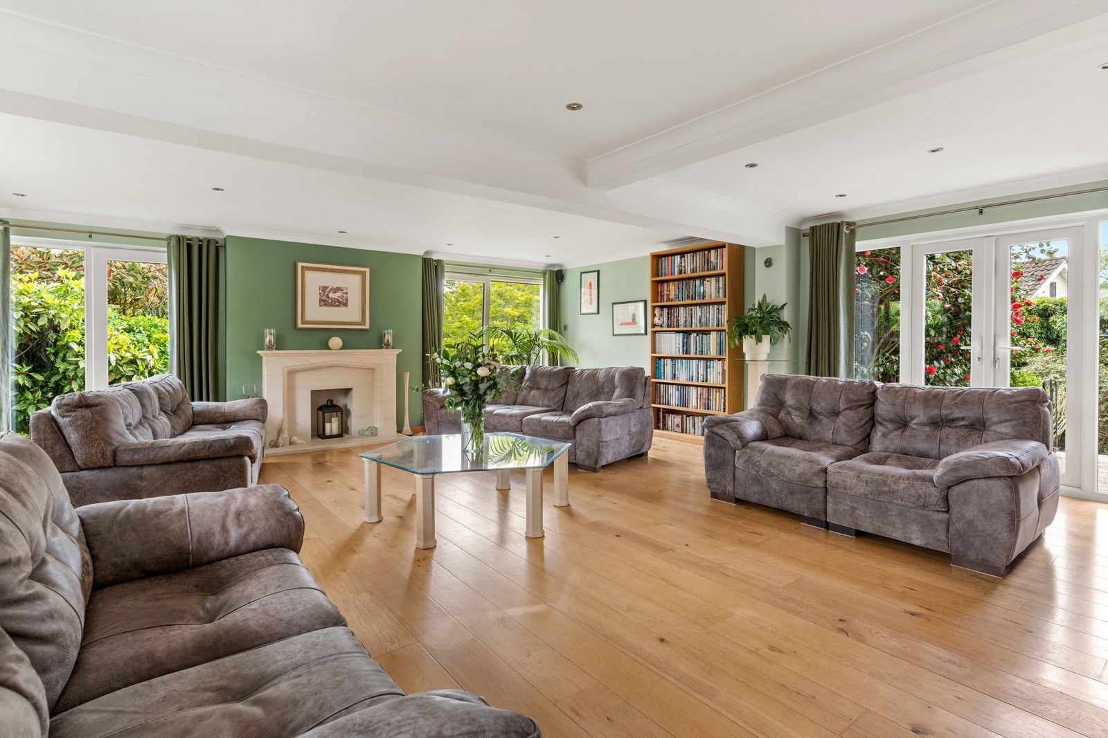 The impressive entrance comprises a solid oak portico leading to a fully glazed entrance hall with built-in storage and doors to two hallways. The first hallway gives access to the large, bright and airy triple-aspect main reception room which has a feature fireplace and doors leading to the gardens and morning patio. Also off of this hallway is the dining room with a beautiful, large bay window which overlooks the garden and floods the room with natural light. One of the two offices is accessed from the main hallway.