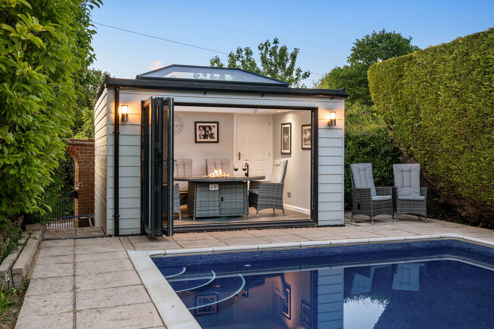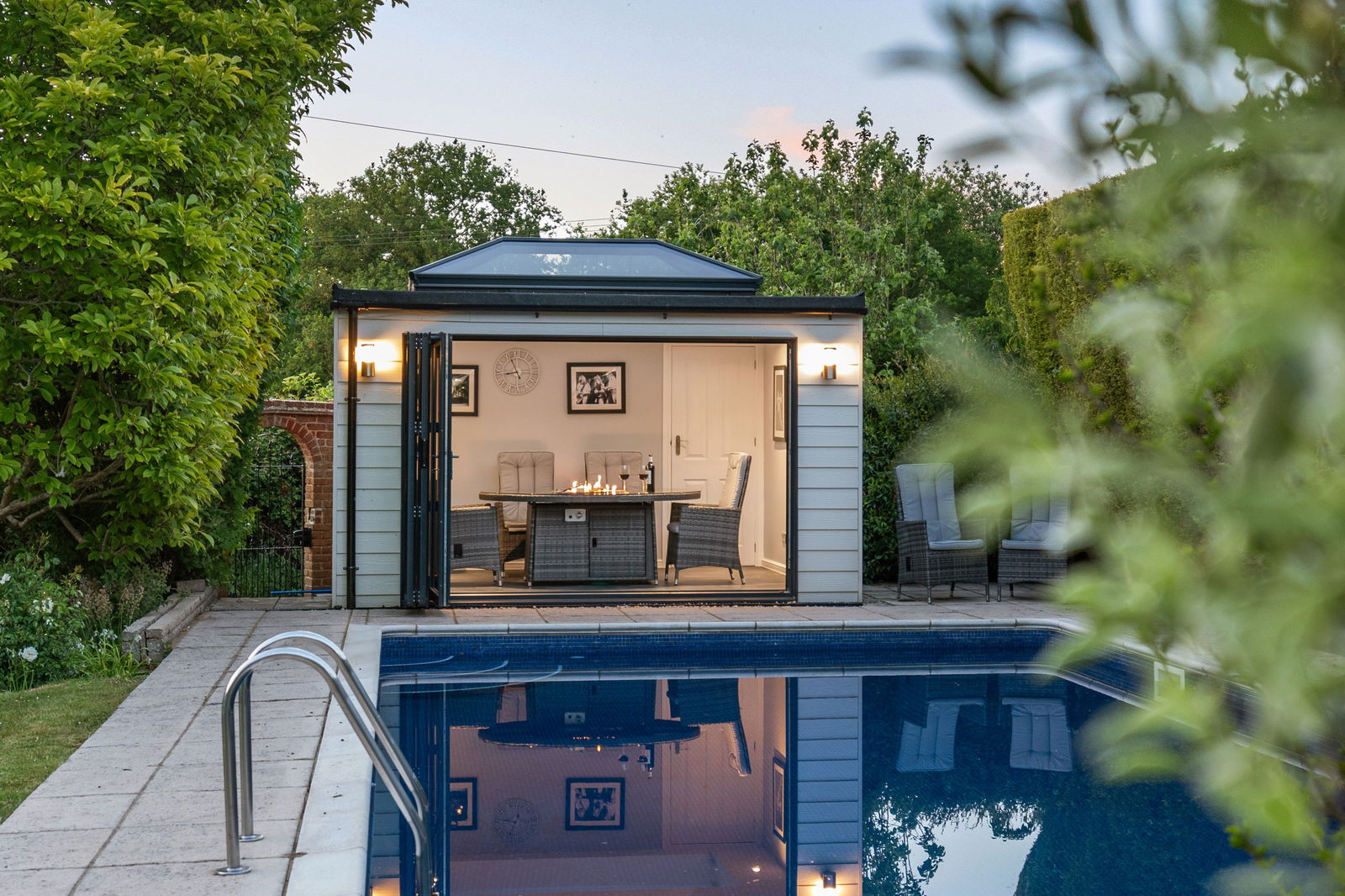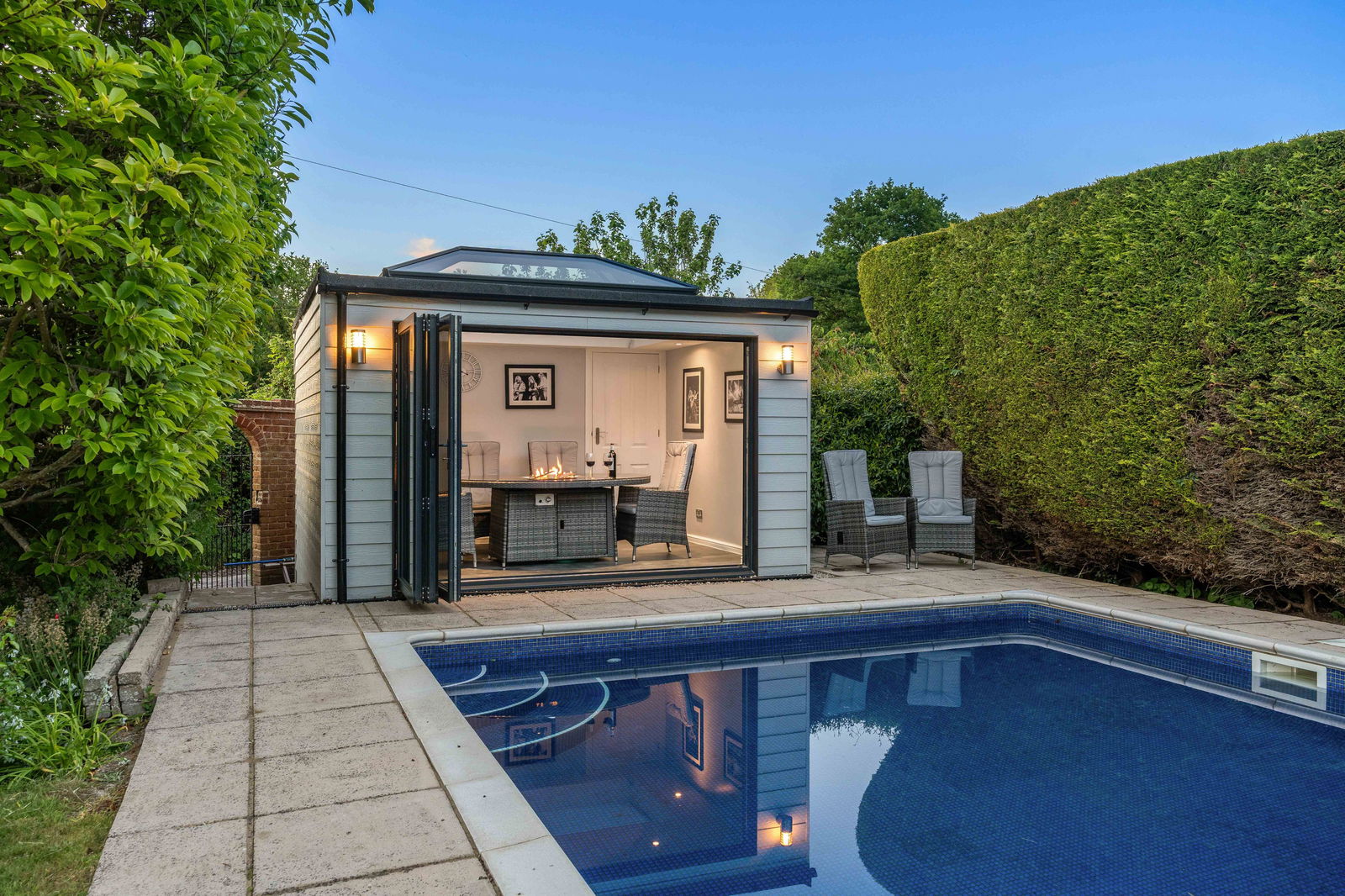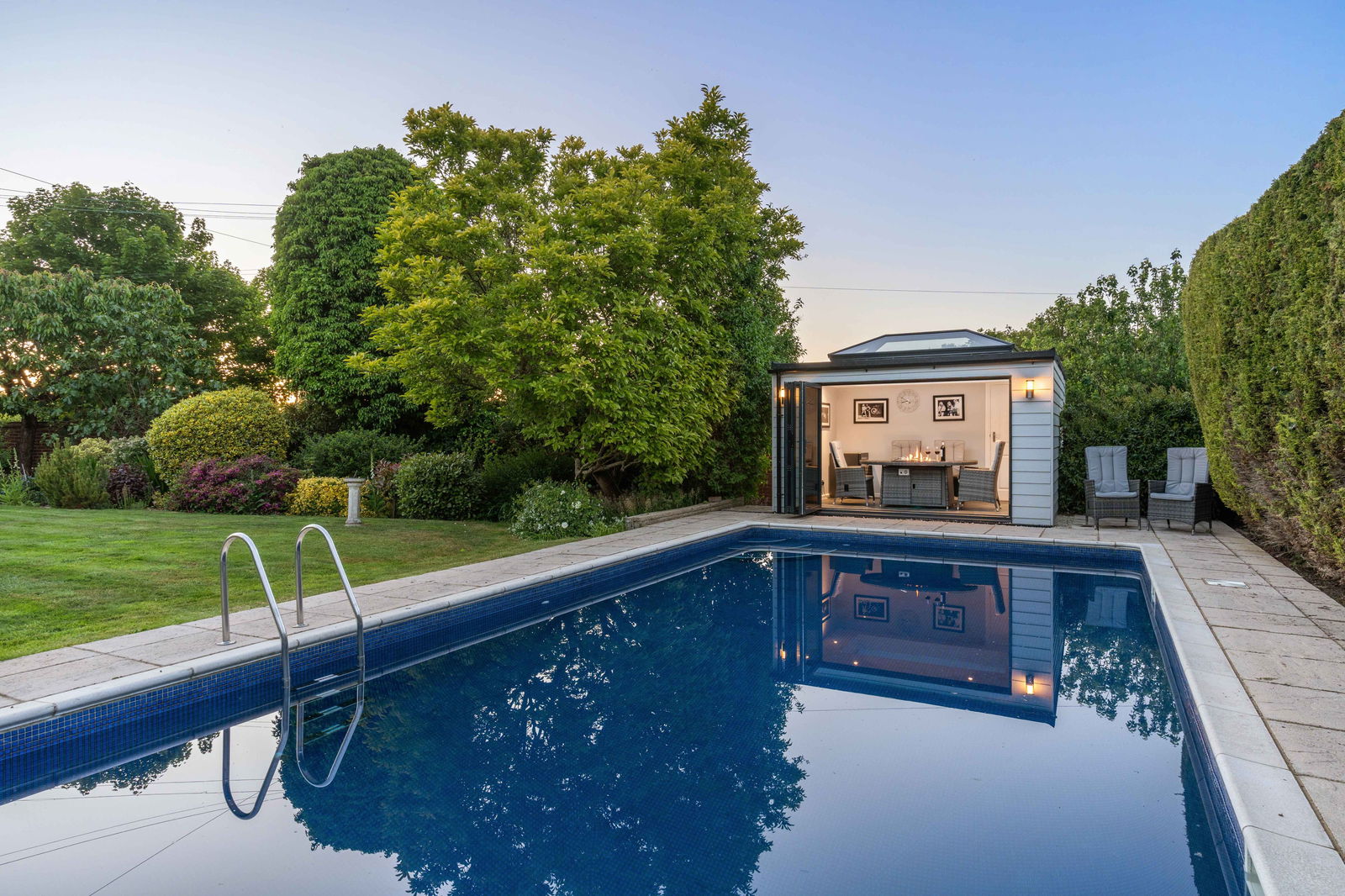 The gardens offer a relaxing ambience with outside lighting, beautifully tended with mature trees, shrubs, flower borders and lawned areas, leading down to the heated swimming pool with paved surround. The Pool House has an atrium roof and offers space for ‘alfresco’ dining. An Air Source Heat Pump heats the pool heats up to 30degrees throughout the summer months.