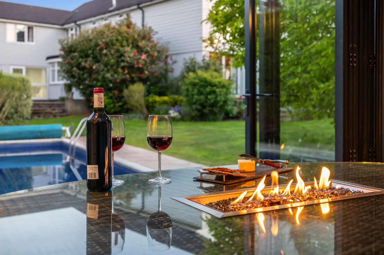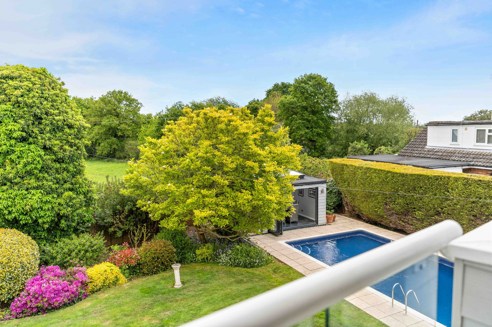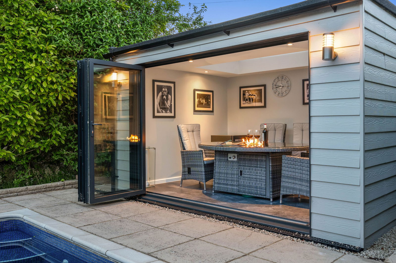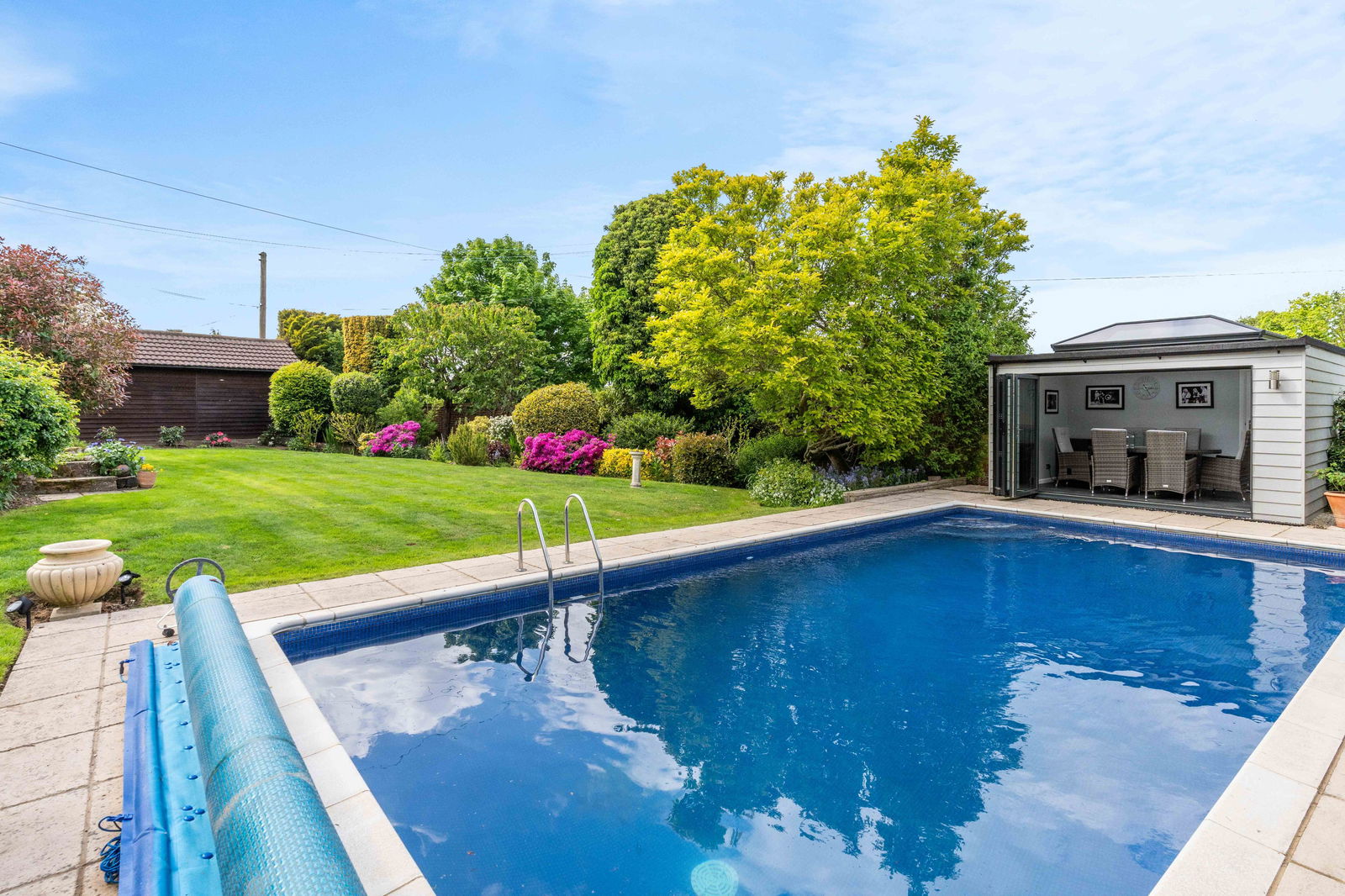 The gardens offer a relaxing ambience with outside lighting, beautifully tended with mature trees, shrubs, flower borders and lawned areas, leading down to the heated swimming pool with paved surround. The Pool House has an atrium roof and offers space for ‘alfresco’ dining. An Air Source Heat Pump heats the pool heats up to 30degrees throughout the summer months.
