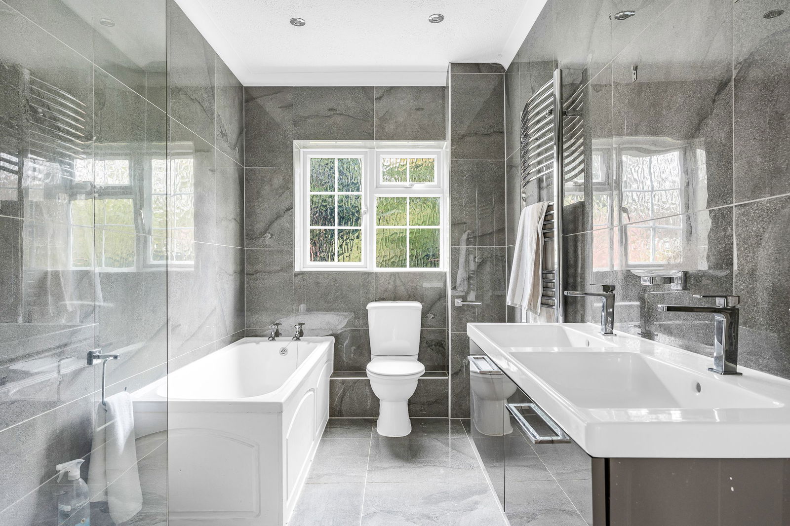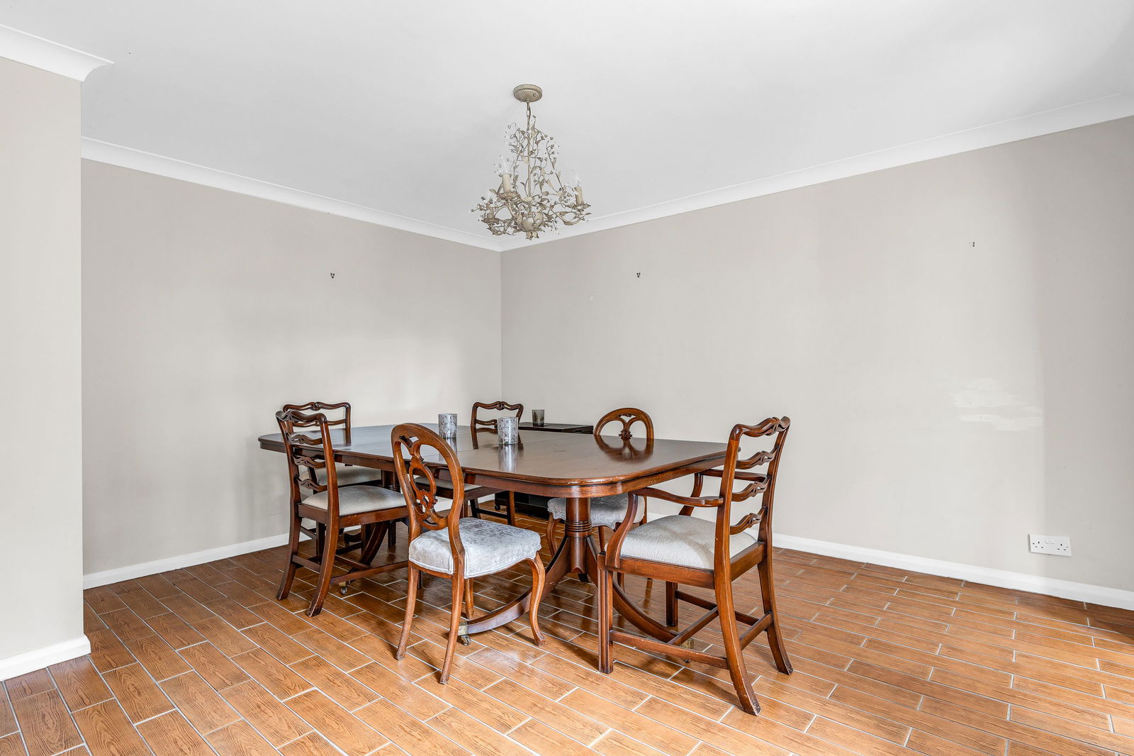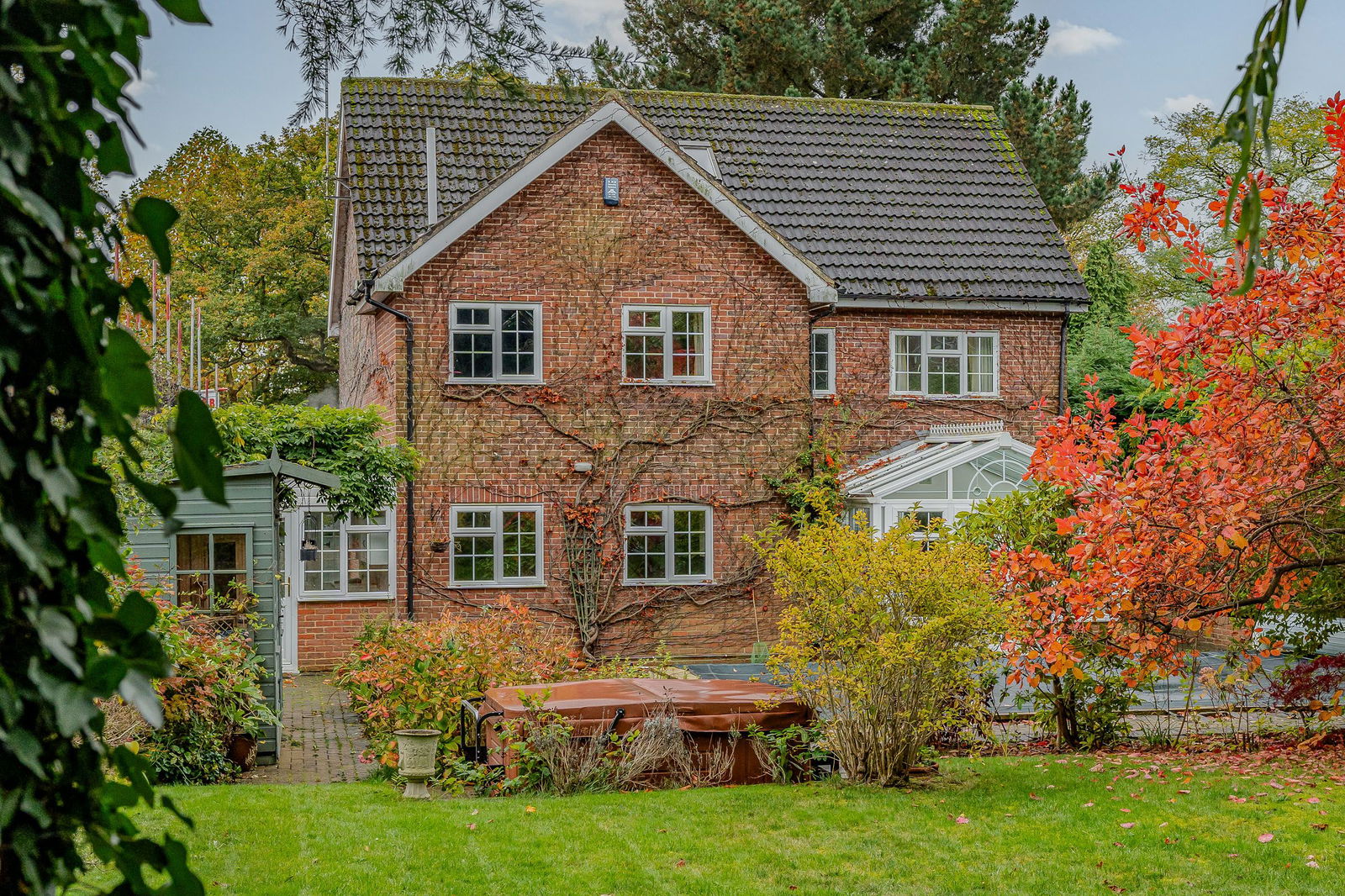 Stepping outside, the property’s rear garden offers a heated swimming pool, Jacuzzi, and a mix of mature trees and landscaped shrubbery, providing a great space to sit and enjoy the outside. The detached garage, coupled with extensive driveway parking, ensures ample space for vehicles and additional storage.