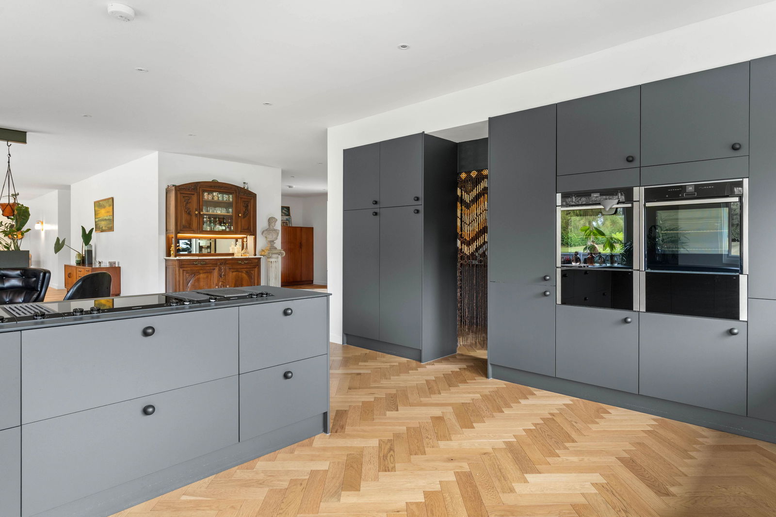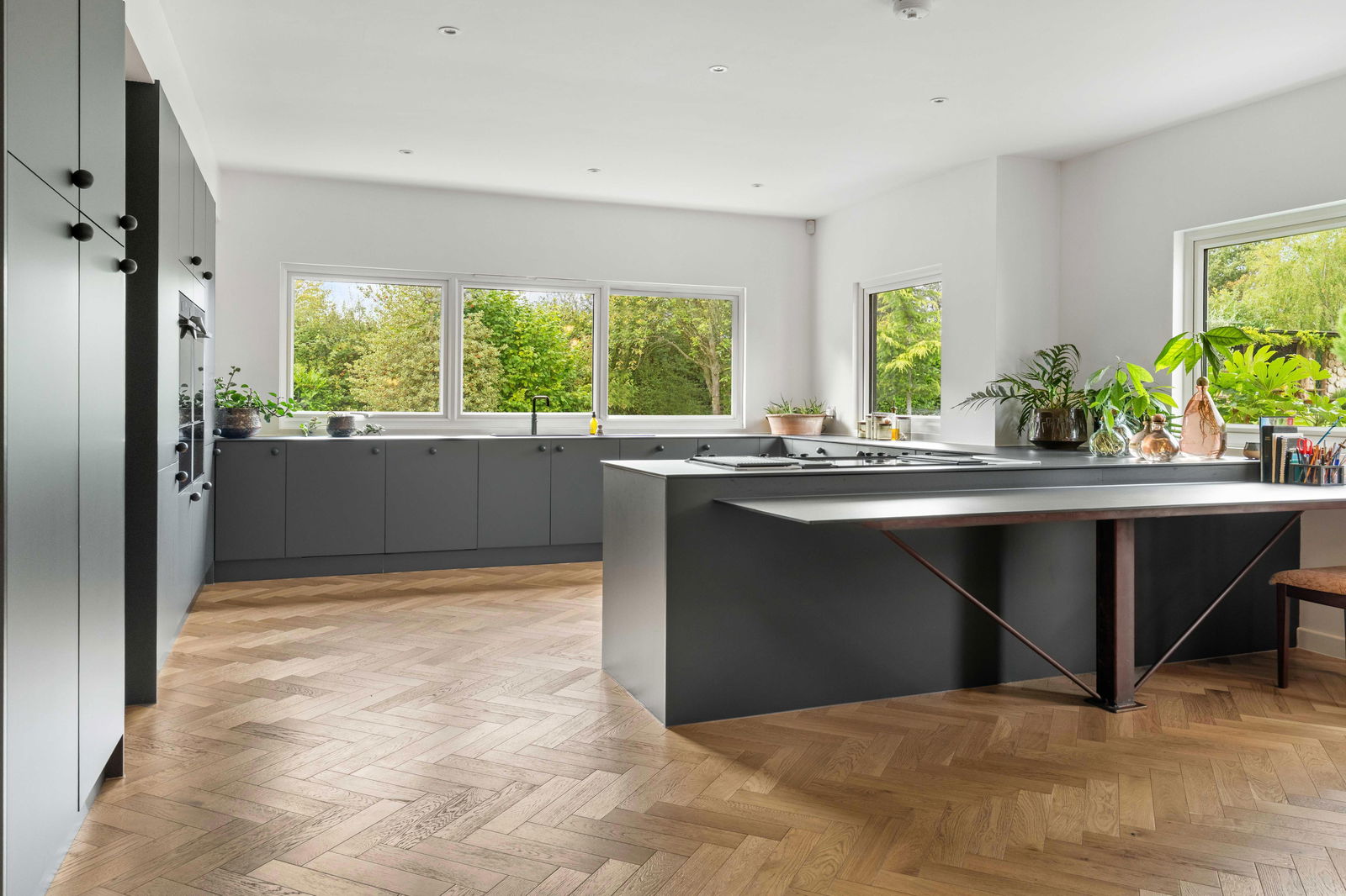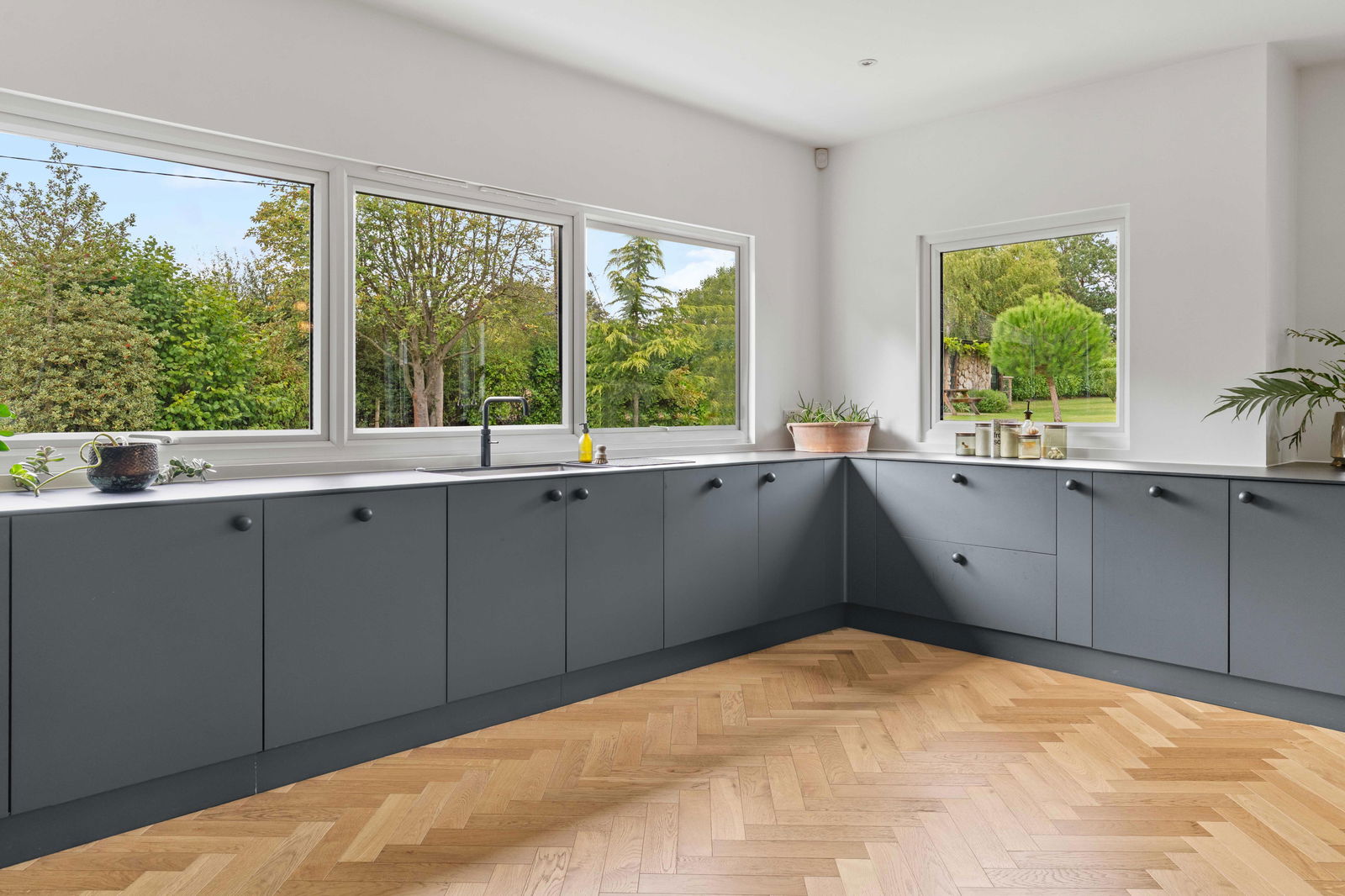 The focal point of the home is the spectacular open-plan kitchen/dining/family space, extending to an impressive 66ft. of beautifully crafted design with bespoke fitted storage and picture windows. Bathed in natural light, this space is zoned to provide distinct areas: a comfortable lounge with an open fireplace, a snug area with a second open fire for cosy evenings and a fabulous dining zone with direct access to the sun terrace – perfect for entertaining. Seamlessly connected, the bespoke kitchen is a showpiece in its own right, designed with style and functionality in mind. Sleek grey cabinetry is paired with super heat-resistant Dekton worktops, while extensive appliances include two ovens, two warming drawers, two dishwashers, a boiling tap and an in-sink erator. Picture windows flood the space with light from every angle, and an adjacent larder room with external access adds further practicality.