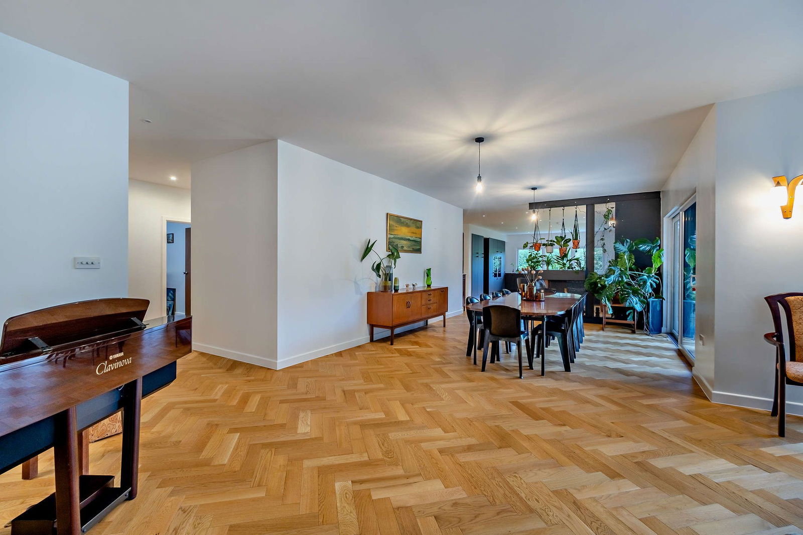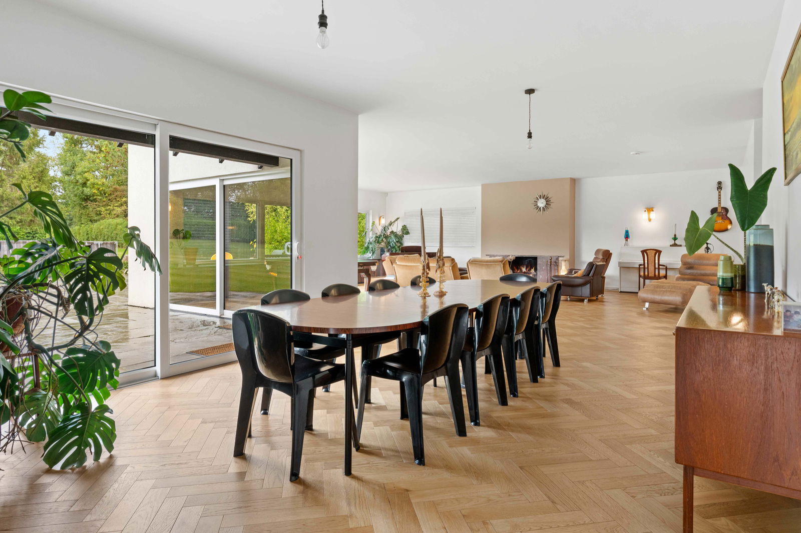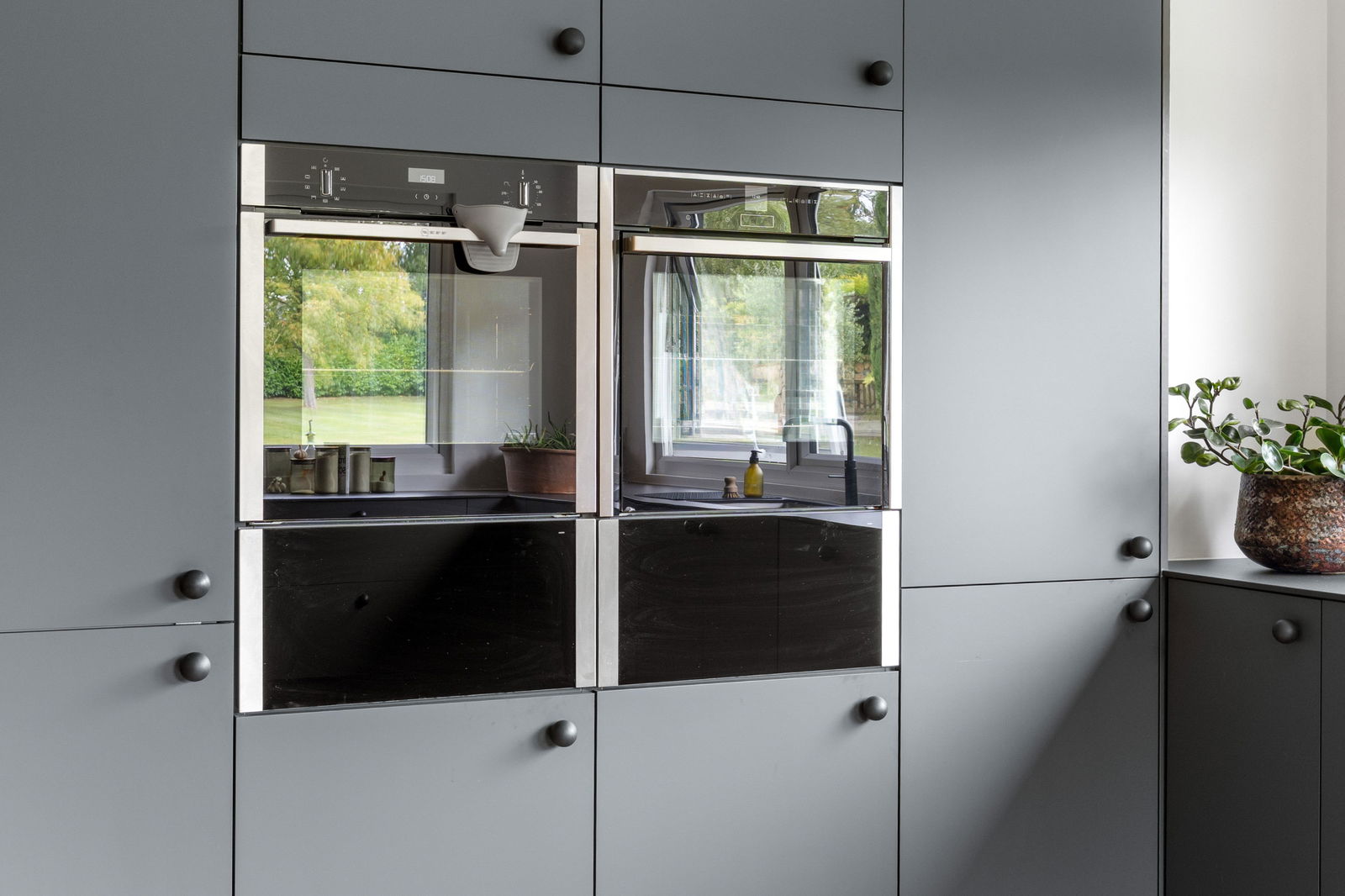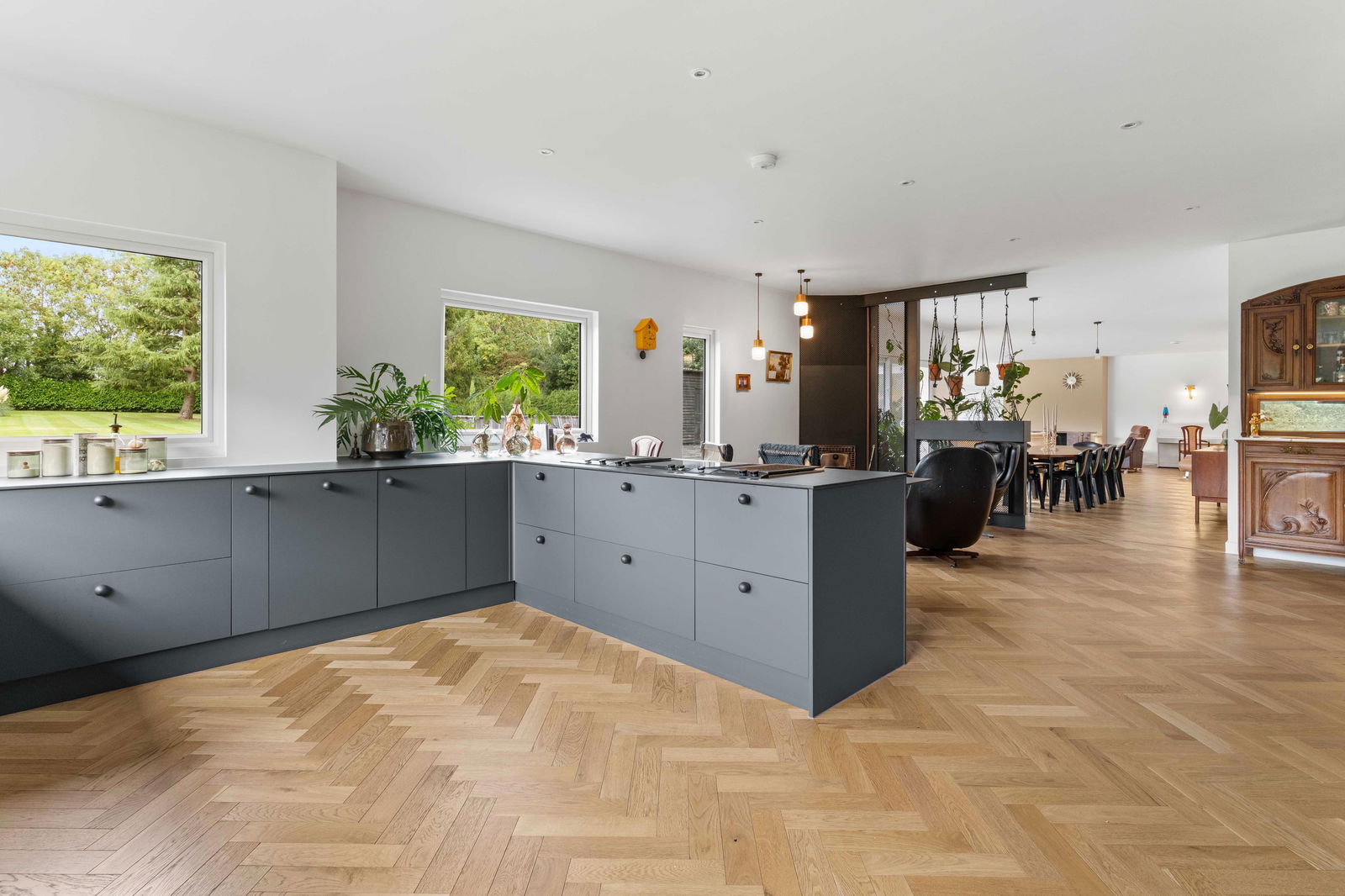 The focal point of the home is the spectacular open-plan kitchen/dining/family space, extending to an impressive 66ft. of beautifully crafted design with bespoke fitted storage and picture windows. Bathed in natural light, this space is zoned to provide distinct areas: a comfortable lounge with an open fireplace, a snug area with a second open fire for cosy evenings and a fabulous dining zone with direct access to the sun terrace – perfect for entertaining. Seamlessly connected, the bespoke kitchen is a showpiece in its own right, designed with style and functionality in mind. Sleek grey cabinetry is paired with super heat-resistant Dekton worktops, while extensive appliances include two ovens, two warming drawers, two dishwashers, a boiling tap and an in-sink erator. Picture windows flood the space with light from every angle, and an adjacent larder room with external access adds further practicality.