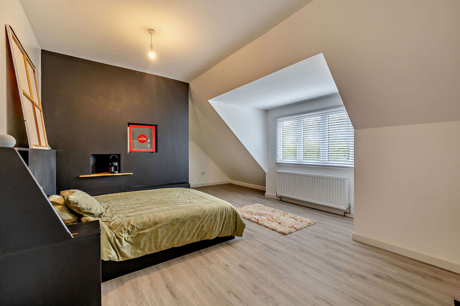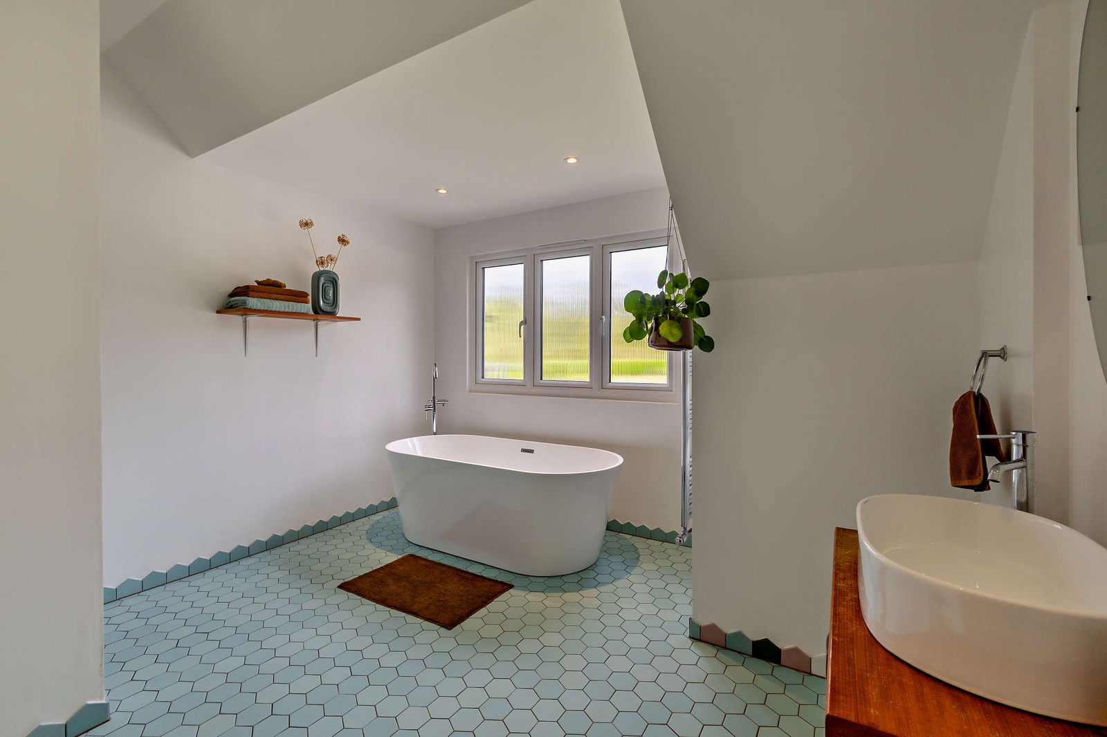 The central staircase rises to a bright and open landing, creating a versatile space ideal for study or relaxation, framed by a striking picture window with far-reaching views.