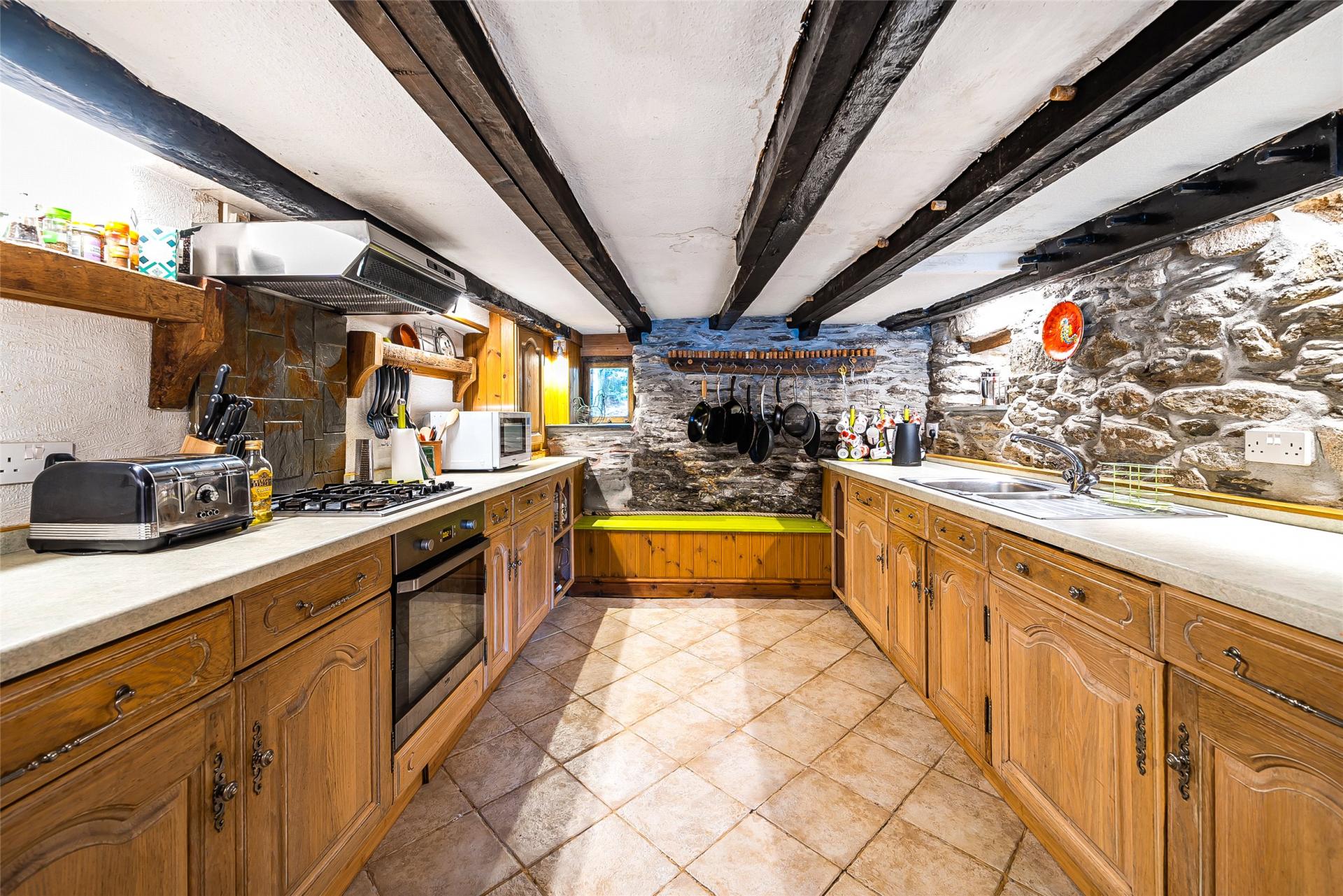Stairs from the hallway lead down to the lower floor – formerly the cellars of the infamous Sailors Return – the fitted kitchen and dining room now situated here offer beamed ceilings, exposed stonework and tiled floors.