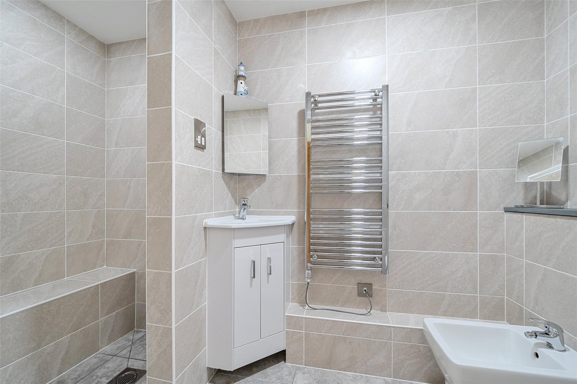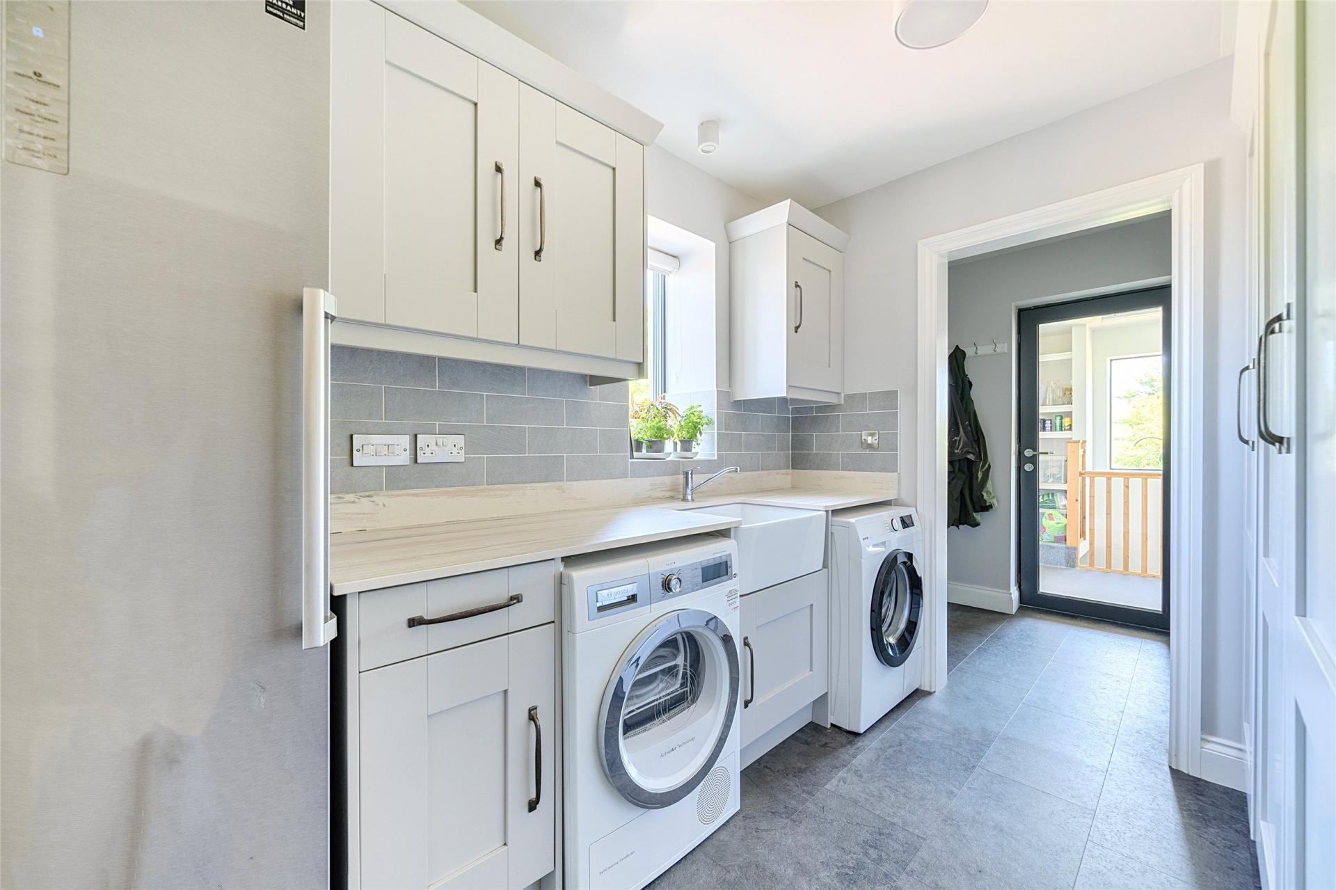 Additional rooms on this floor include a well-appointed office with built-in shelving, a cloakroom/WC, and a utility room finished to the same high standard as the kitchen. The utility comes equipped with a Samsung freezer, Bosch tumble dryer, and Gorenje washing machine. A secondary staircase descends from here to a practical storage room.