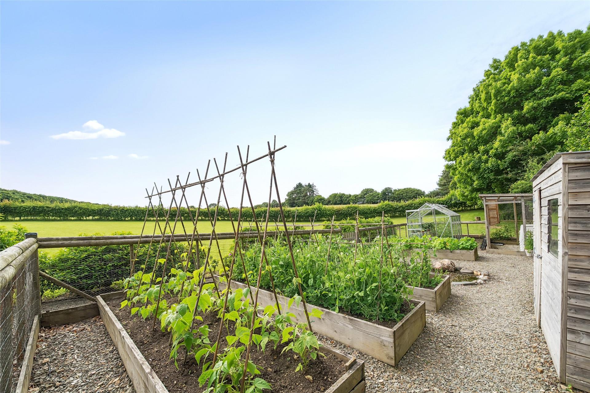 The gardens offer a mix of formal planting, lawns, multiple patios, and sitting areas to follow the sun throughout the day. A paddock provides further space for small livestock, equestrian use, or simply enhances the sense of privacy and space around the home.