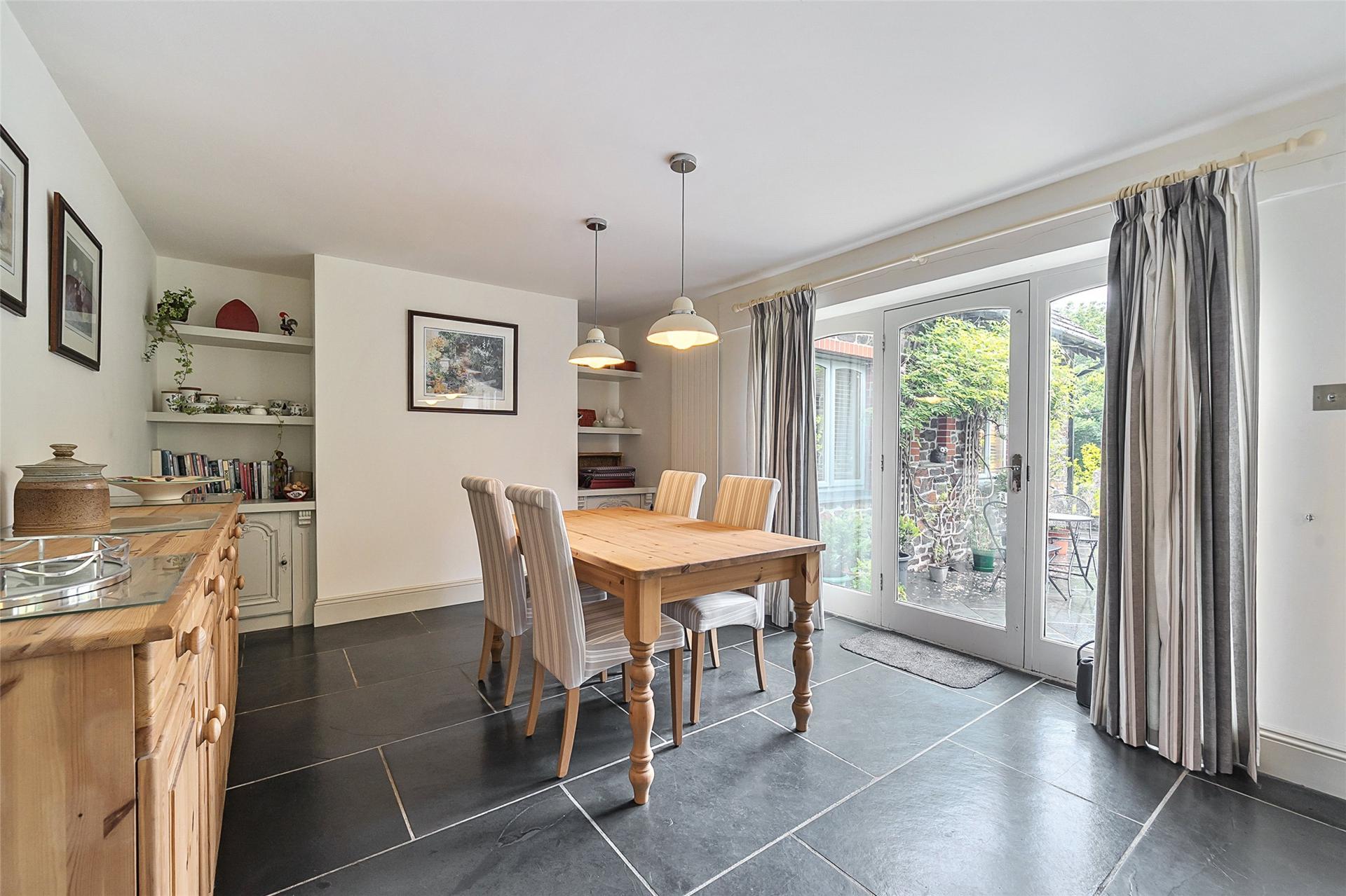 The second residence, accessed via its own private entrance, is equally generous in scale and beautifully appointed. The main reception room measures 22’ x 21’ and features a central glass-topped wine cellar as its unique centrepiece, alongside a wood-burning stove. This leads through to a spectacular garden room with an atrium-style glazed roof and concertina doors opening onto the westerly gardens. A compact hidden kitchen and pizza oven make this a perfect space for entertaining. The large L-shaped kitchen/dining room is fitted with a range cooker and opens to a private patio. A utility room and WC complete the ground floor. Upstairs are two spacious en suite bedrooms.