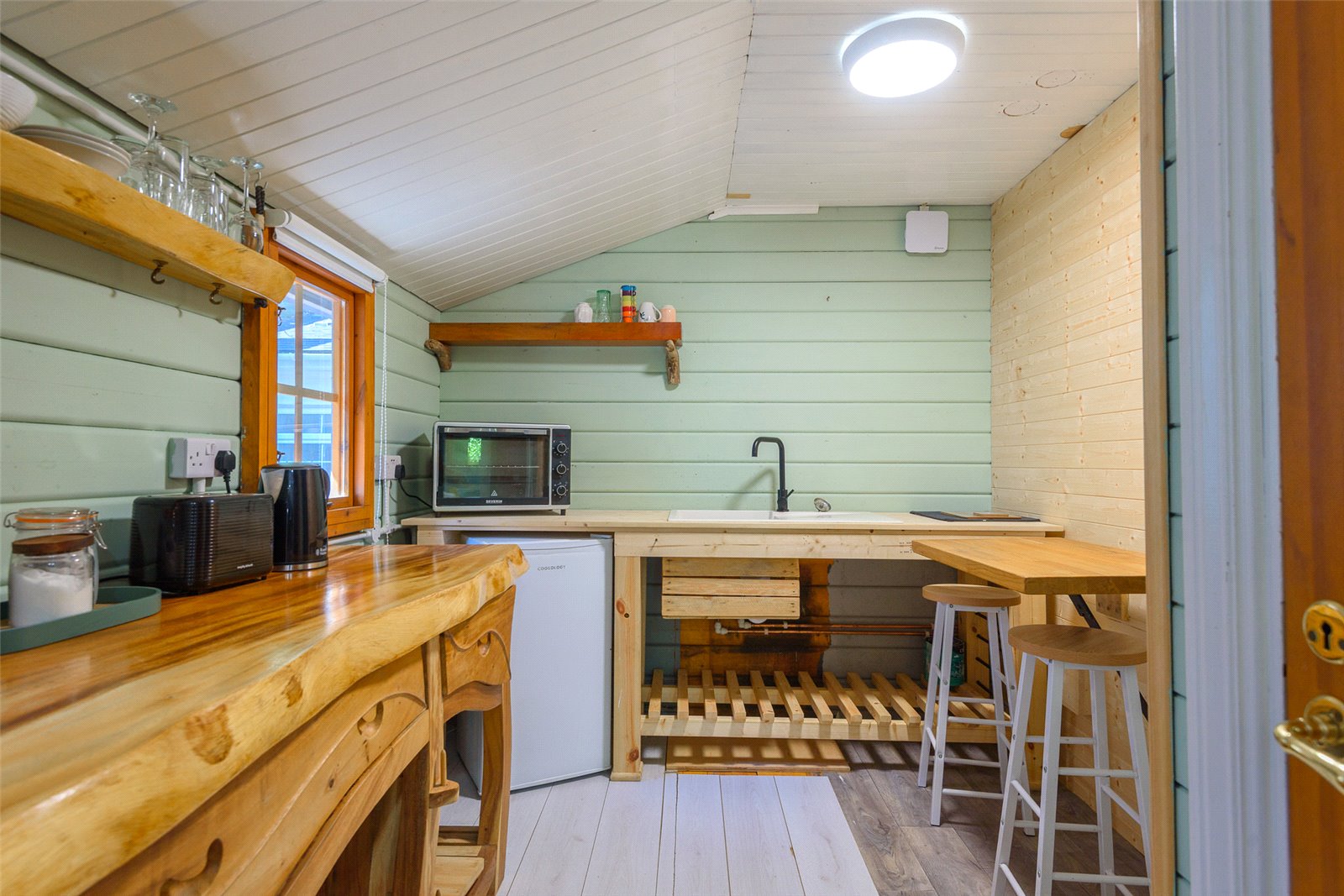 Set within the grounds yet enjoying a sense of privacy, the detached timber cabin offers excellent potential as a self-contained holiday let, guest accommodation, or even a peaceful home office or artist’s retreat.Thoughtfully laid out for compact yet comfortable living, the cabin comprises a welcoming bedroom area, ideal for short stays or longer breaks. The well designed kitchen includes an integrated electric hob, sink with drainer, extractor fan, and a convenient fold-down breakfast bar, making efficient use of the space while still providing everything needed for self-catering.A modern shower room completes the interior, fitted with a shower cubicle, WC, and wash basin, offering a fully functional and independent living arrangement.With its own outlook over the grounds and separate access, this charming cabin presents a fantastic opportunity to generate supplementary income through holiday letting or serve as a comfortable annexe for extended family or visitors.