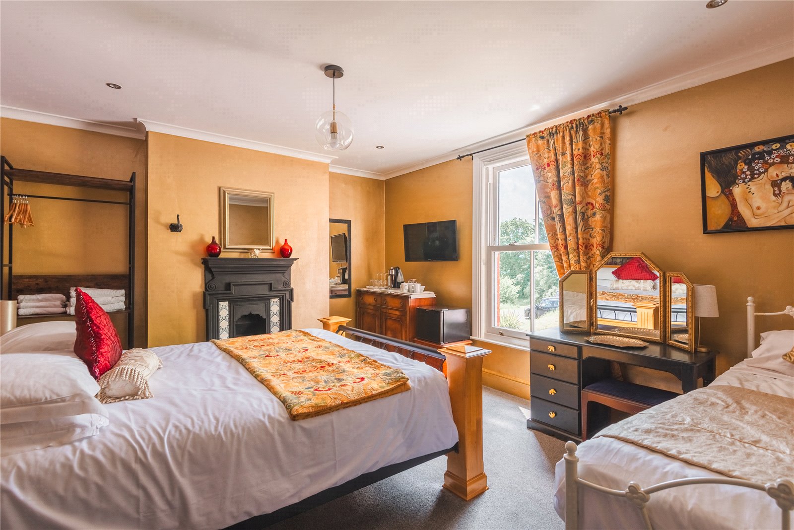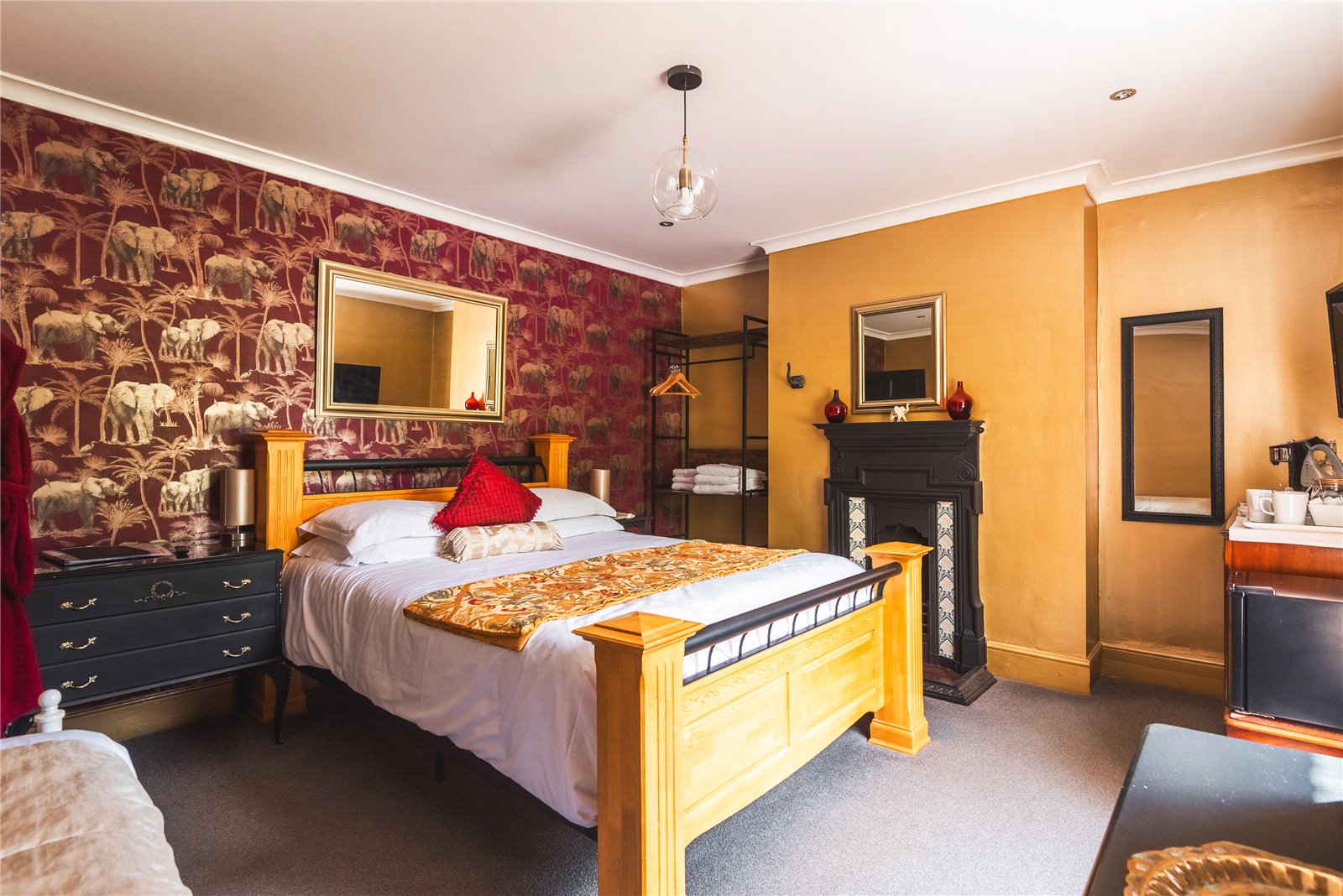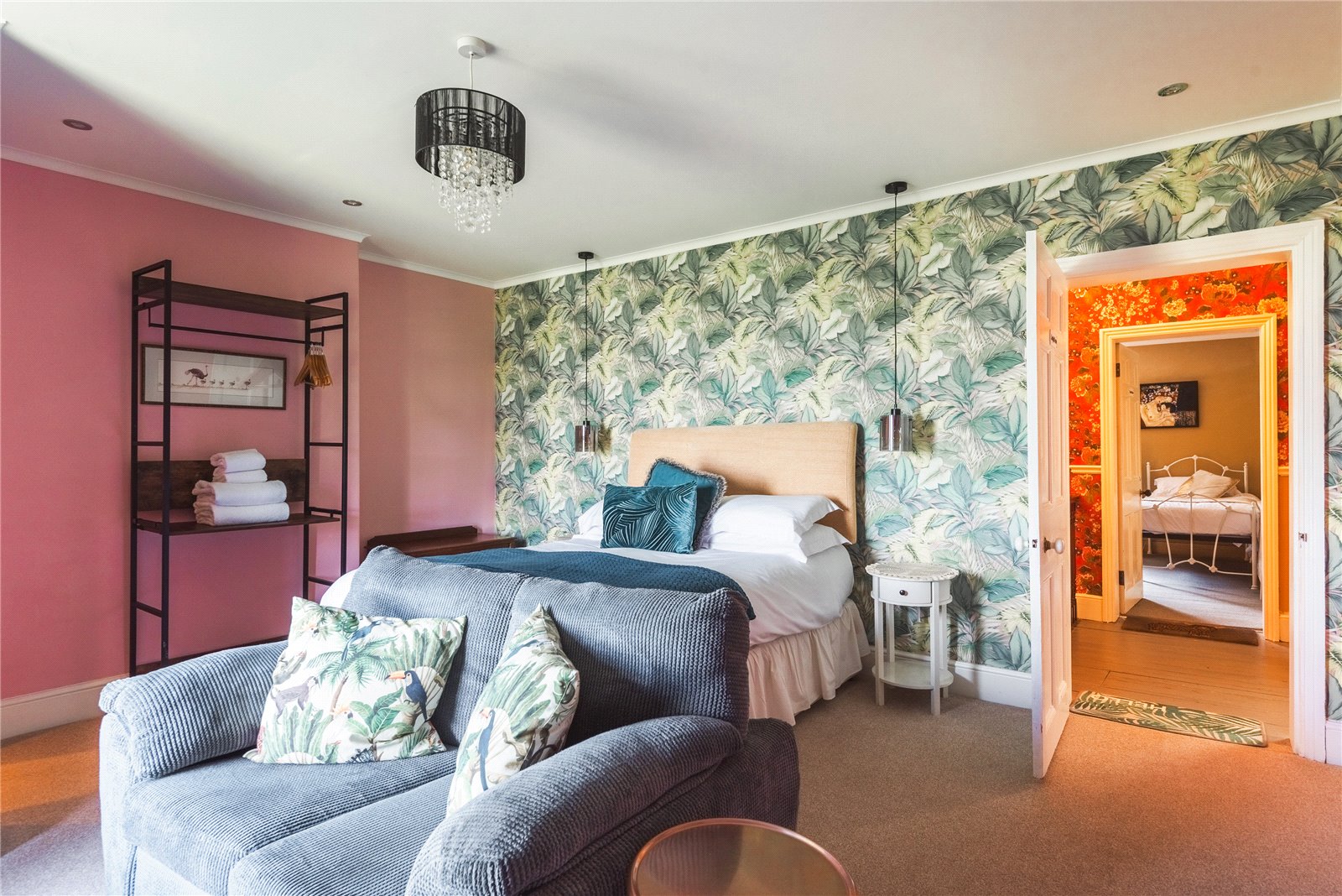 Ascending to the first floor, the landing space, adorned with a chandelier, provides access to six magnificent double bedrooms and the integral two-bedroom apartment. The grand main bedroom offers superb views through the front and side sash windows. It features an immaculate en suite Jack and Jill family bathroom, equipped with a luxurious roll-top bath with a view, a walk-in rain shower, a relaxing sauna, a WC, and a vanity unit. The remaining five double bedrooms on this floor each have their unique decor and charm. Bedrooms three and six are especially popular with B&B guests, as they each have en suite shower rooms.