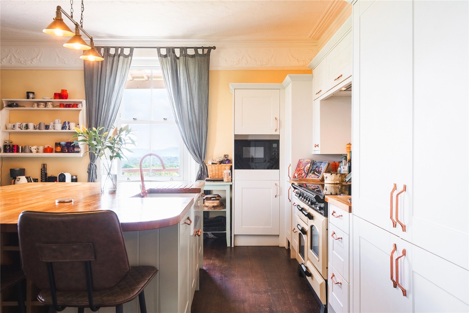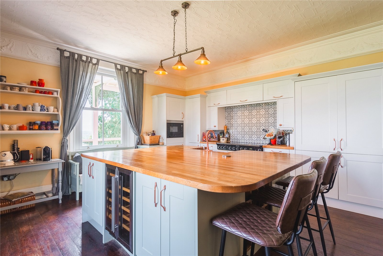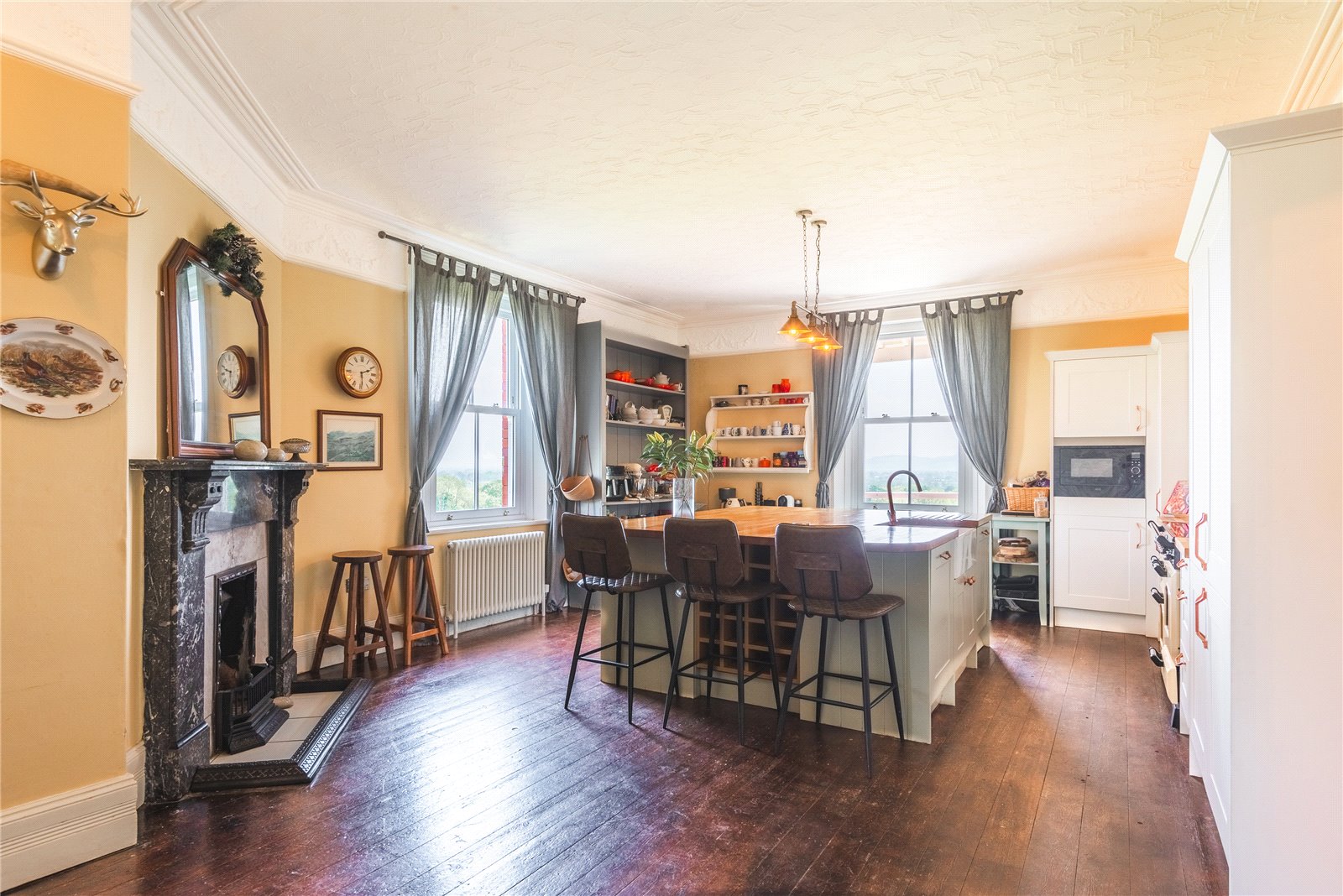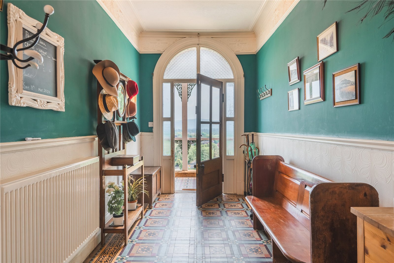 Upon entering the grand central hall of Penyvoel Hall, you are immediately struck by its period charm, highlighted by the beautiful original tiled floor and exquisite coving above. To the right, you find the open-plan kitchen and dining room, a perfect blend of functionality and style. The kitchen is designed around a large central island, featuring a beautiful Belfast sink with brass taps. It boasts a range cooker, integrated fridge freezer, integrated microwave, and elegant white wooden units topped with a worktop. The dining area provides ample space for a large table and chairs, enhanced by two back-to-back feature fireplaces that add a historical touch to this sociable space.