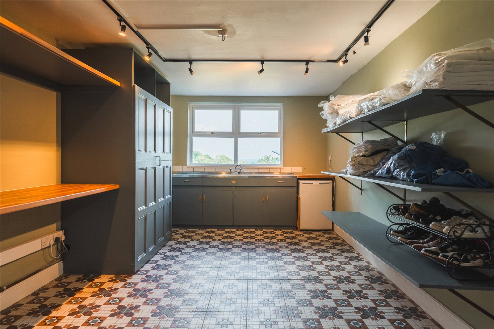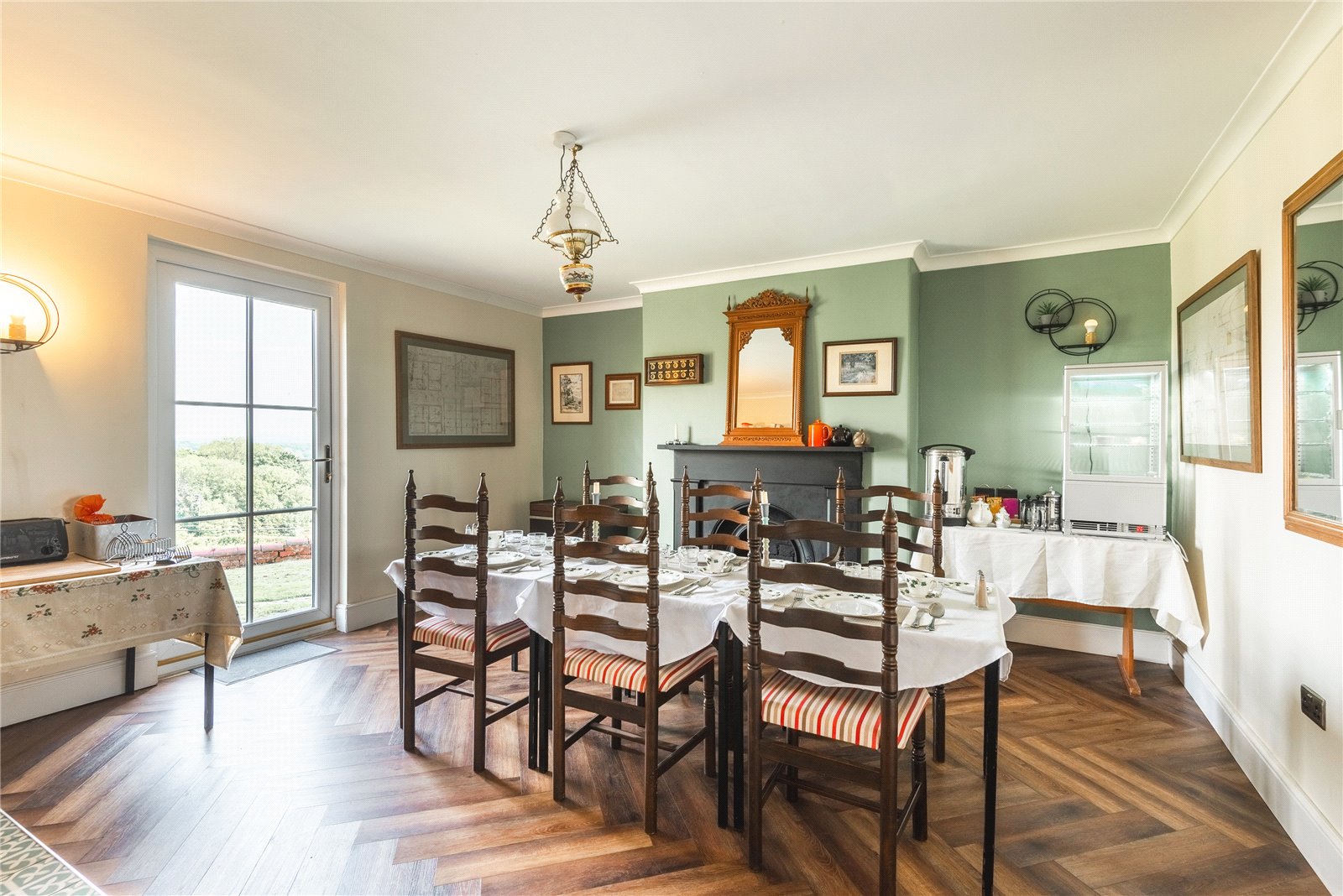 On the opposite side of the ground floor, a symmetrical living space offers a dual aspect, flooding the room with natural light. Double doors on the side open out to the side veranda, creating a seamless connection between indoor and outdoor living. Further down the grand entrance hall, two additional reception rooms provide even more space. One serves as a cozy snug with a beautiful open fire and rustic floorboards, while the other is a light and airy breakfast room currently used by B&B guests in the mornings. The rear of the ground floor offers further accommodation, including a spacious laundry room, utility area with a boiler room, pantry space, and a WC. Additionally, two stores and a large workshop area provide further potential to expand the already extensive living space.
