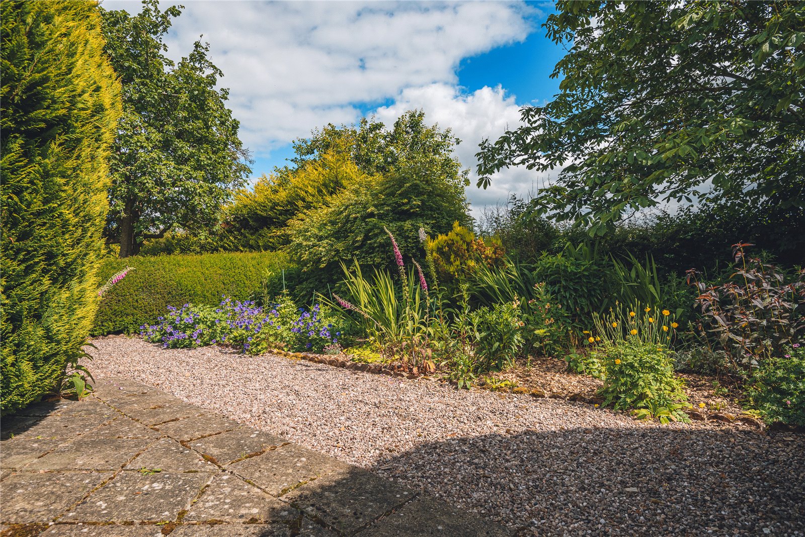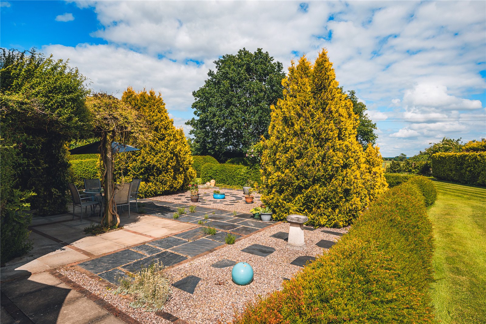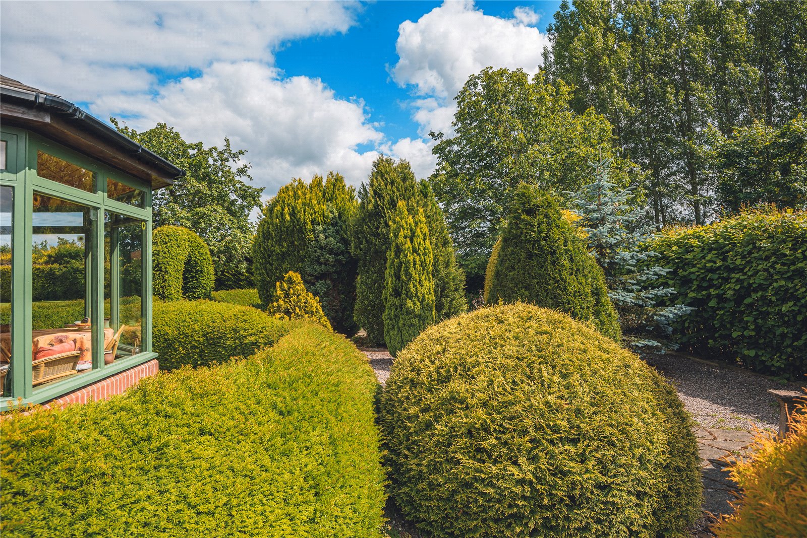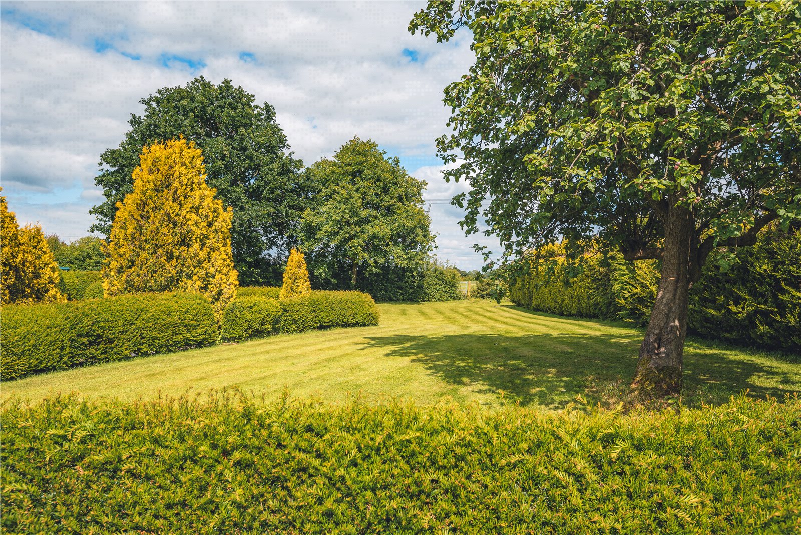 The sweeping private driveway leads down to the house, ending in a convenient turning circle. To the left of the house, there is ample parking space for several vehicles, providing access to the detached double garage. The garage offers additional storage space and potential for various uses such as a studio, workshop, home gym, or even conversion into further accommodation, subject to the necessary consents.The secluded gardens surrounding the house consist mainly of level lawns, thoughtfully designed with different areas separated by well-established hedges. The gardens feature a variety of trees, shrubs, and well-stocked beds and borders, as well as two sheds and a useful greenhouse. Gravel paths and patio walkways meander around the house, leading to a seating area perfect for alfresco dining and to raised beds for keen gardeners. Solar panels are located on the far side of the garden.