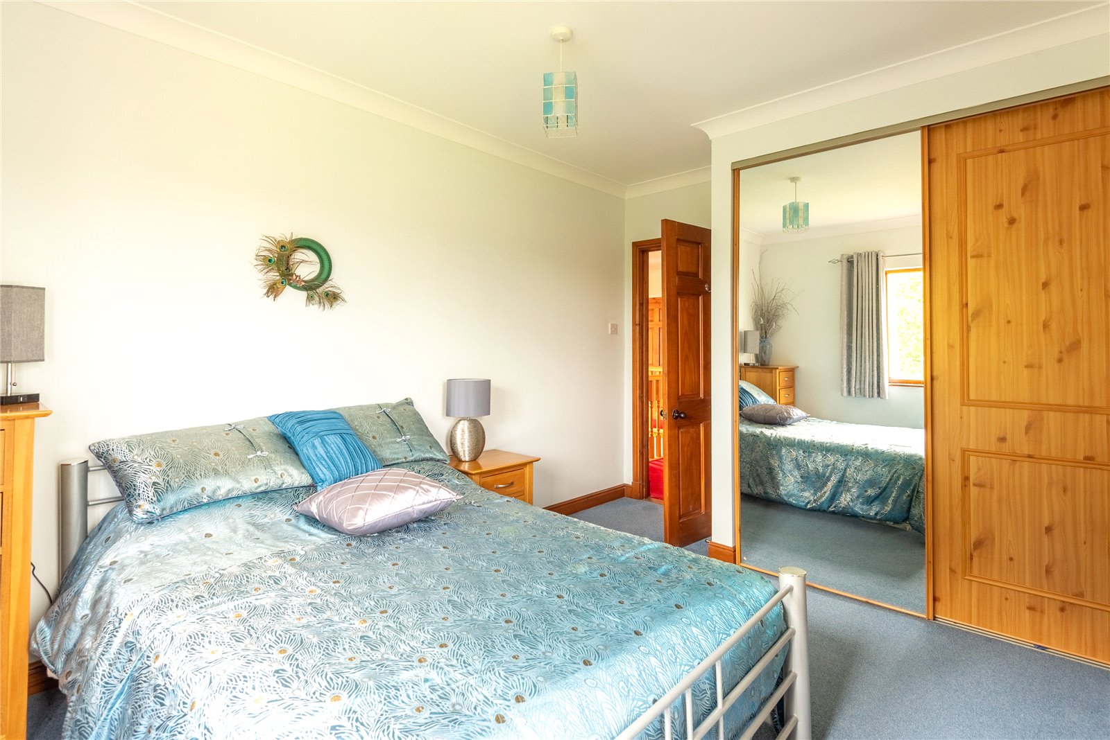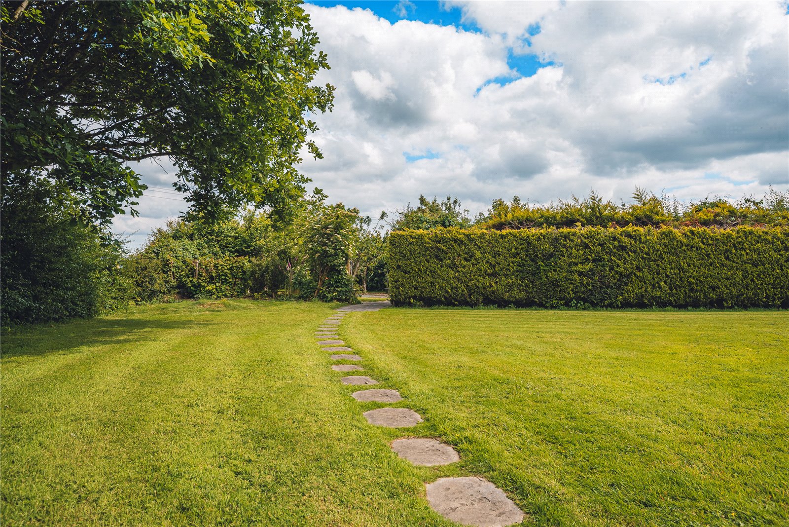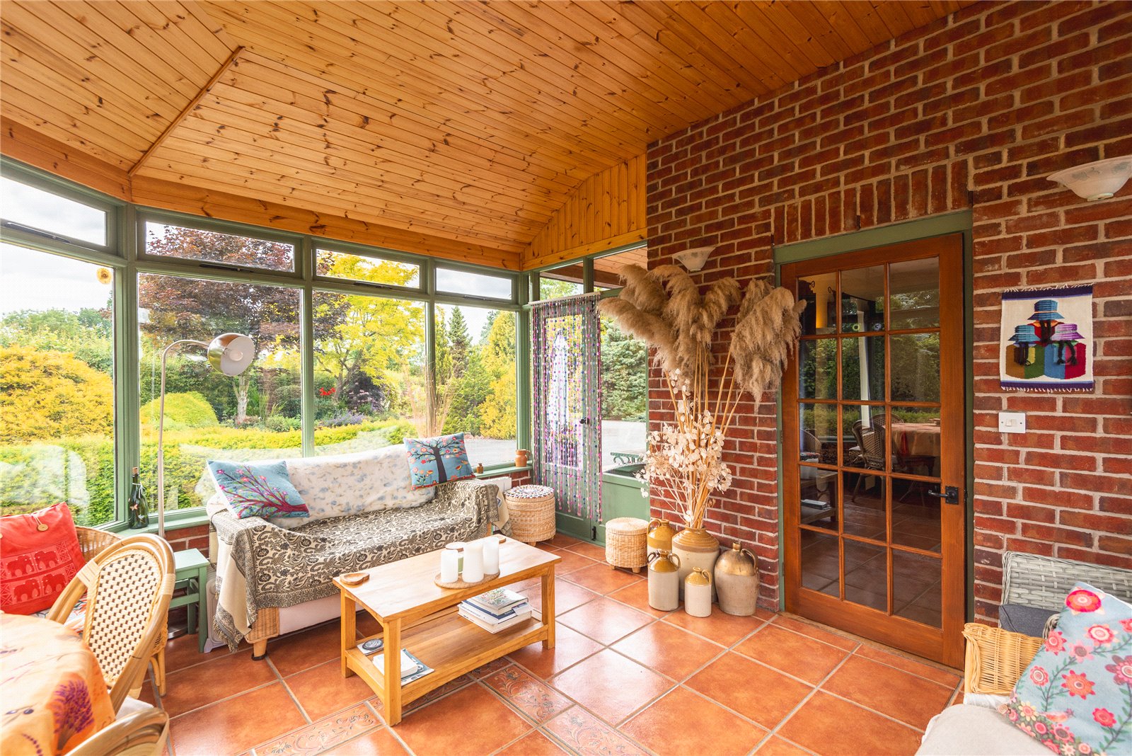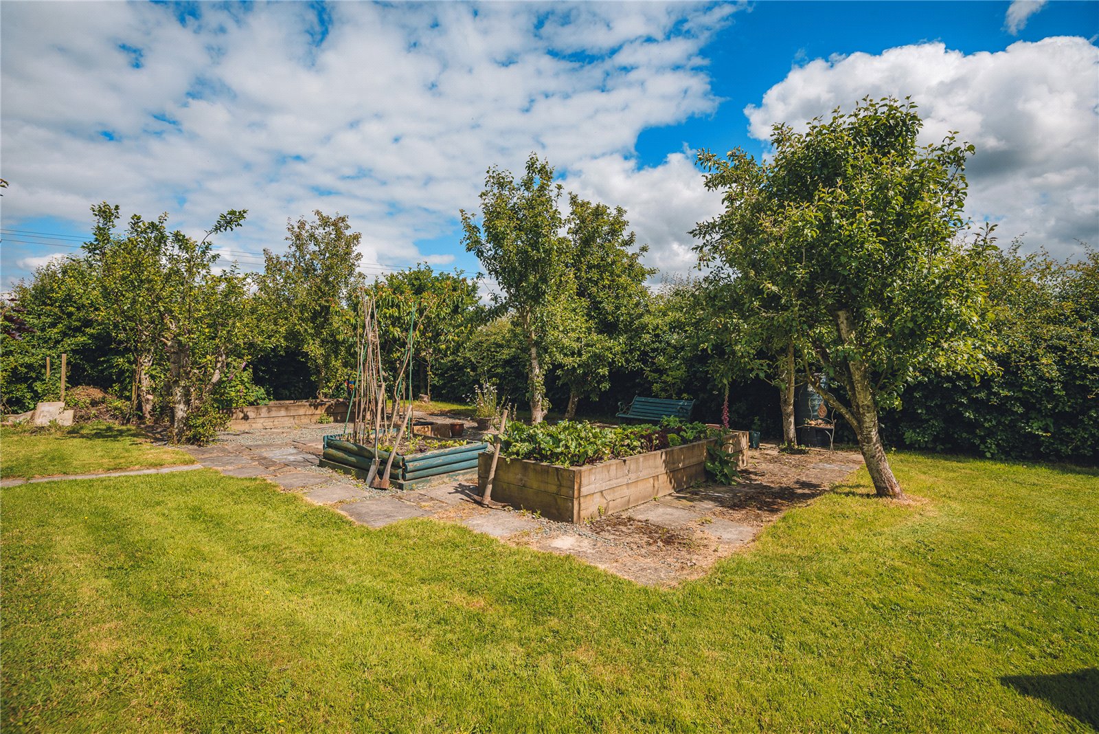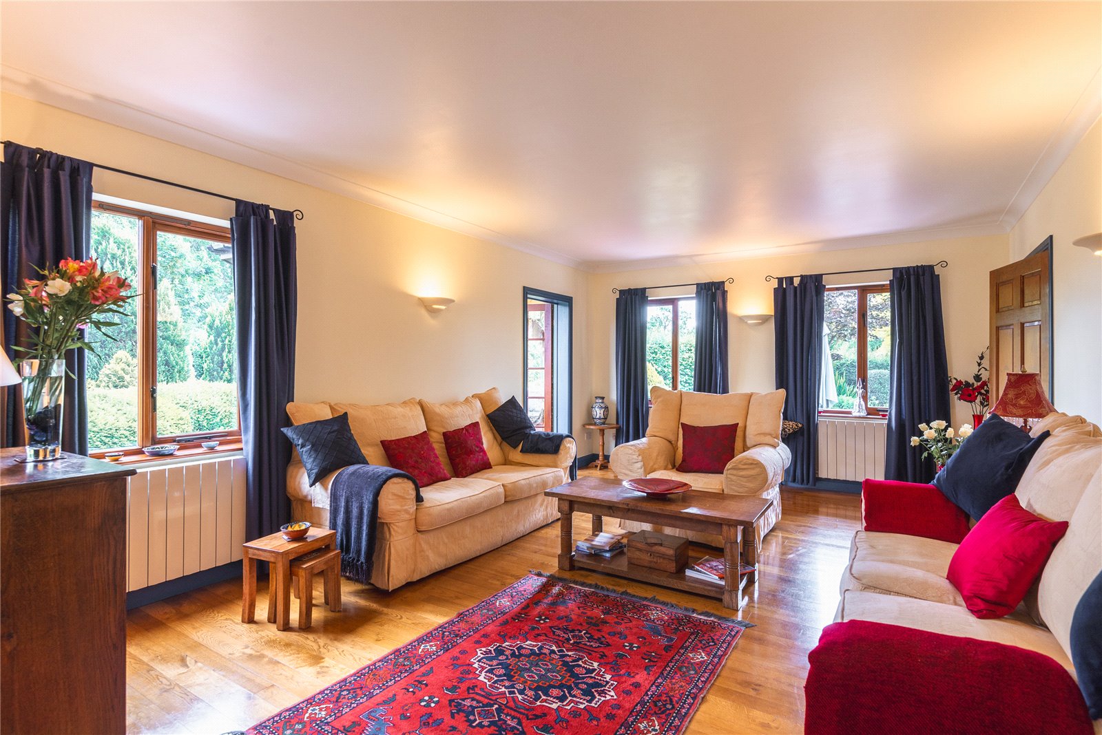 The sweeping private driveway leads down to the house, ending in a convenient turning circle. To the left of the house, there is ample parking space for several vehicles, providing access to the detached double garage. The garage offers additional storage space and potential for various uses such as a studio, workshop, home gym, or even conversion into further accommodation, subject to the necessary consents.The secluded gardens surrounding the house consist mainly of level lawns, thoughtfully designed with different areas separated by well-established hedges. The gardens feature a variety of trees, shrubs, and well-stocked beds and borders, as well as two sheds and a useful greenhouse. Gravel paths and patio walkways meander around the house, leading to a seating area perfect for alfresco dining and to raised beds for keen gardeners. Solar panels are located on the far side of the garden.