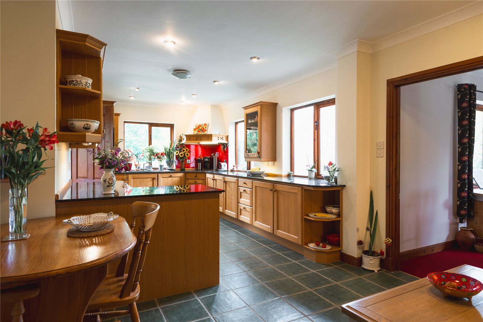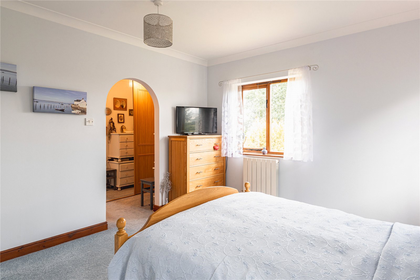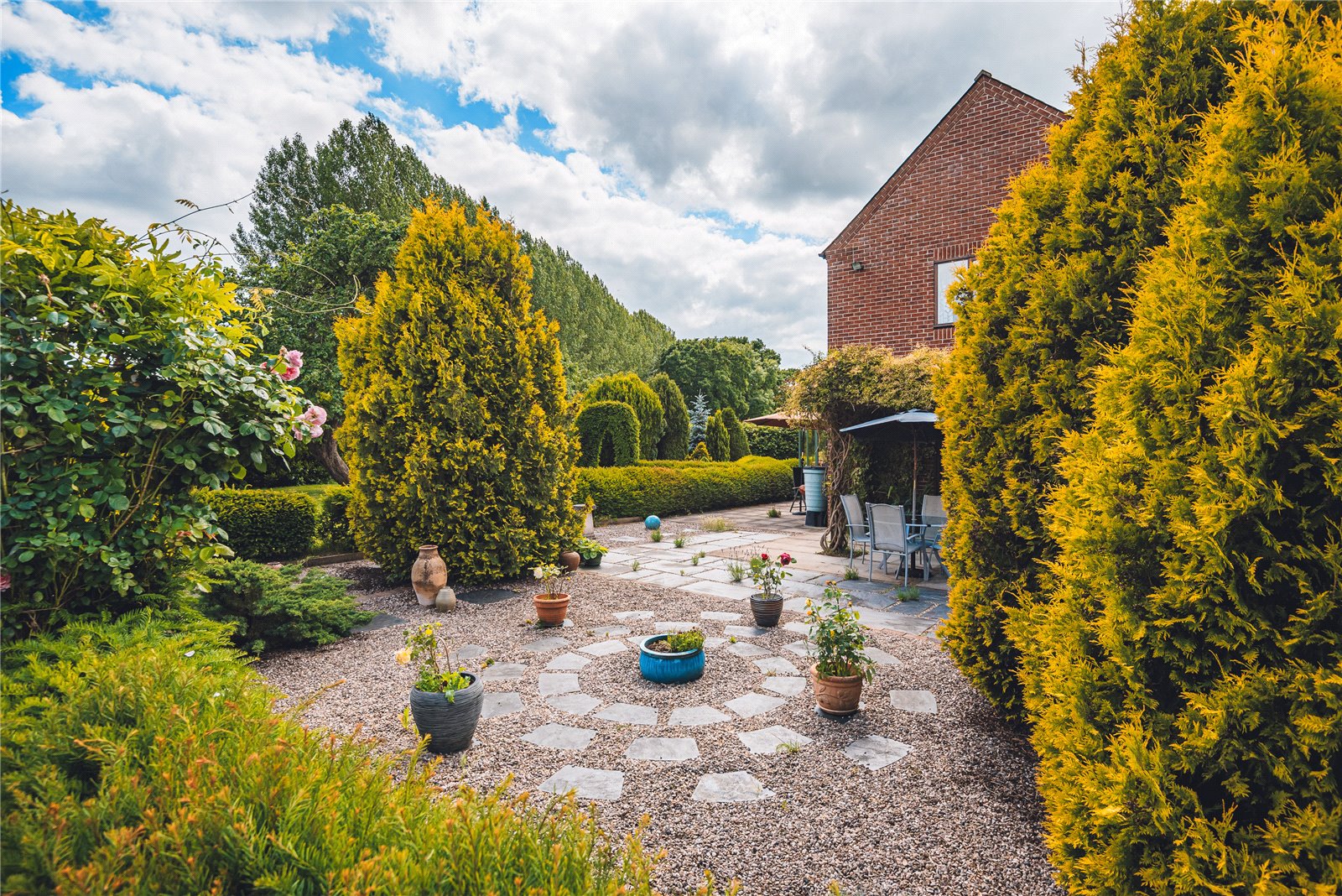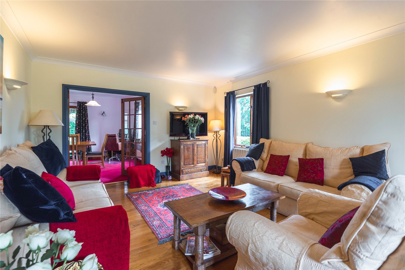 The sweeping private driveway leads down to the house, ending in a convenient turning circle. To the left of the house, there is ample parking space for several vehicles, providing access to the detached double garage. The garage offers additional storage space and potential for various uses such as a studio, workshop, home gym, or even conversion into further accommodation, subject to the necessary consents.The secluded gardens surrounding the house consist mainly of level lawns, thoughtfully designed with different areas separated by well-established hedges. The gardens feature a variety of trees, shrubs, and well-stocked beds and borders, as well as two sheds and a useful greenhouse. Gravel paths and patio walkways meander around the house, leading to a seating area perfect for alfresco dining and to raised beds for keen gardeners. Solar panels are located on the far side of the garden.