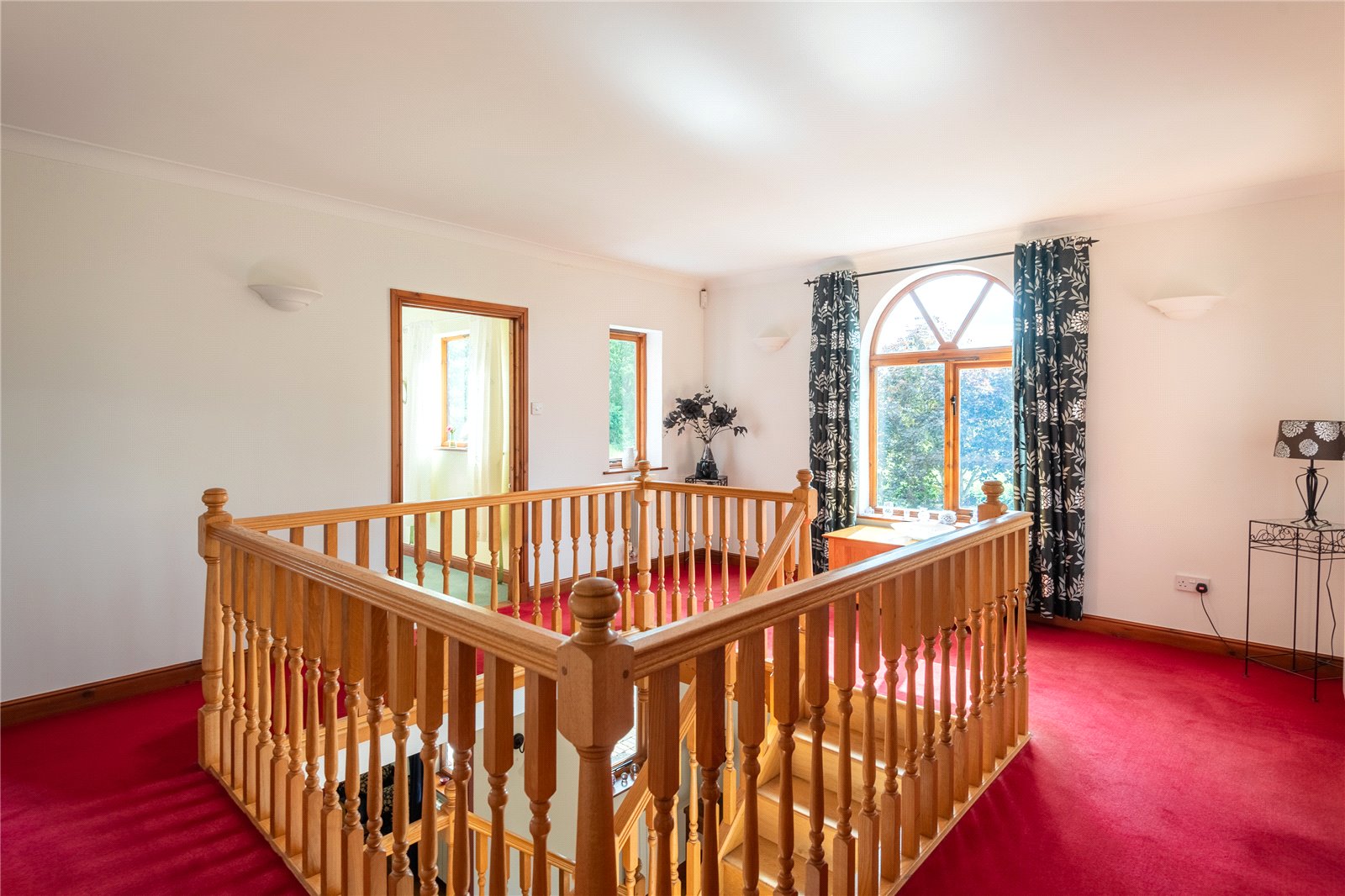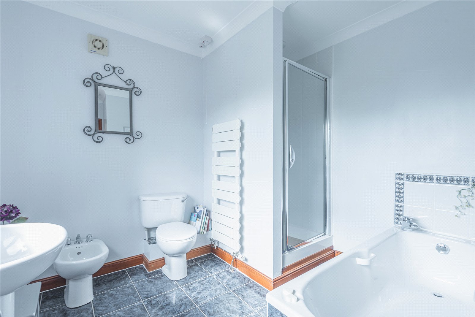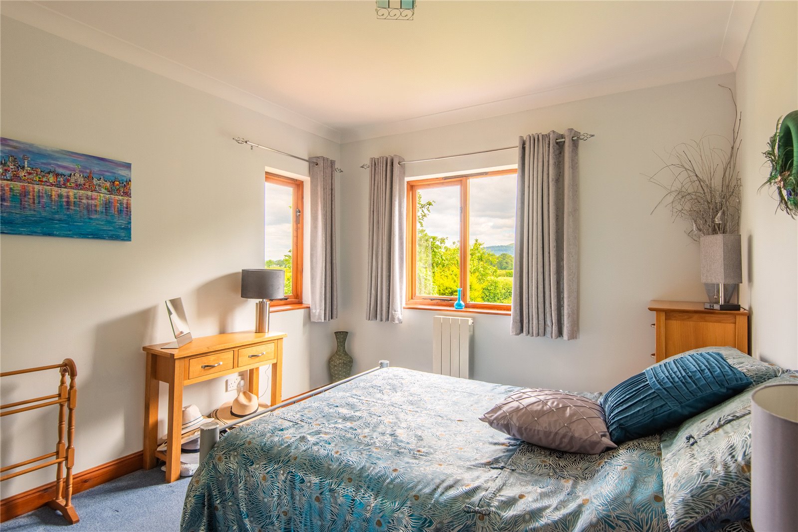 Stairs rise from the entrance hall to the first floor galleried landing, where a beautiful window showcases the stunning countryside views. There are four spacious bedrooms, each with fantastic views. The master bedroom features a dressing area with built-in wardrobes and a luxurious en-suite with a bath, shower cubicle, Jack and Jill wash basins, WC, and bidet. Two additional double bedrooms also have built-in wardrobes. The fourth bedroom is currently used as a single room/office, equipped with a built-in desk and shelving unit. Completing the accommodation is the family bathroom, which includes tiled flooring, a bath, shower cubicle, wash basin, WC, and bidet.