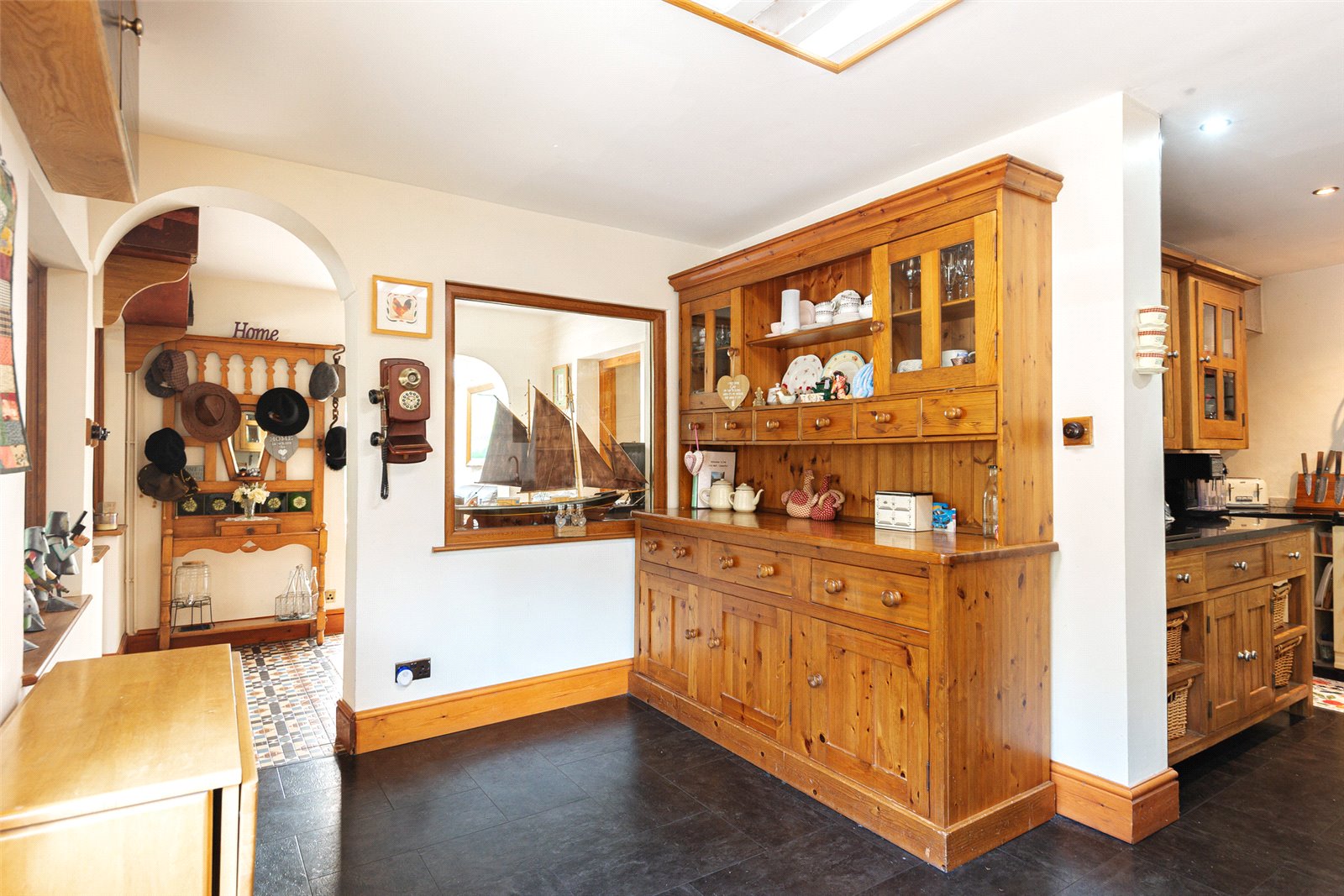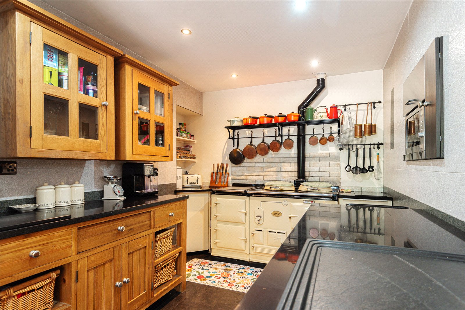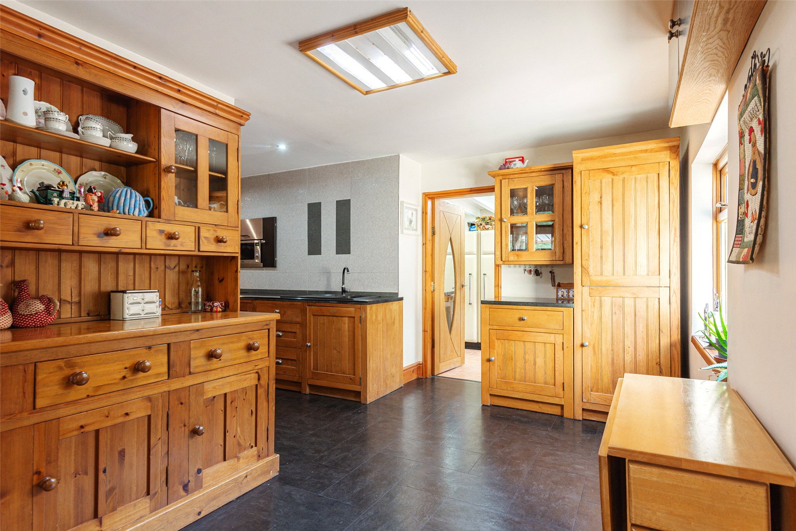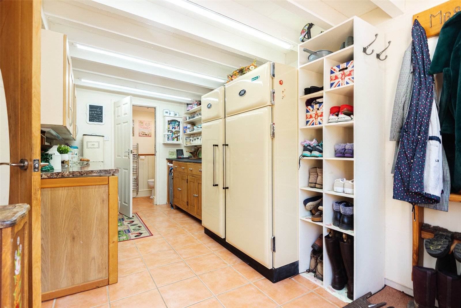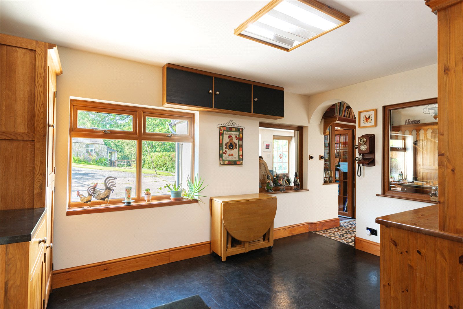 To the right, you’re drawn into the heart of the home: a warm and well-proportioned L-shaped kitchen. A traditional Aga takes centre stage, offering both charm and warmth, while a thoughtful layout includes stylish granite worktops, a range of wall and base units, twin induction hobs, a sink and drainer, and an inset niche for a microwave. Whether preparing a family roast or enjoying a peaceful morning coffee, this kitchen combines cottage charm with day-to-day convenience.Just beyond the kitchen lies a generously sized utility room, essential for country living. This practical space houses a large American style fridge freezer, laundry appliances, and offers extra storage for coats, boots, and pantry items. A ground floor shower room with WC sits to the rear of the utility, offering convenient facilities for guests or after time spent outdoors.