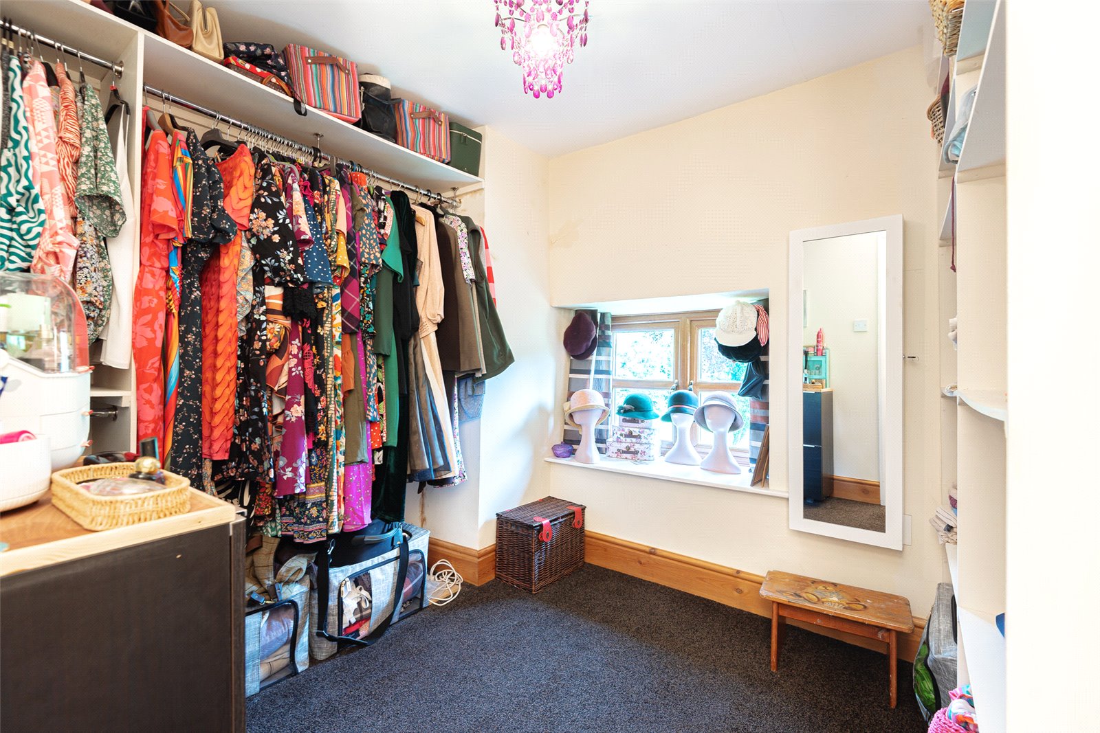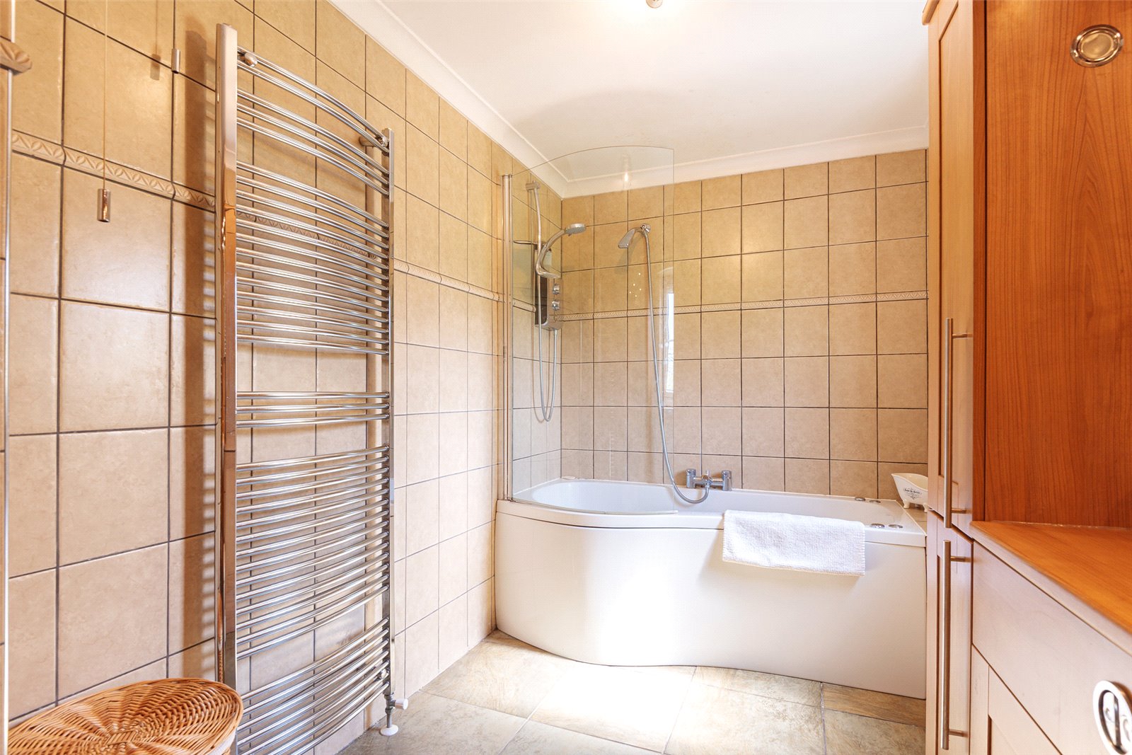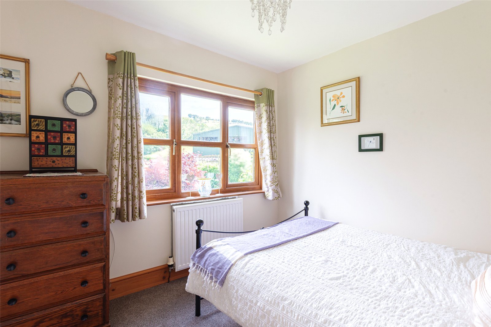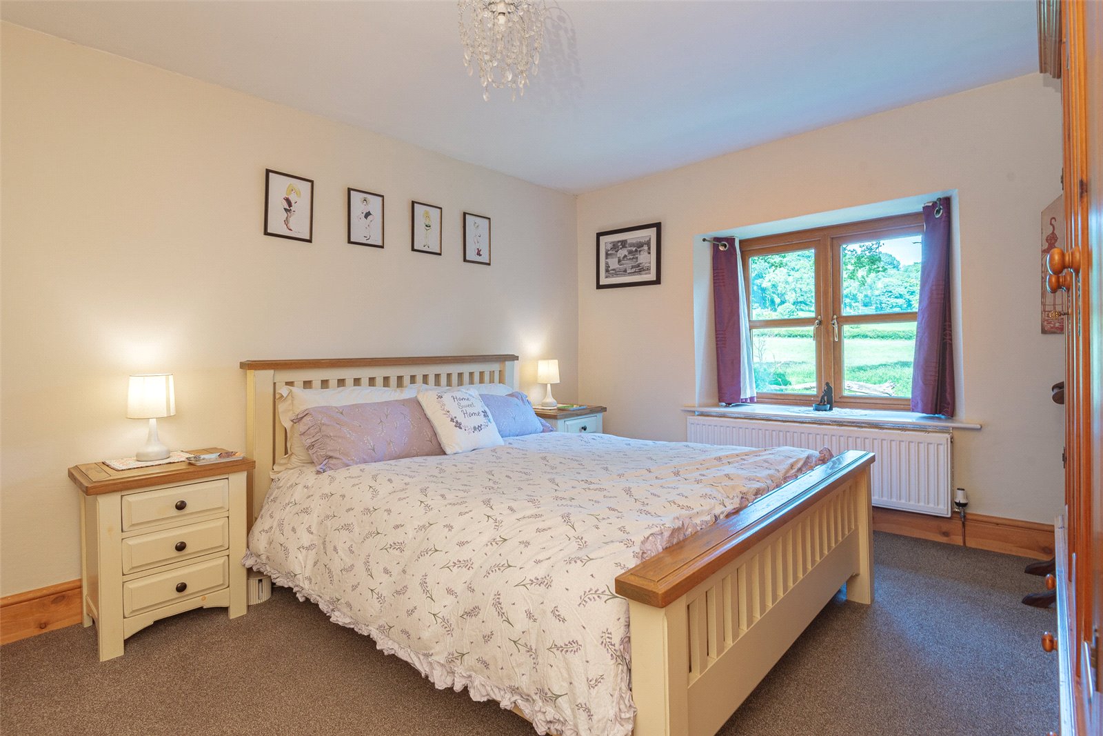 A staircase from the living room leads to the first floor, where you’ll find four bedrooms and the family bathroom. Each of the bedrooms enjoys delightful views over the River Banwy, a truly special backdrop to wake up to each day.Three of the bedrooms are well-proportioned doubles, perfect for family living or visiting guests. The fourth bedroom is a versatile single room, currently used as a dressing room, though it could easily serve as a nursery, hobby room, or additional study/office depending on your needs.The family bathroom features a bathtub with an overhead shower and electric shower, a WC, and a sink set within a generous vanity unit offering useful storage. The space is finished with beige tiled flooring and walls, inset lighting, and a large wall-mounted mirror, creating a calm and stylish space for everyday use.