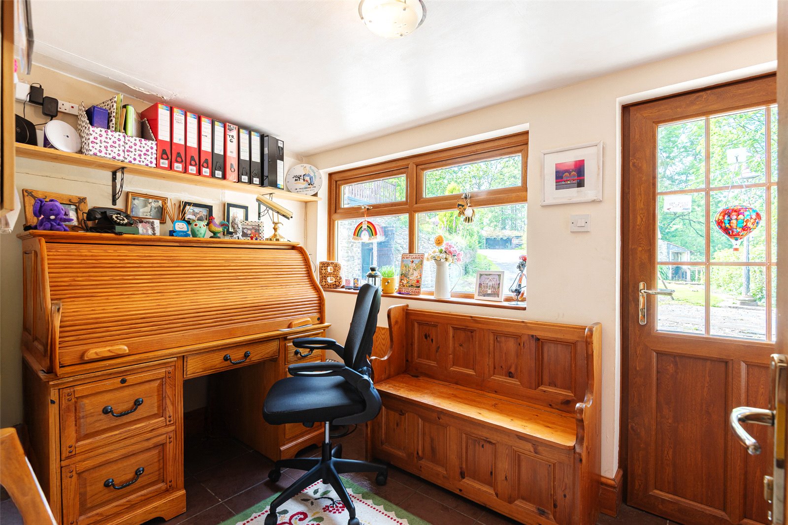 Approached via a quiet country lane, The Old Mill immediately makes an impression. A sweeping driveway leads through neatly kept lawns and mature trees, giving a graceful sense of arrival. A concrete parking area provides ample space for several vehicles, setting the tone for a home that balances natural beauty, heritage charm, and everyday practicality.Your journey into the home begins at the charming front porch—a hallmark of traditional countryside living. This inviting and functional space is ideal for kicking off muddy boots after riverside walks, drying off the dog, or simply taking a moment to enjoy the view. The current owners have creatively adapted it into a home office, benefitting from natural light and a lovely aspect though the space remains highly flexible for family life.