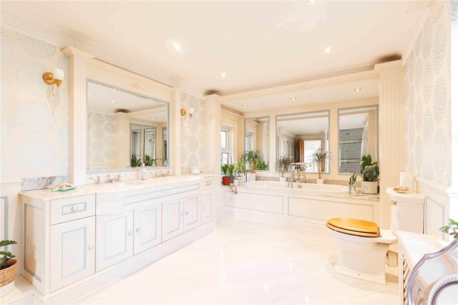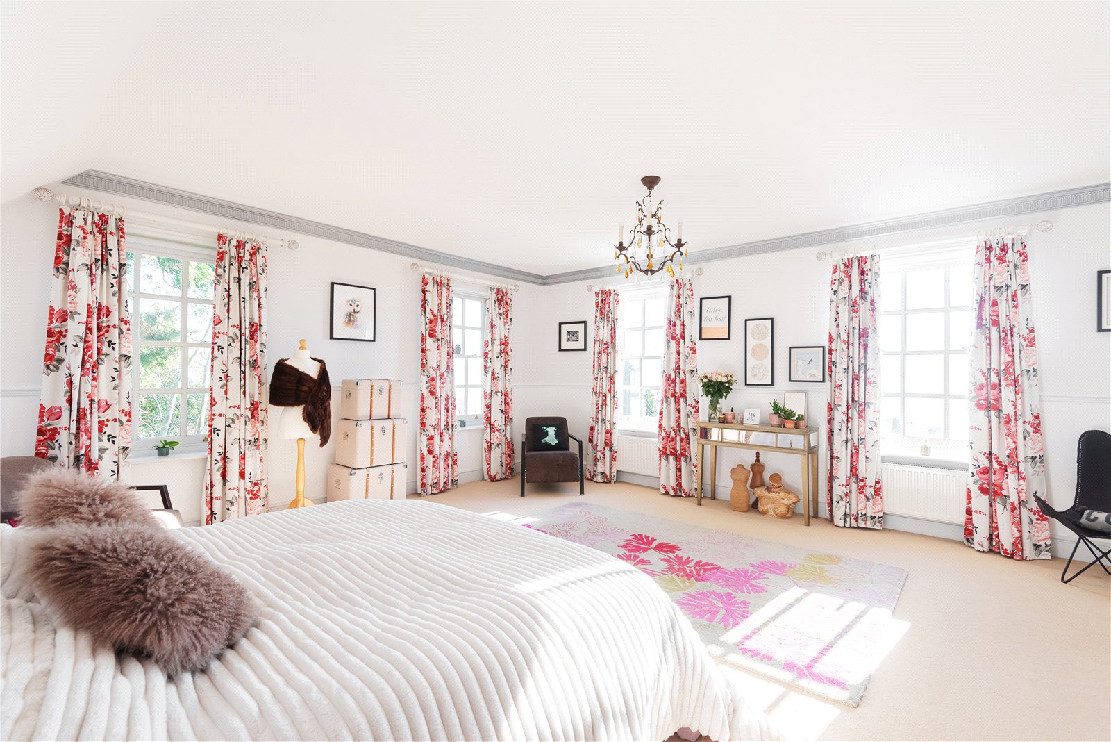 The versatile accommodation includes a colonial style garden room, sitting room, lounge, library/playroom, office, kitchen/dining room, WC, gym, boot room with steam room, utility room, jacuzzi room, four double bedrooms (including a master suite with en-suite and dressing area), and a luxurious family bathroom.