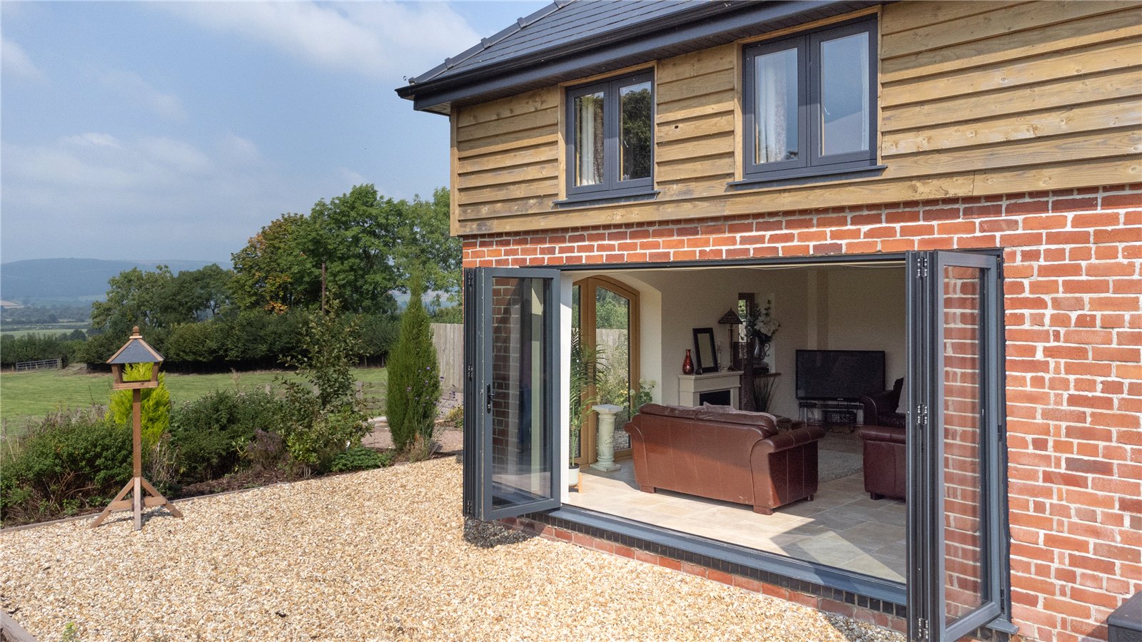As you retreat back through the entrance hall, you enter the main living room—a true showstopper. The room is bathed in natural light, thanks to its wall-length bi-fold doors that open fully to seamlessly blend the indoors with the pristine rear gardens. During the summer, these doors transform the space, inviting the tranquil countryside in. In the winter, the underfloor heating ensures the room remains warm and cozy, offering a retreat from the chill. An additional room off the living space provides versatile options, from a home office to a playroom.