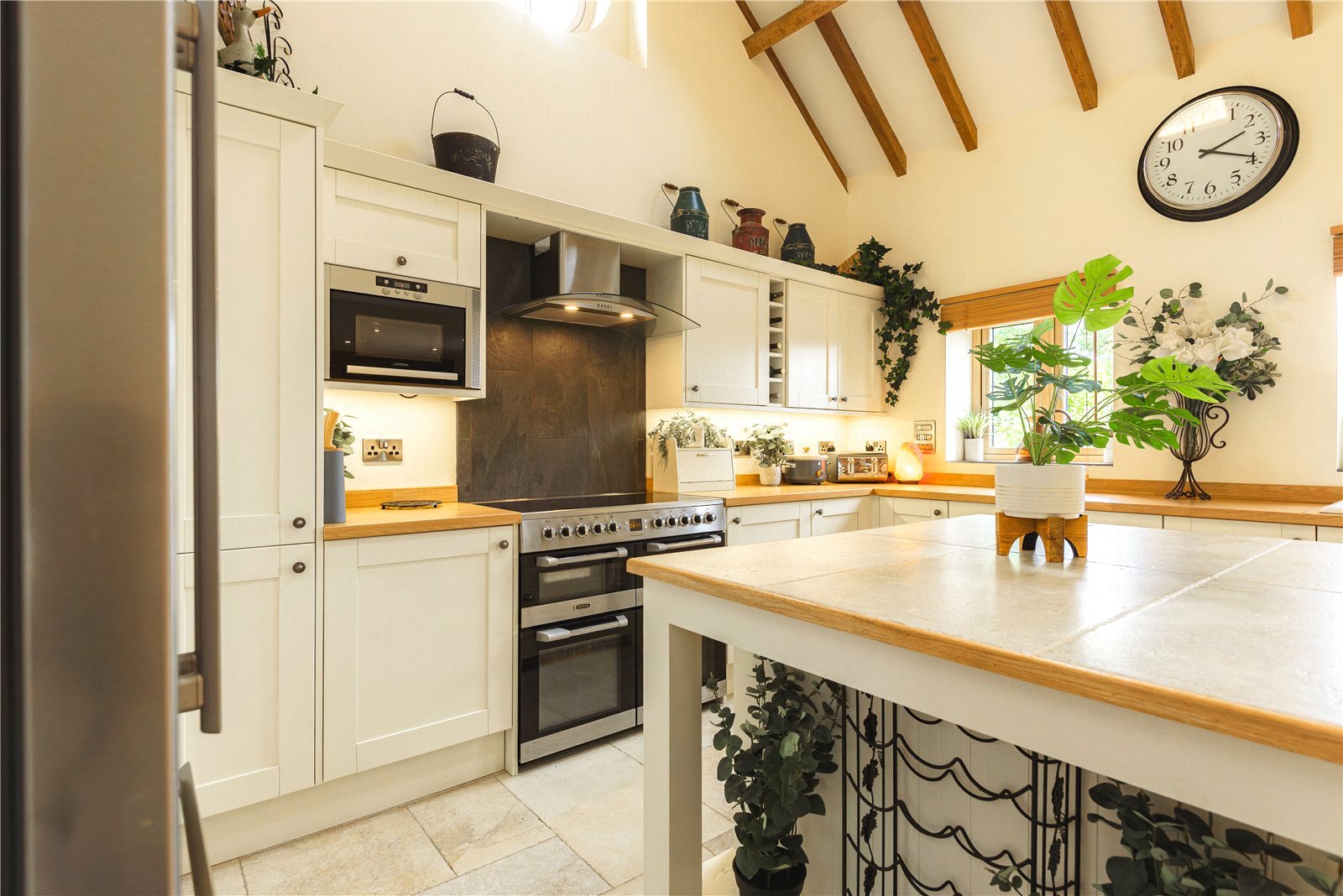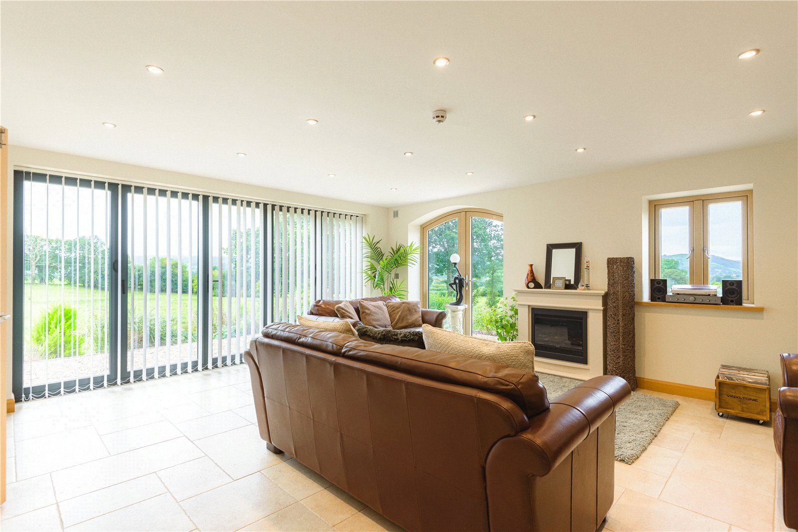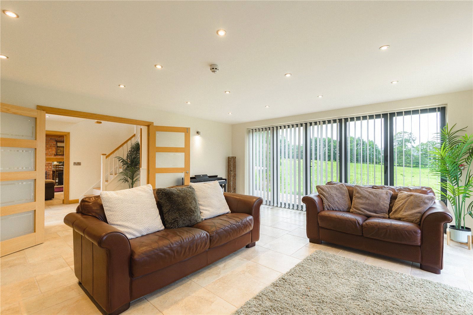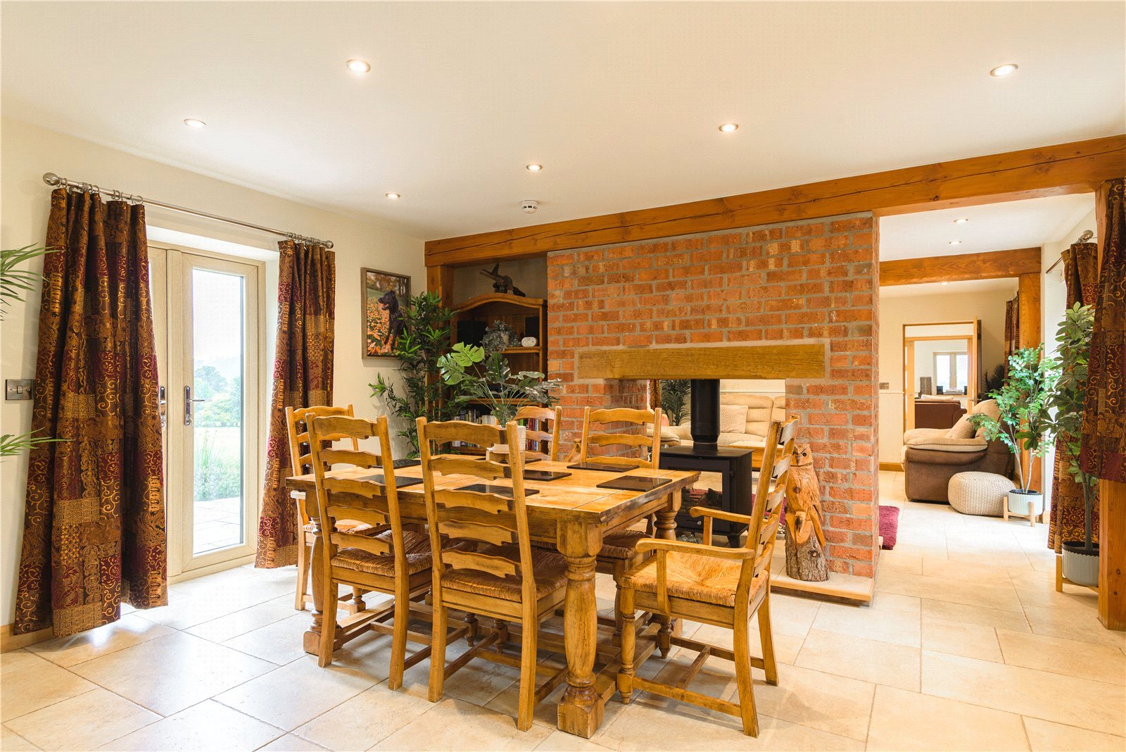 The adjoining dining area is ideal for hosting family gatherings and dinner parties. Double doors open onto the expansive rear garden, where you can savour uninterrupted views of the rolling countryside. The sitting area, framed by the impressive log burner, offers a welcoming space for family relaxation and socializing.