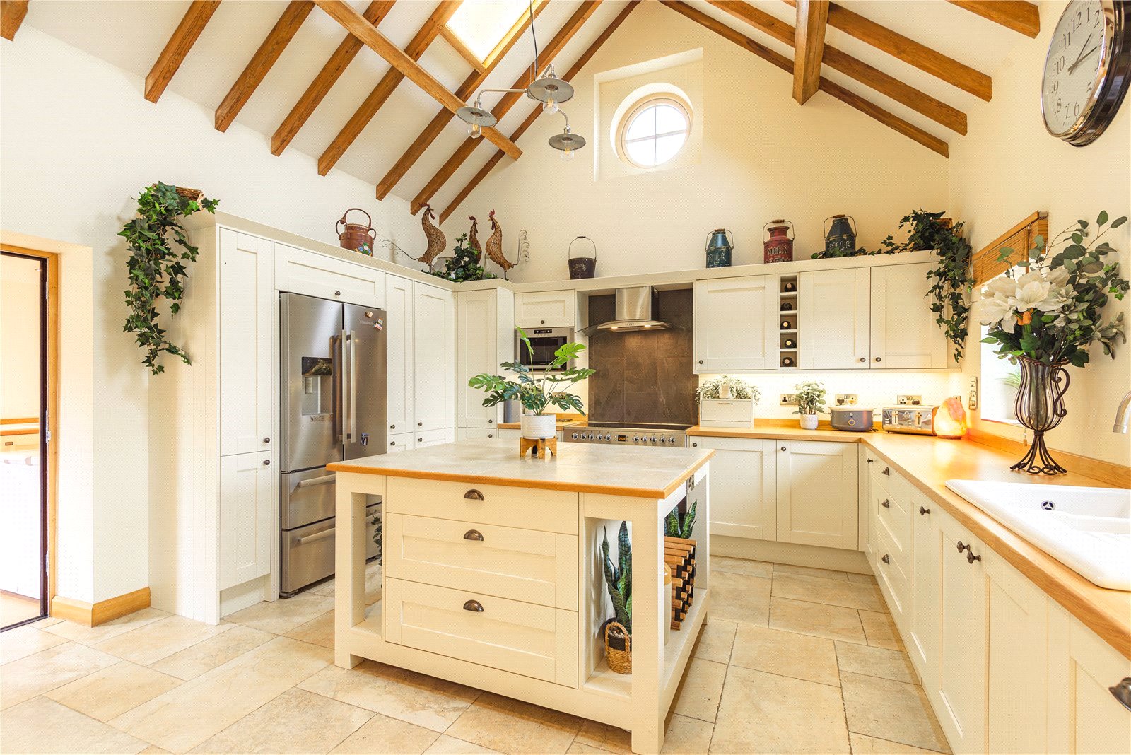 Stepping inside, the entrance hall greets you with warmth and grandeur, showcasing an eye-catching oak U-shaped staircase and a convenient WC. The attention to detail in this space immediately hints at the quality and elegance that permeates the entire property. To your left, an expansive open-plan area unfolds, designed with modern family living in mind. This heart of the home features a bespoke farmhouse-style kitchen, a spacious dining area, and a cozy sitting room. At its centre, a striking dual-aspect log burner set within a rustic brick surround creates a natural focal point.