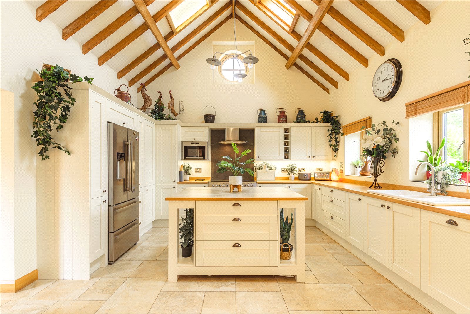 The kitchen, flooded with natural light from Velux windows set in the vaulted ceiling, is a perfect blend of style and functionality. The light cabinetry and tiled flooring complement the dark oak beams, evoking a seamless harmony between old-world charm and contemporary sophistication. With its central island, large range cooker, 1.5 Bowl inset Ceramic White Sink with Brushed Chrome Swan Neck Mixer Tap, with an American-style fridge freezer, this kitchen is not only a practical space but a delightful setting for culinary creativity. Integrated appliances like the microwave and dishwasher ensure modern convenience.