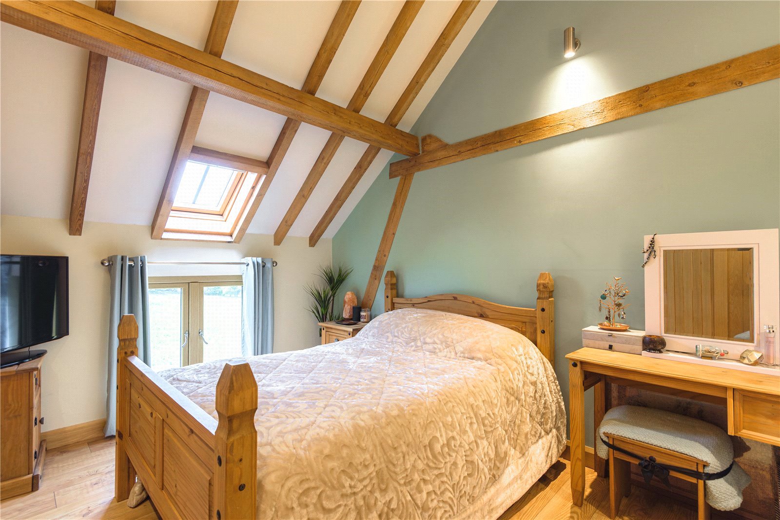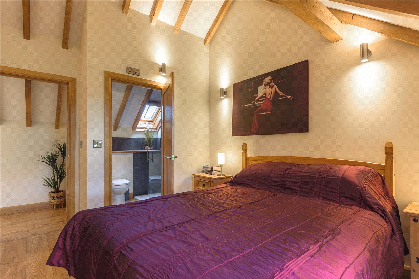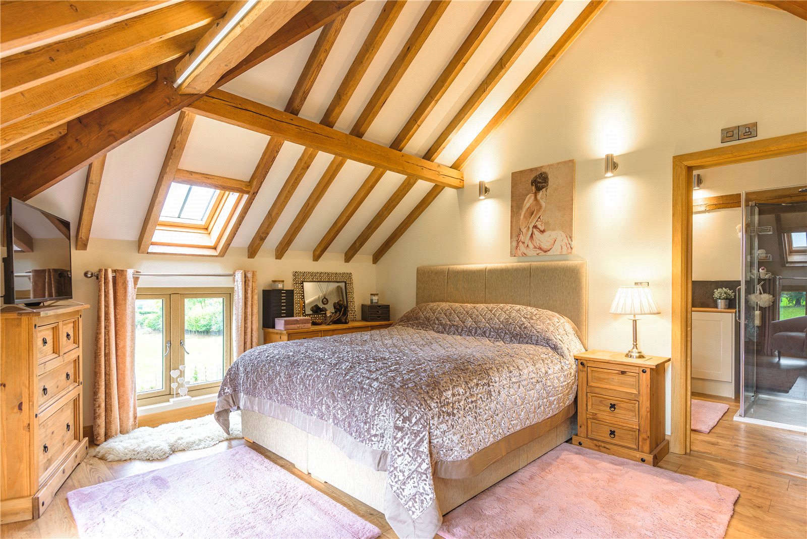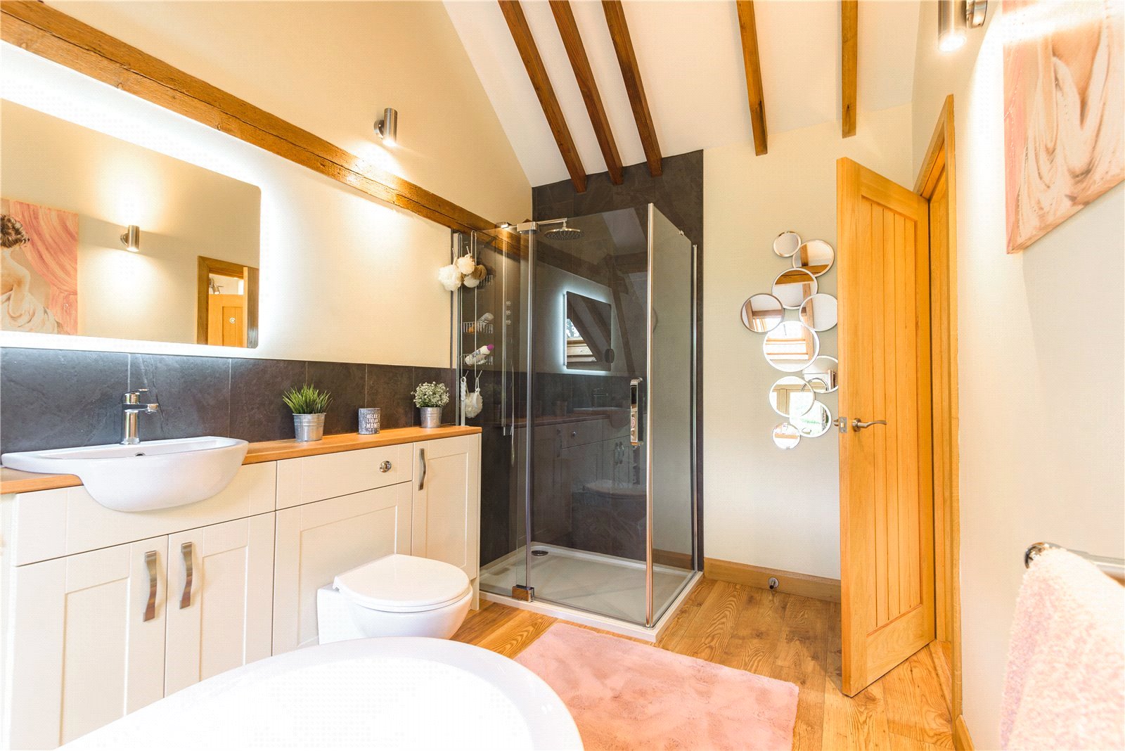 Upstairs, the first floor is home to four generously sized double bedrooms, all of which have their own luxurious en-suite bathrooms. The oak beams, a consistent feature throughout the property, add a rustic yet elegant touch. The master suite is a true sanctuary, featuring a glamorous en-suite complete with a roll-top bath perfectly positioned to take in sweeping views down the valley, a walk-in rain shower, and a wall-length vanity unit. The three additional double bedrooms are equally impressive, each boasting their own en-suite with rain-effect showers.
