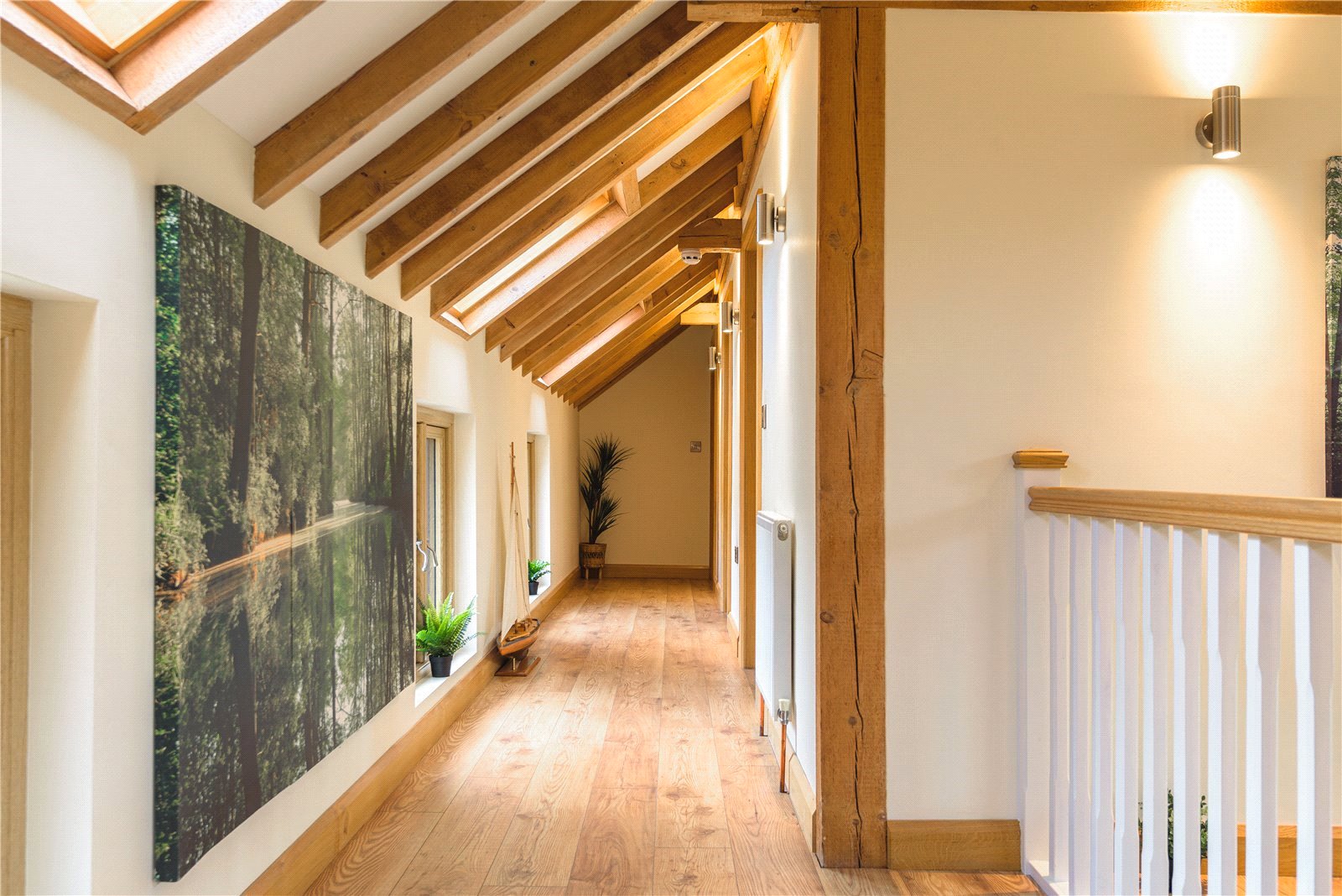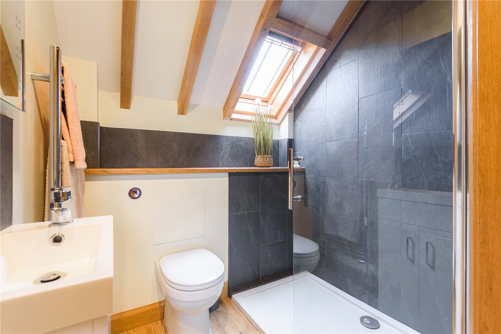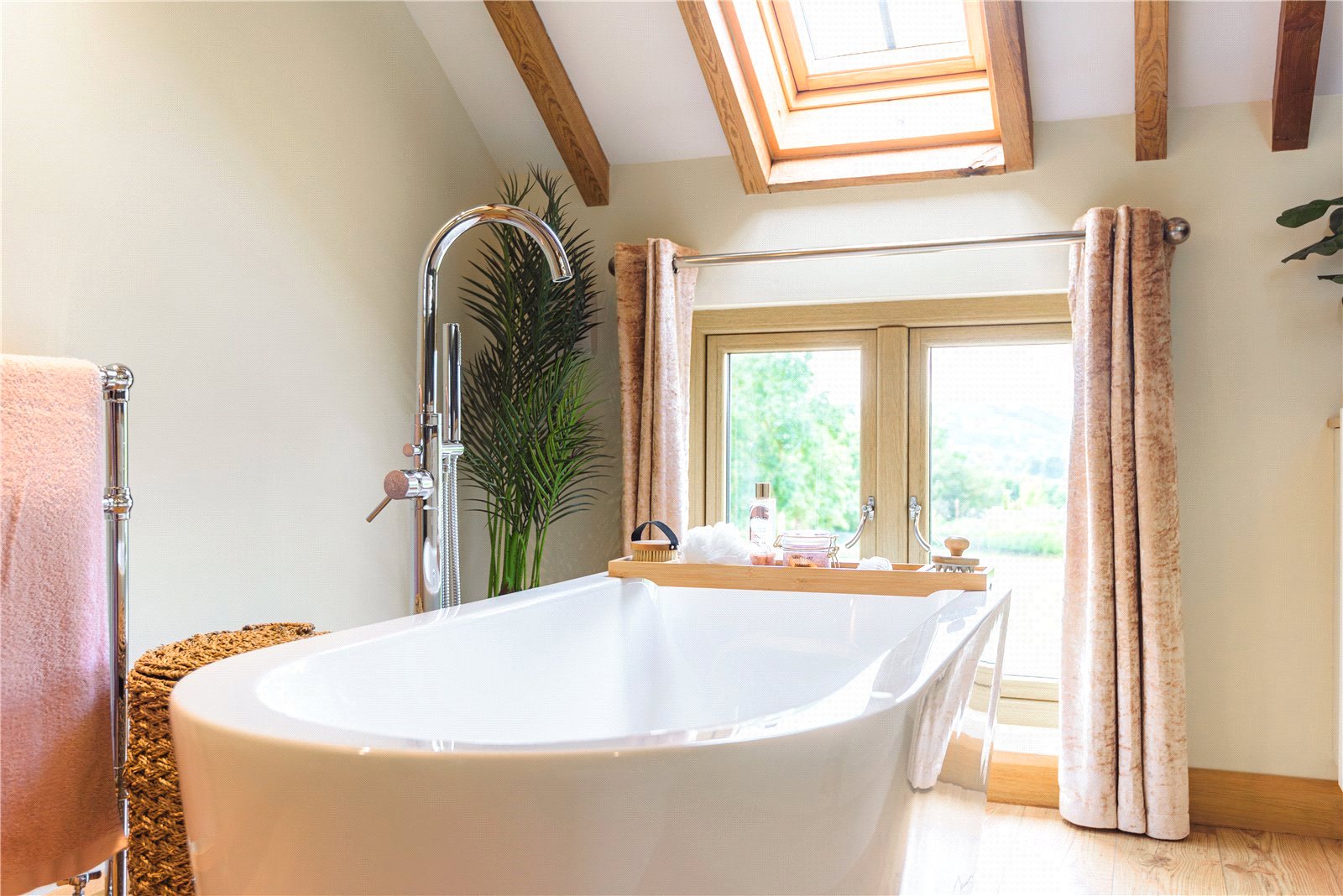 Upstairs, the first floor is home to four generously sized double bedrooms, all of which have their own luxurious en-suite bathrooms. The oak beams, a consistent feature throughout the property, add a rustic yet elegant touch. The master suite is a true sanctuary, featuring a glamorous en-suite complete with a roll-top bath perfectly positioned to take in sweeping views down the valley, a walk-in rain shower, and a wall-length vanity unit. The three additional double bedrooms are equally impressive, each boasting their own en-suite with rain-effect showers.
