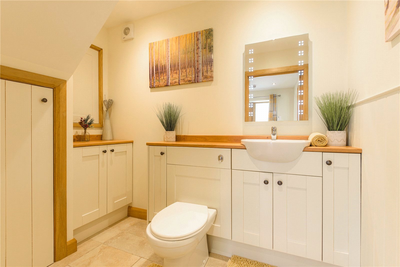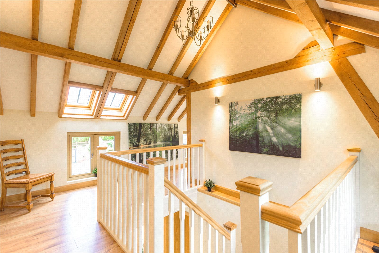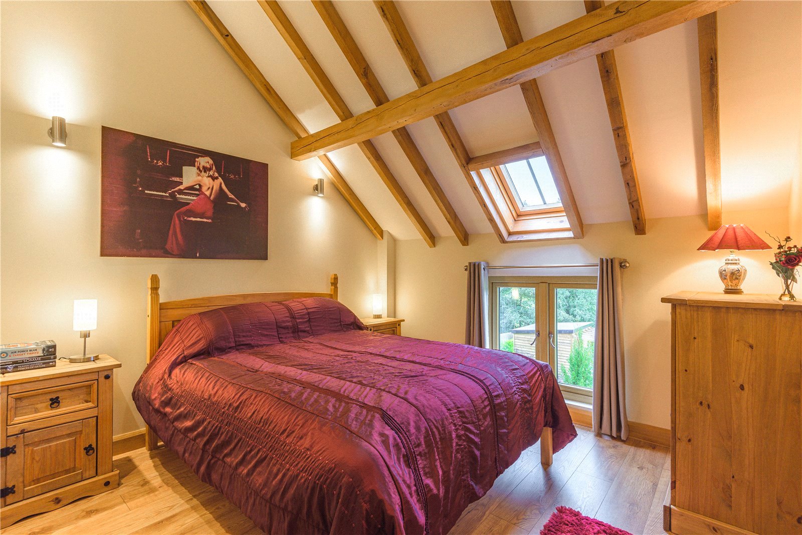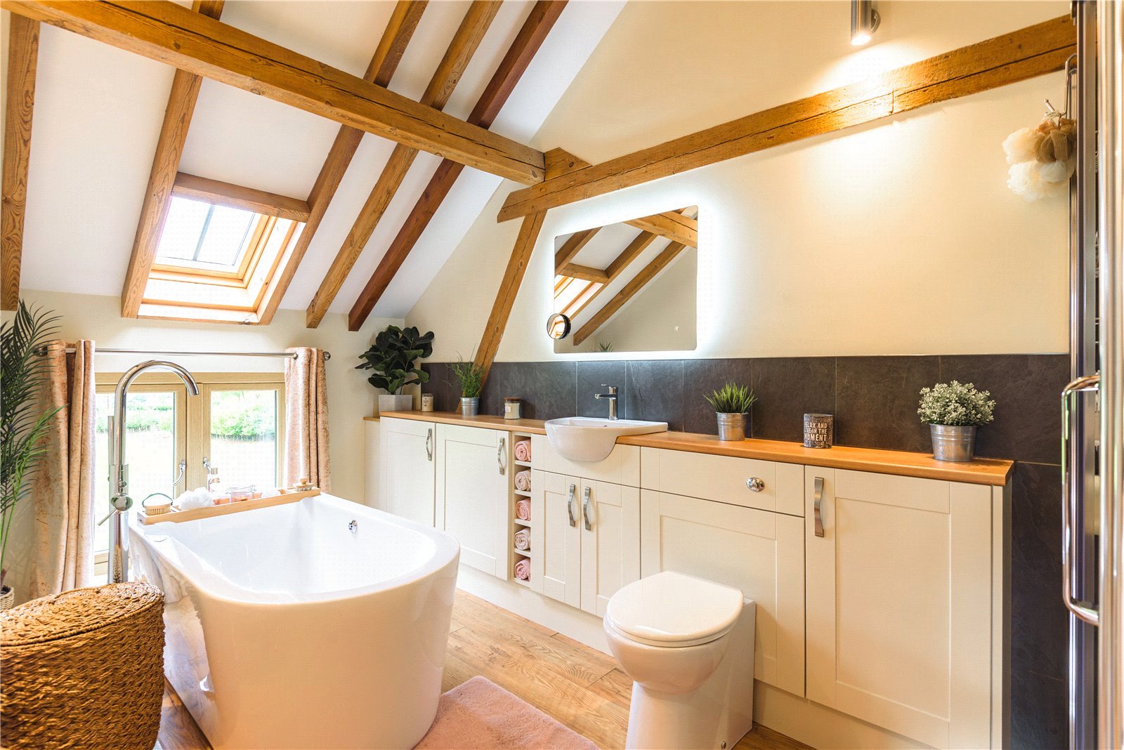 Upstairs, the first floor is home to four generously sized double bedrooms, all of which have their own luxurious en-suite bathrooms. The oak beams, a consistent feature throughout the property, add a rustic yet elegant touch. The master suite is a true sanctuary, featuring a glamorous en-suite complete with a roll-top bath perfectly positioned to take in sweeping views down the valley, a walk-in rain shower, and a wall-length vanity unit. The three additional double bedrooms are equally impressive, each boasting their own en-suite with rain-effect showers.