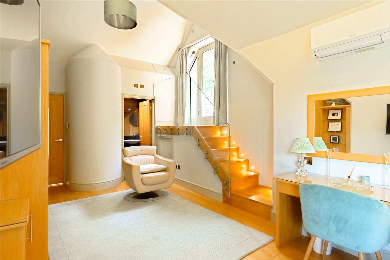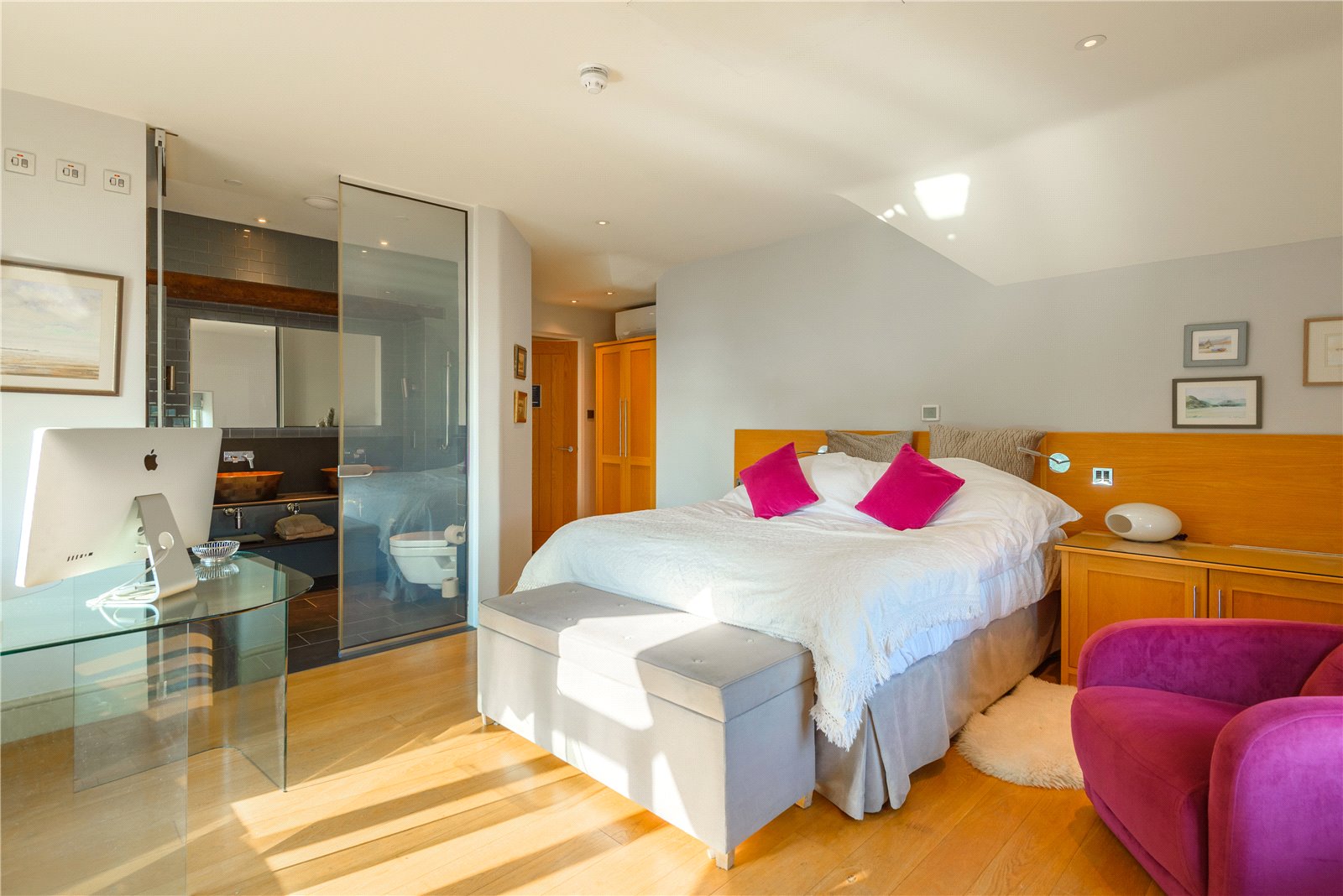 A winding glass staircase leads to the first floor, where five further ensuite double bedrooms await, alongside a cinema room. Each bedroom has its own distinctive character and luxury bathroom. Underfloor heating and air-conditioning units ensure perfect comfort all year round.The principal suite is a true showpiece, designed to capture dual-aspect estuary views. At its centre sits a handcrafted Scottish Ash bath, created by a luxury yacht builder, complemented by twin Welsh Ash sinks, a walk-in shower, and intelligent lighting panels that transform at the touch of a control.The second suite is dramatic and indulgent, with a vaulted ceiling, sleek black finishes, and a private cedar-and-slate steam room. Temperature controls and dimmable lighting complete the spa-like experience.