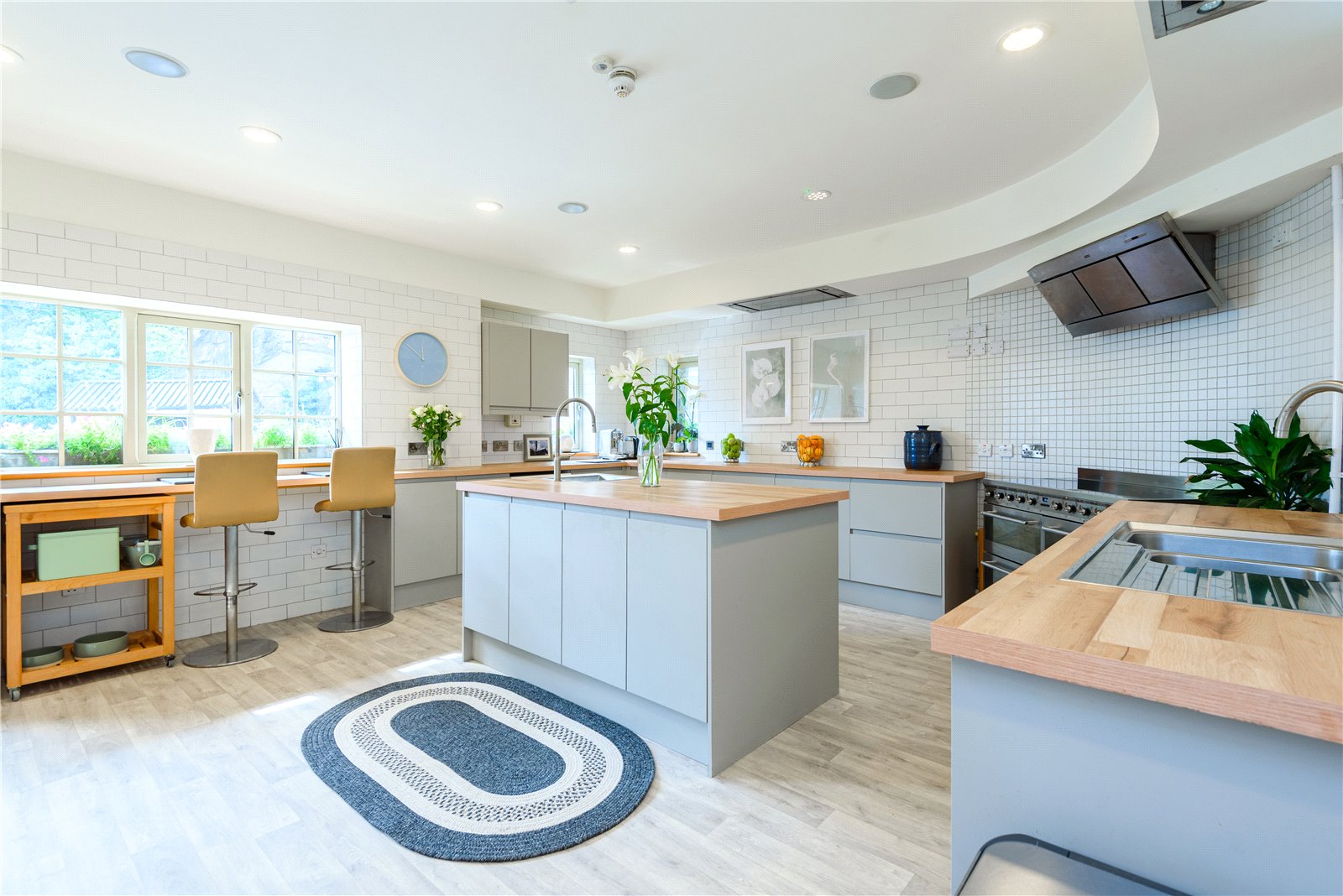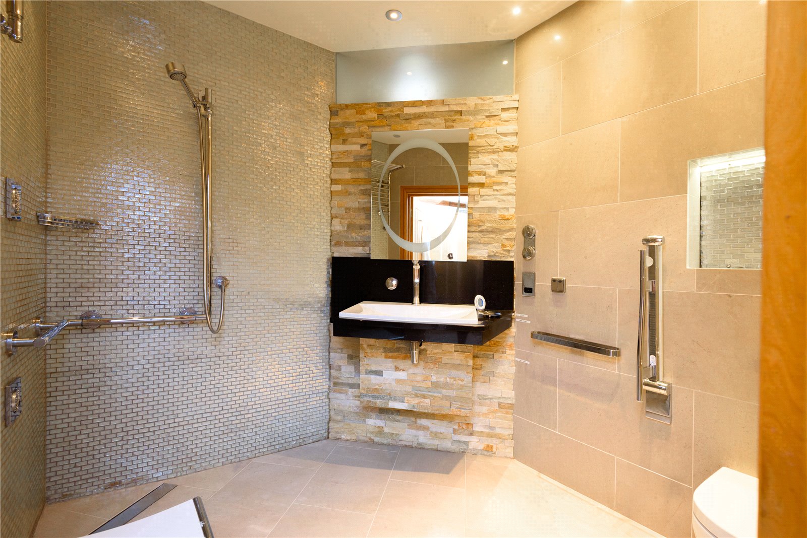 The fifth bedroom is currently used as a cinema room, with an ensuite resplendent in seashell tiles and sparkling Carrara marble. With its proportions, it could easily serve as a lounge or guest suite.Accessibility has been carefully considered, with the ground-floor bedroom and living areas all on one level. Wide bifold doors open directly to a screened cedar hot tub on the patio, and onwards to the walled garden, stables, and private parking – all step-free.This home perfectly blends the indulgence of a luxury spa retreat with the warmth of a family residence.