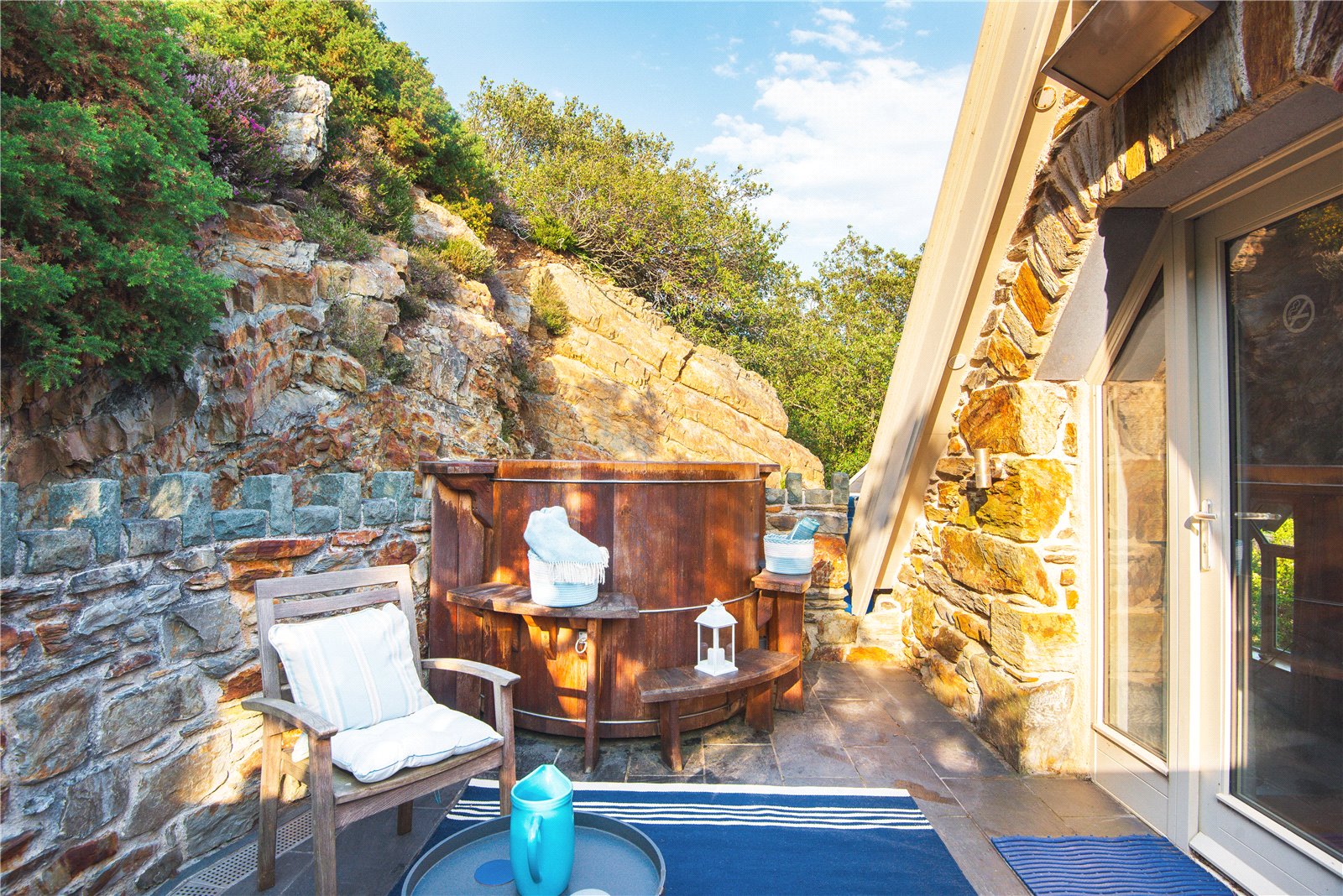 The third suite, equally worthy of being called a master, offers vast proportions, a jacuzzi bath with integrated TV, and a bathroom window angled towards the summit of Cader Idris. A huge walk-in shower and direct access to a private terrace – complete with cedar hot tub and outside heating –make this a space for true relaxation, day or night.The fourth bedroom is a generous double with sea views and a sleek black ensuite. A cedar hot tub is tucked into a private rock terrace with soft outside lighting. The bathroom lends itself perfectly to sauna lovers, with scope for further personalisation.