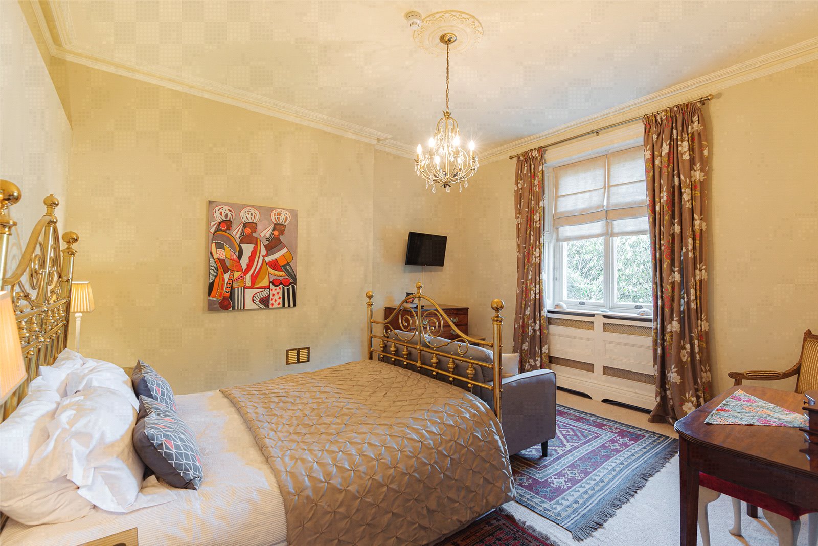 As you enter the spacious reception hall, you’re immediately immersed in the historic charm of the property, greeted by beautifully maintained oak parquet flooring and an intricately carved oak fireplace. To the right, a versatile reception room awaits, having previously served as a library, games room, and living room. To the left of the entrance hall is the elegant Drawing Room, featuring a carved fireplace and ornate cornicing. The bay window floods the room with light and offers stunning views of the garden. Continuing on, you’ll find the expansive dining room with dual aspect windows, providing lovely garden views and a striking feature fireplace.