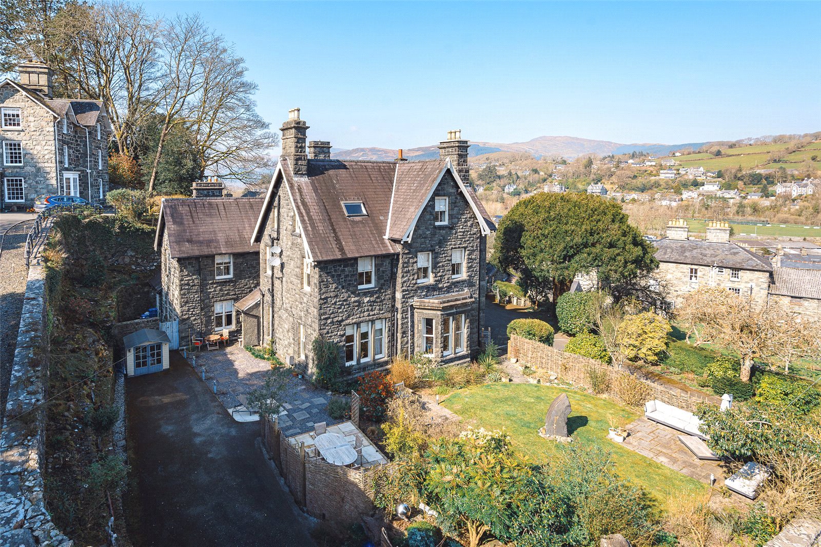 Outside, you’ll find a beautifully maintained garden with a level lawn and patio areas, perfect for outdoor relaxation. Ample parking is available on both sides of the house. A short stroll downhill brings you to the heart of Dolgellau, where you’ll find a range of local amenities.