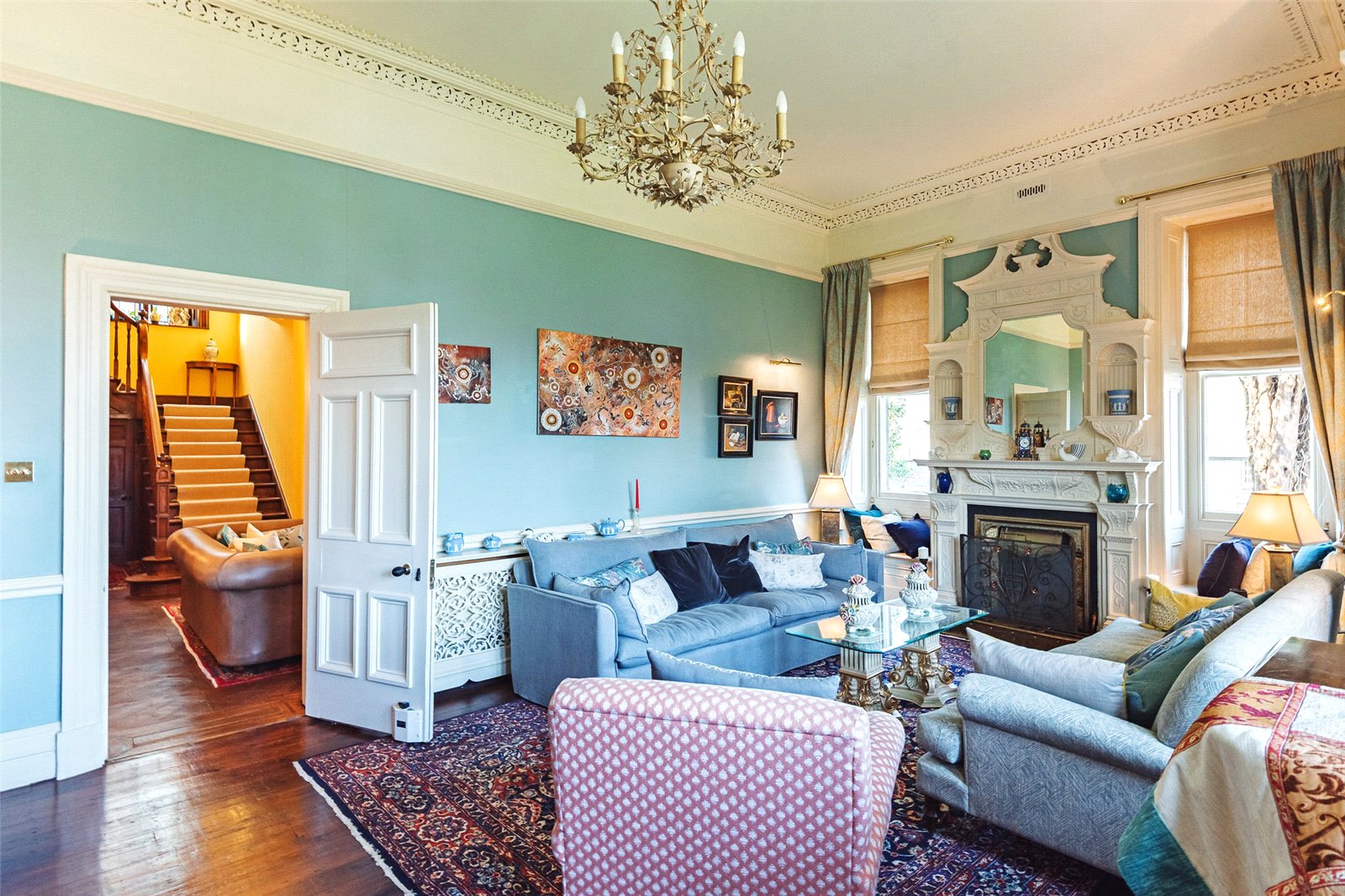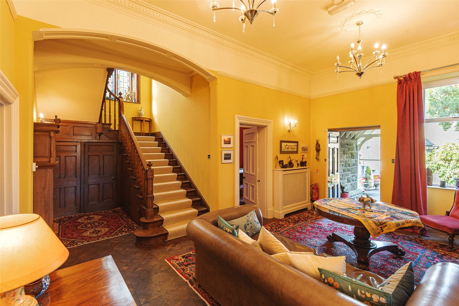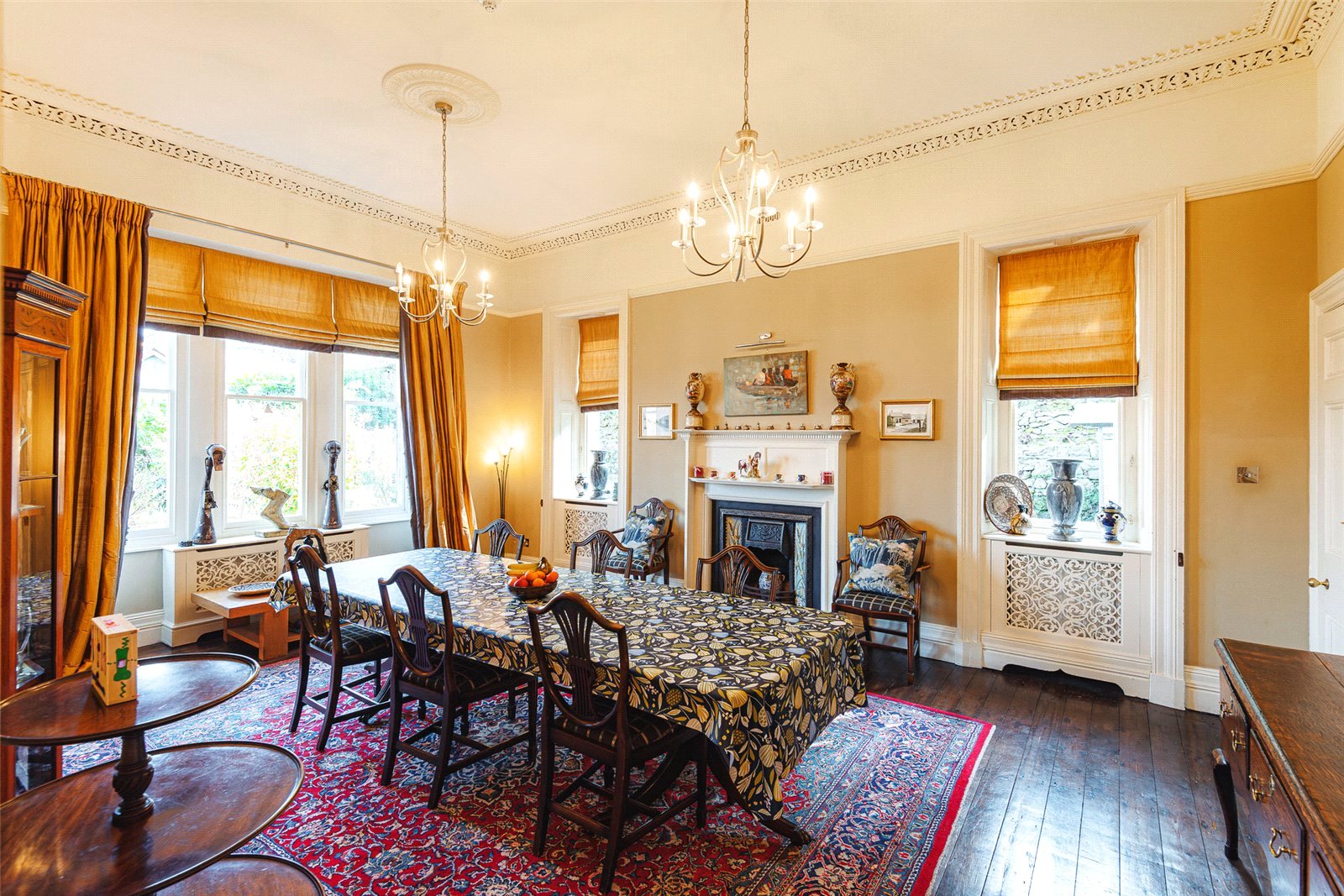 As you enter the spacious reception hall, you’re immediately immersed in the historic charm of the property, greeted by beautifully maintained oak parquet flooring and an intricately carved oak fireplace. To the right, a versatile reception room awaits, having previously served as a library, games room, and living room. To the left of the entrance hall is the elegant Drawing Room, featuring a carved fireplace and ornate cornicing. The bay window floods the room with light and offers stunning views of the garden. Continuing on, you’ll find the expansive dining room with dual aspect windows, providing lovely garden views and a striking feature fireplace.