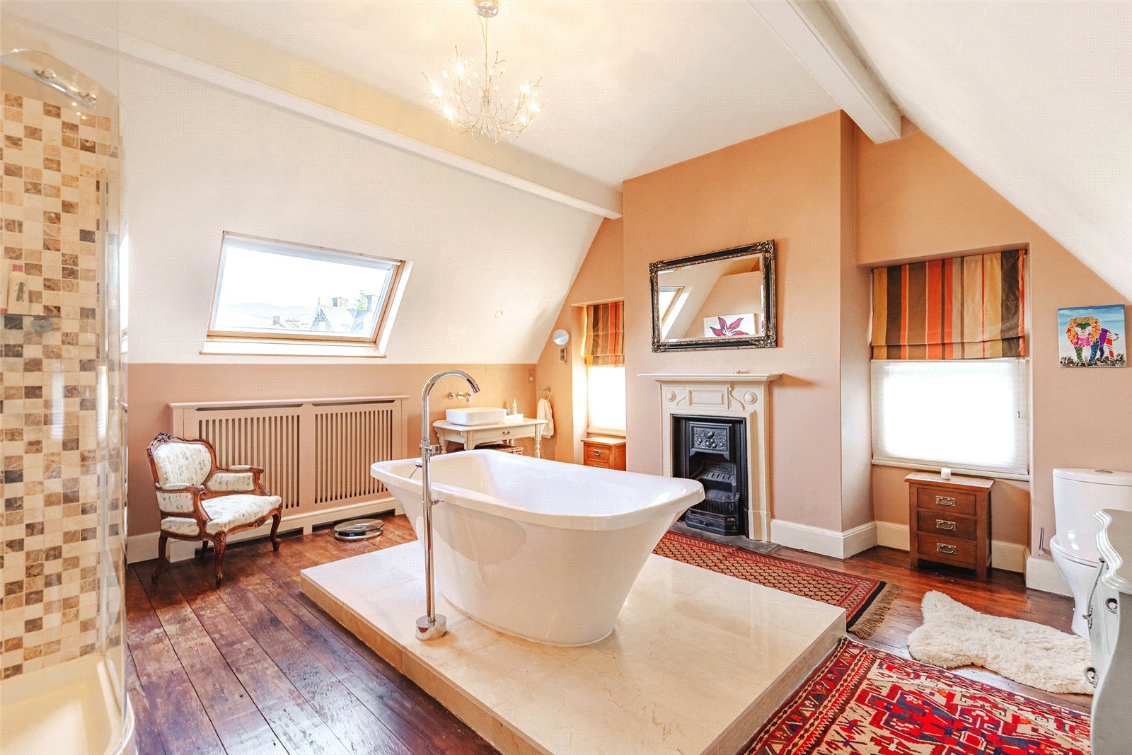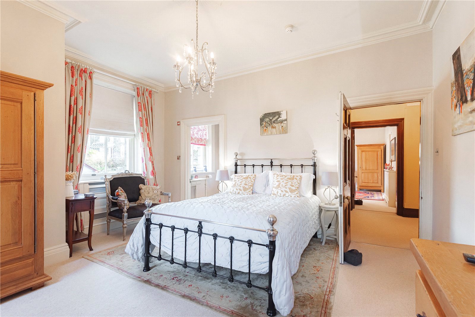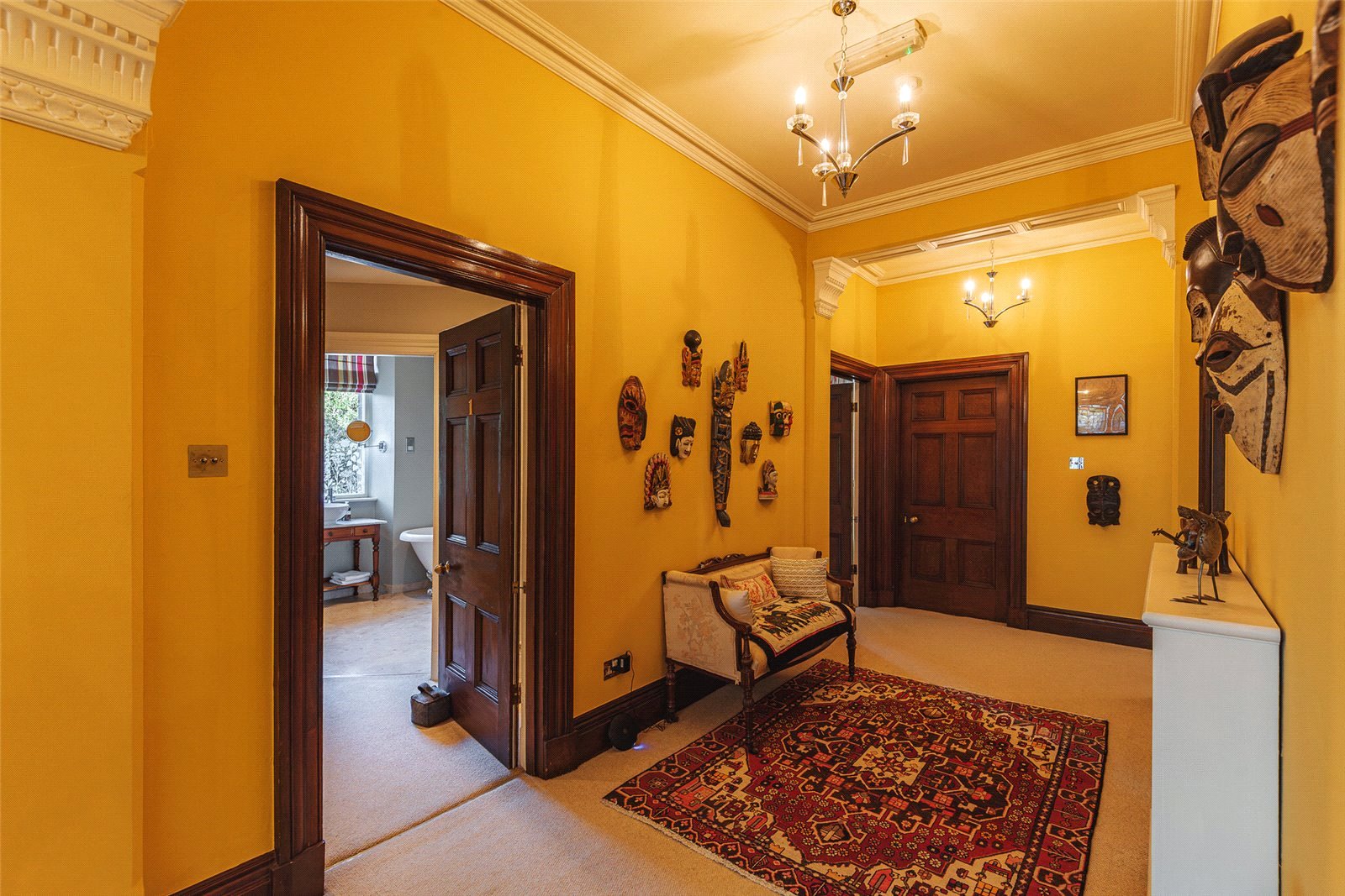 As you enter the spacious reception hall, you’re immediately immersed in the historic charm of the property, greeted by beautifully maintained oak parquet flooring and an intricately carved oak fireplace. To the right, a versatile reception room awaits, having previously served as a library, games room, and living room. To the left of the entrance hall is the elegant Drawing Room, featuring a carved fireplace and ornate cornicing. The bay window floods the room with light and offers stunning views of the garden. Continuing on, you’ll find the expansive dining room with dual aspect windows, providing lovely garden views and a striking feature fireplace.