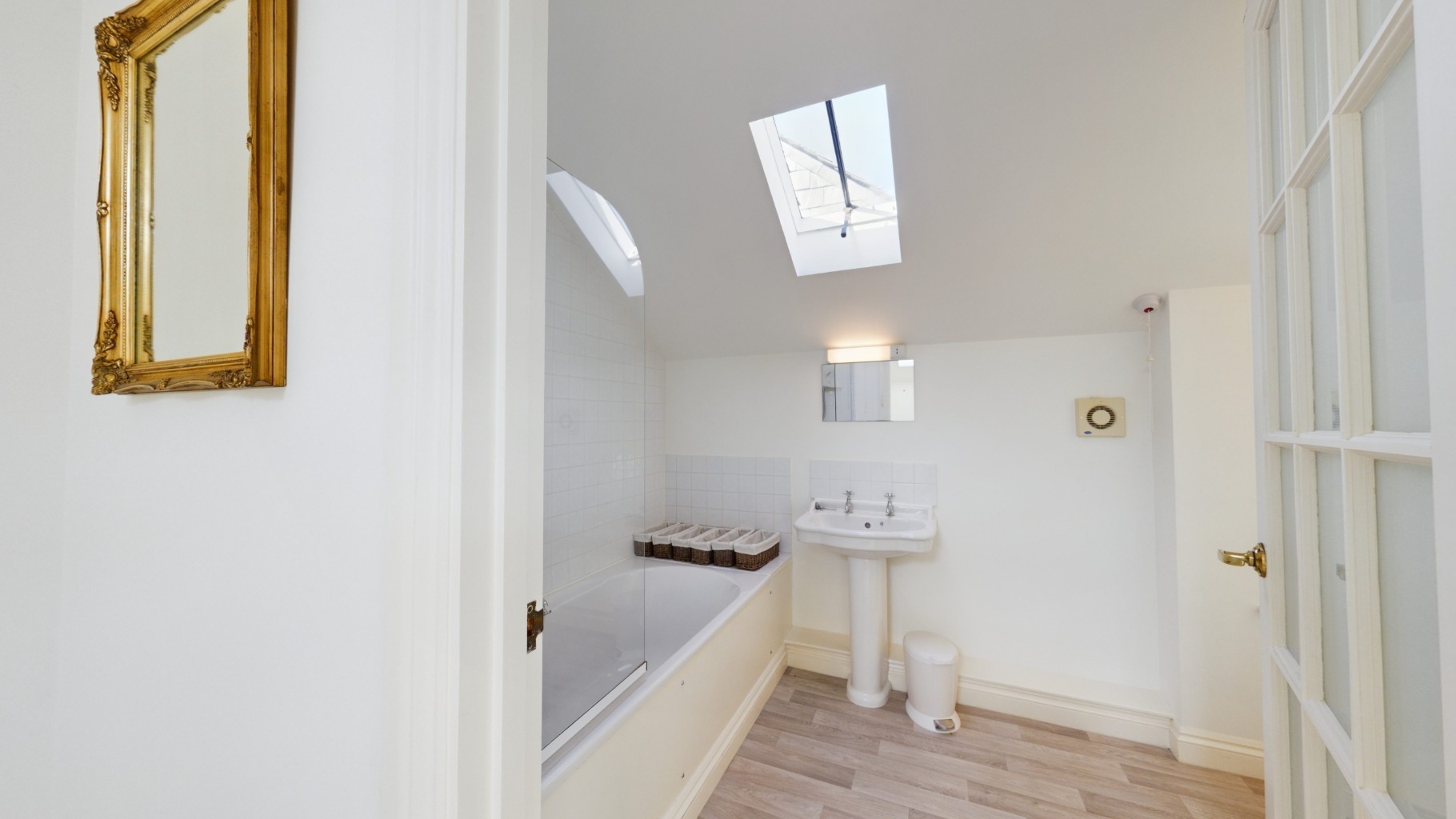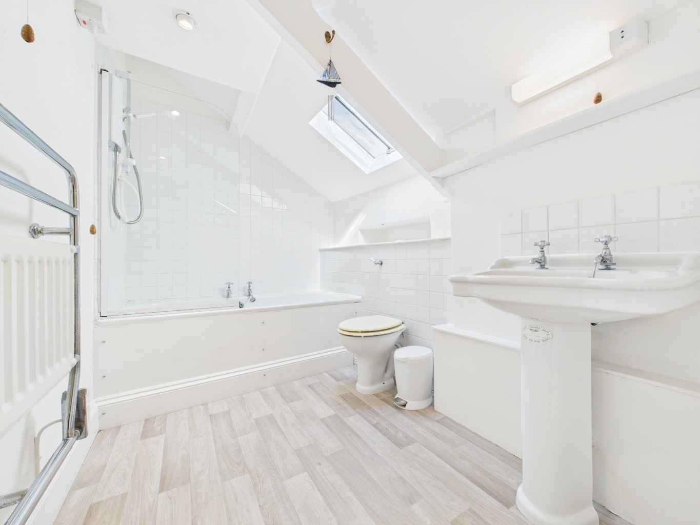 The second staircase from the Kitchen rises to the Rear Landing with a glazed panel door providing access to the rear gardens. To one side is a large airing cupboard. The third Bedroom is of a good size and has built-in wardrobes and an En-Suite Bathroom with an electric shower over the bath.