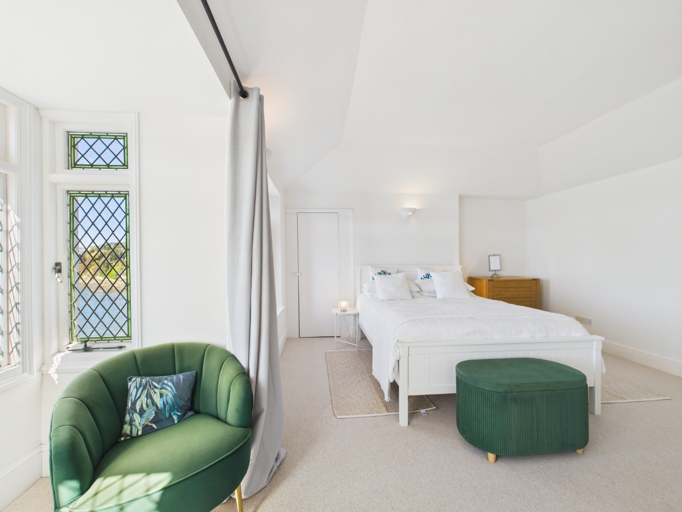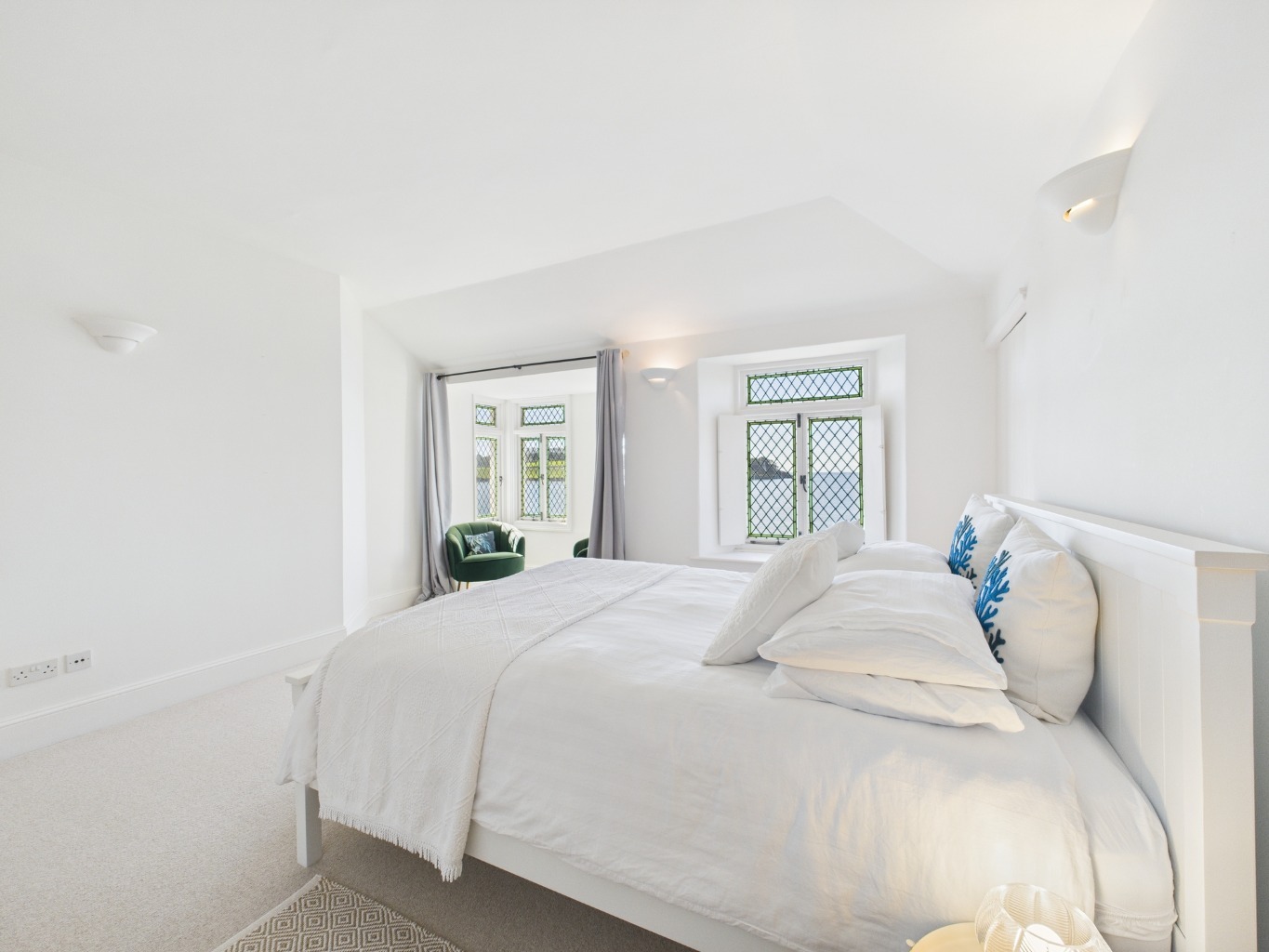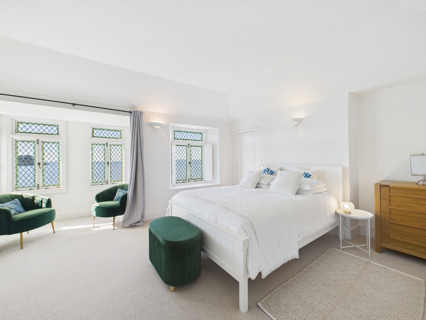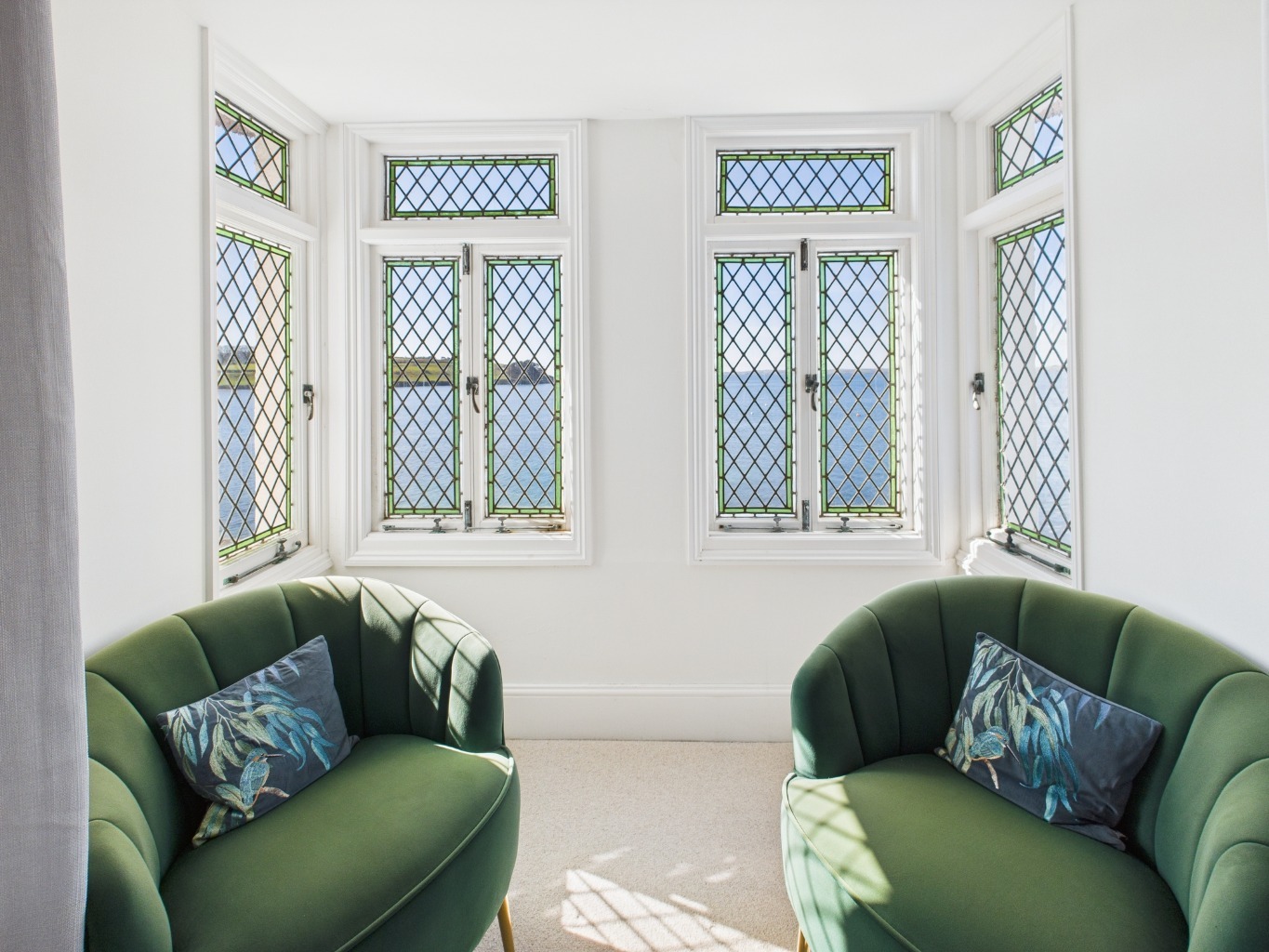 The principal staircase from the Living Room leads to a first-floor landing. (Past Planning permission exists to knock through the wall on the left at the top of the stairs to create a doorway into the third bedroom, which alleviates the need to have the second staircase in the Kitchen). The Principal Bedroom has a high canopied ceiling and a featured bay window, similar to the Living Room, comprising leaded glazed windows with green stained-glass borders, a wonderful area to sit and admire the superb water and coastal views. A further window in a similar style has a seat and attracts the same wonderful views. The good sized Second Bedroom has a matching lead glazed window to the south elevation to attract the all-day sun and the captivating views. At the rear of the room is a Dressing Area with built in wardrobes and a window. The family Bathroom comprises white suite with bath and electric shower over, concealed flush w/c and a wash basin.