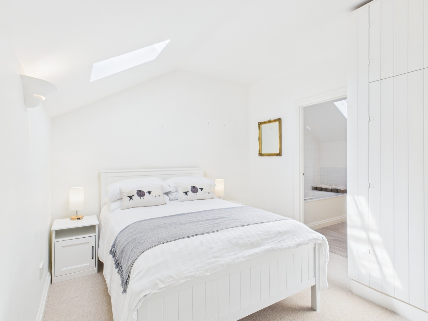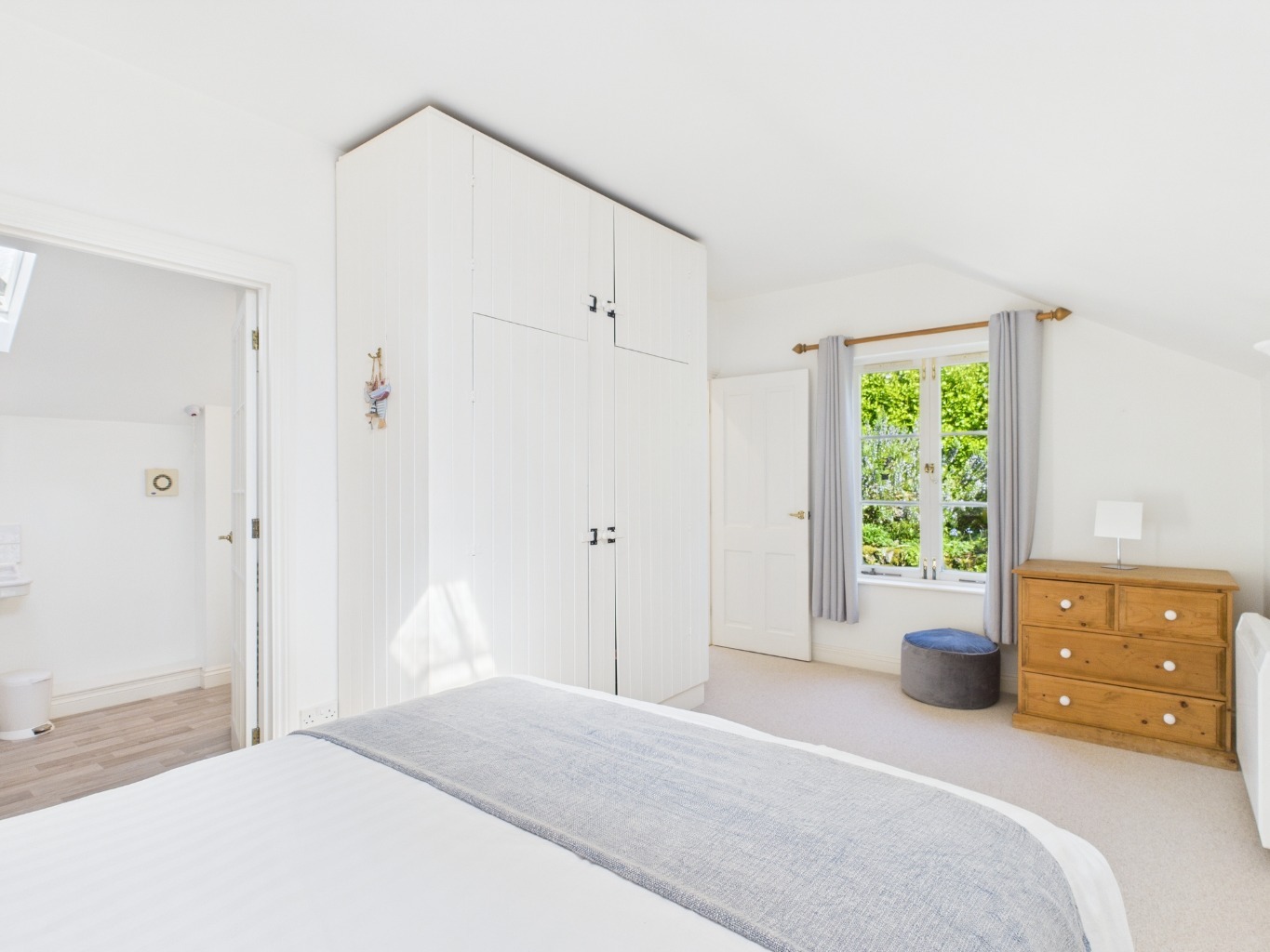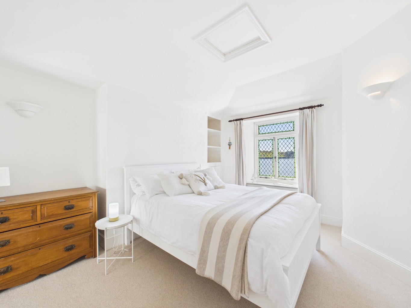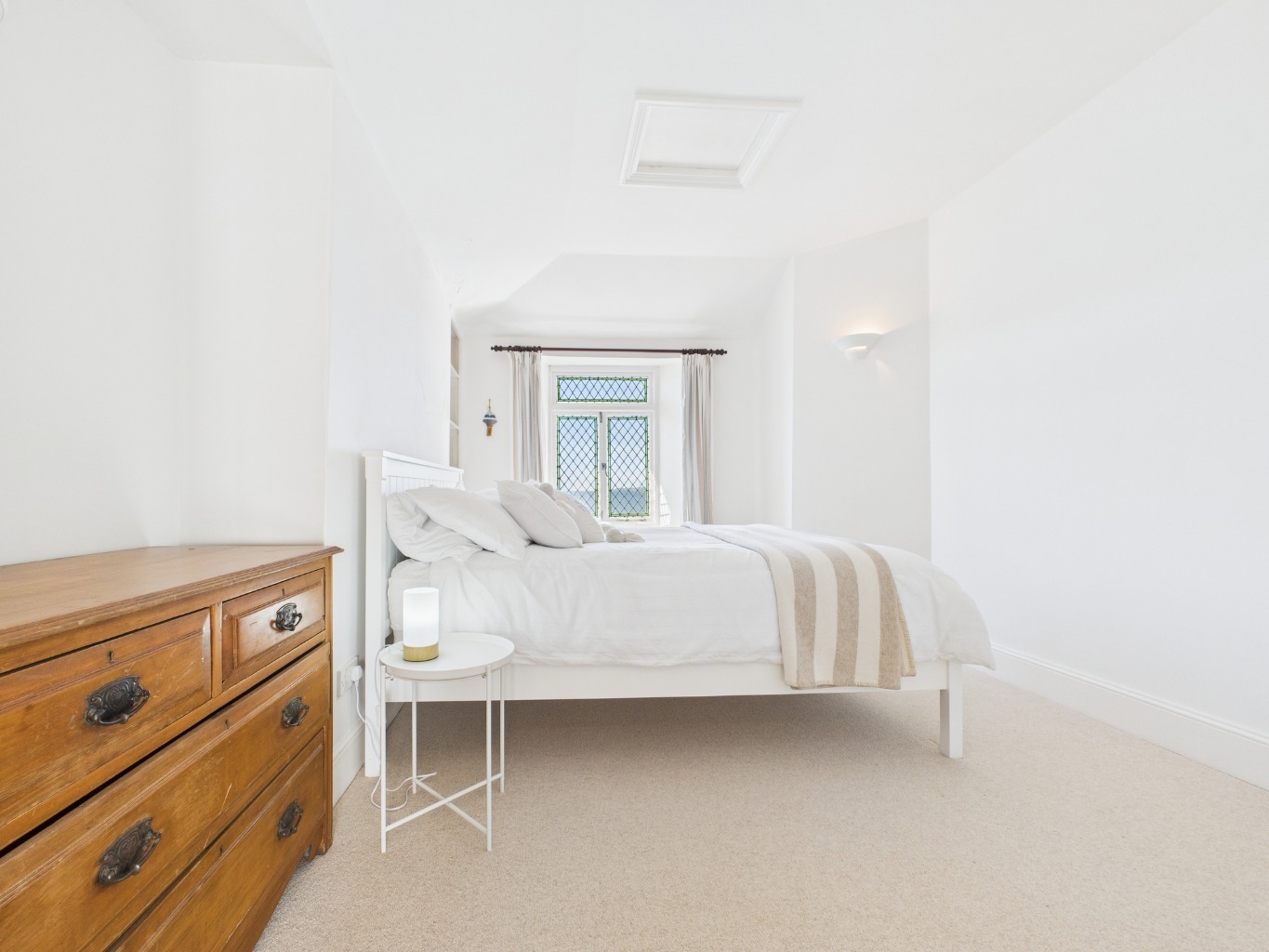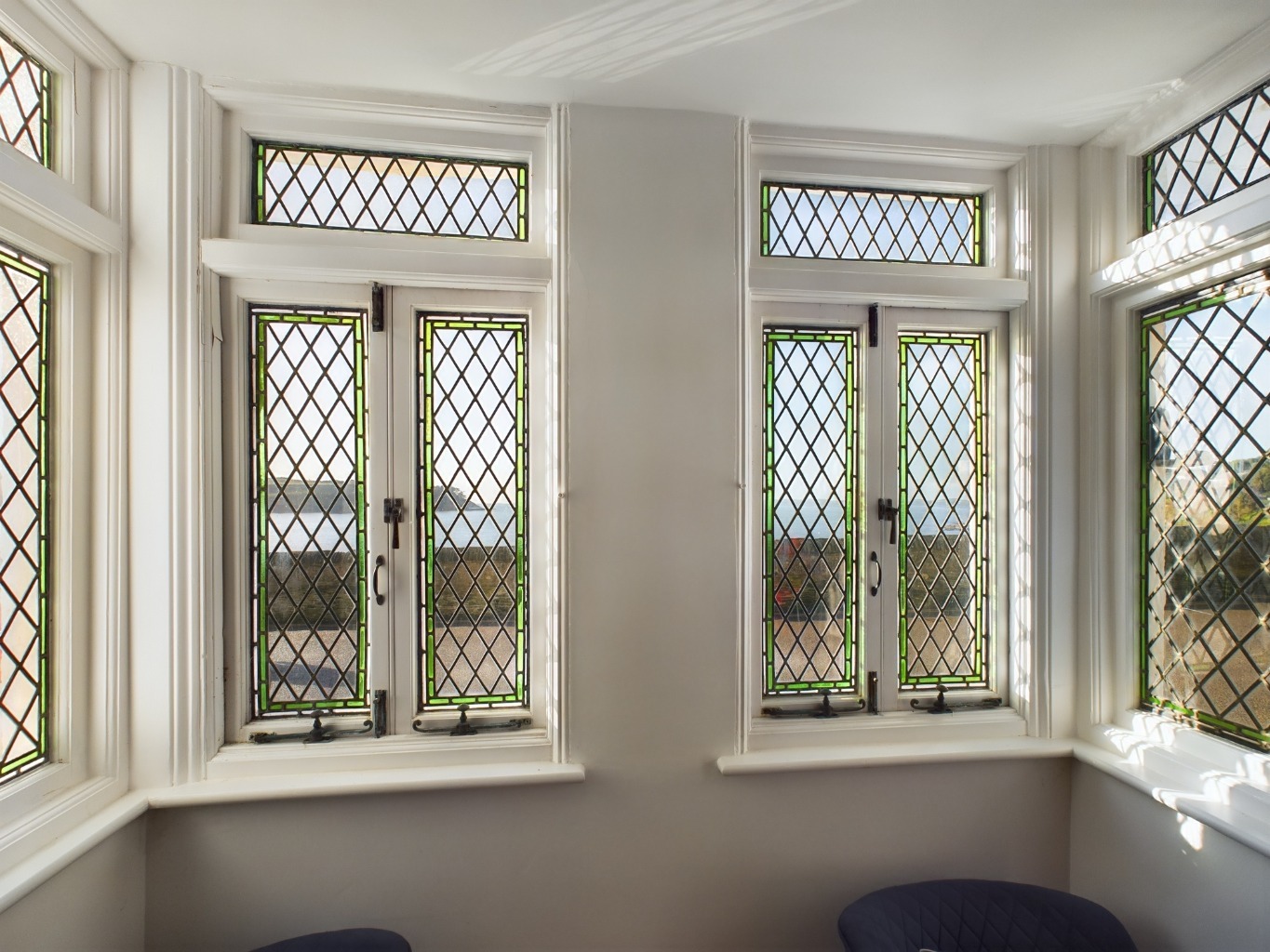 The principal staircase from the Living Room leads to a first-floor landing. (Past Planning permission exists to knock through the wall on the left at the top of the stairs to create a doorway into the third bedroom, which alleviates the need to have the second staircase in the Kitchen). The Principal Bedroom has a high canopied ceiling and a featured bay window, similar to the Living Room, comprising leaded glazed windows with green stained-glass borders, a wonderful area to sit and admire the superb water and coastal views. A further window in a similar style has a seat and attracts the same wonderful views. The good sized Second Bedroom has a matching lead glazed window to the south elevation to attract the all-day sun and the captivating views. At the rear of the room is a Dressing Area with built in wardrobes and a window. The family Bathroom comprises white suite with bath and electric shower over, concealed flush w/c and a wash basin.