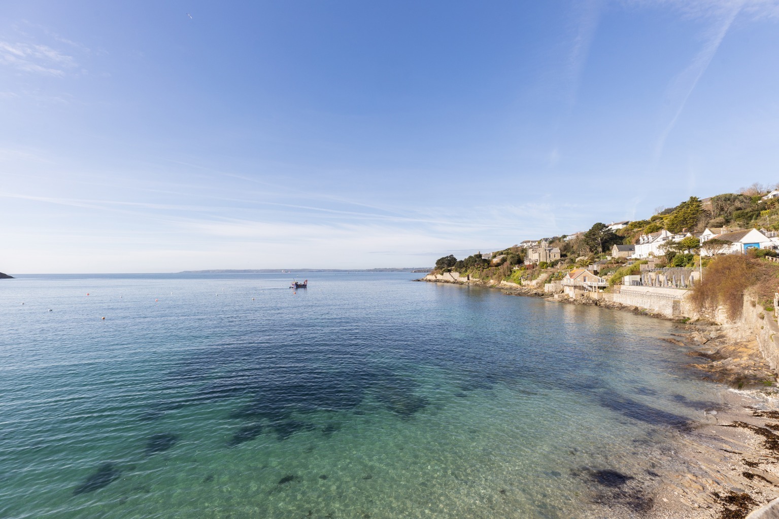 Path down to Tavern Beach (opposite): 10 yards. Central village square: 350 yards. King Harry Ferry: 5 miles. Truro: 10 miles via car ferry. Falmouth: 20 minutes by foot ferry or 15 miles by car ferry. Cornwall Airport Newquay: 29 miles (regular flights to London and other UK regional airports). St Austell: 15 miles (London Paddington 4.5 hours by rail).