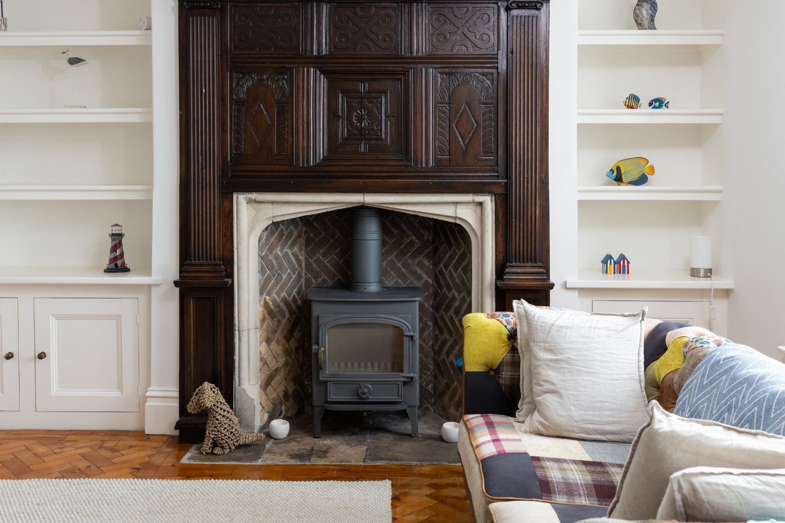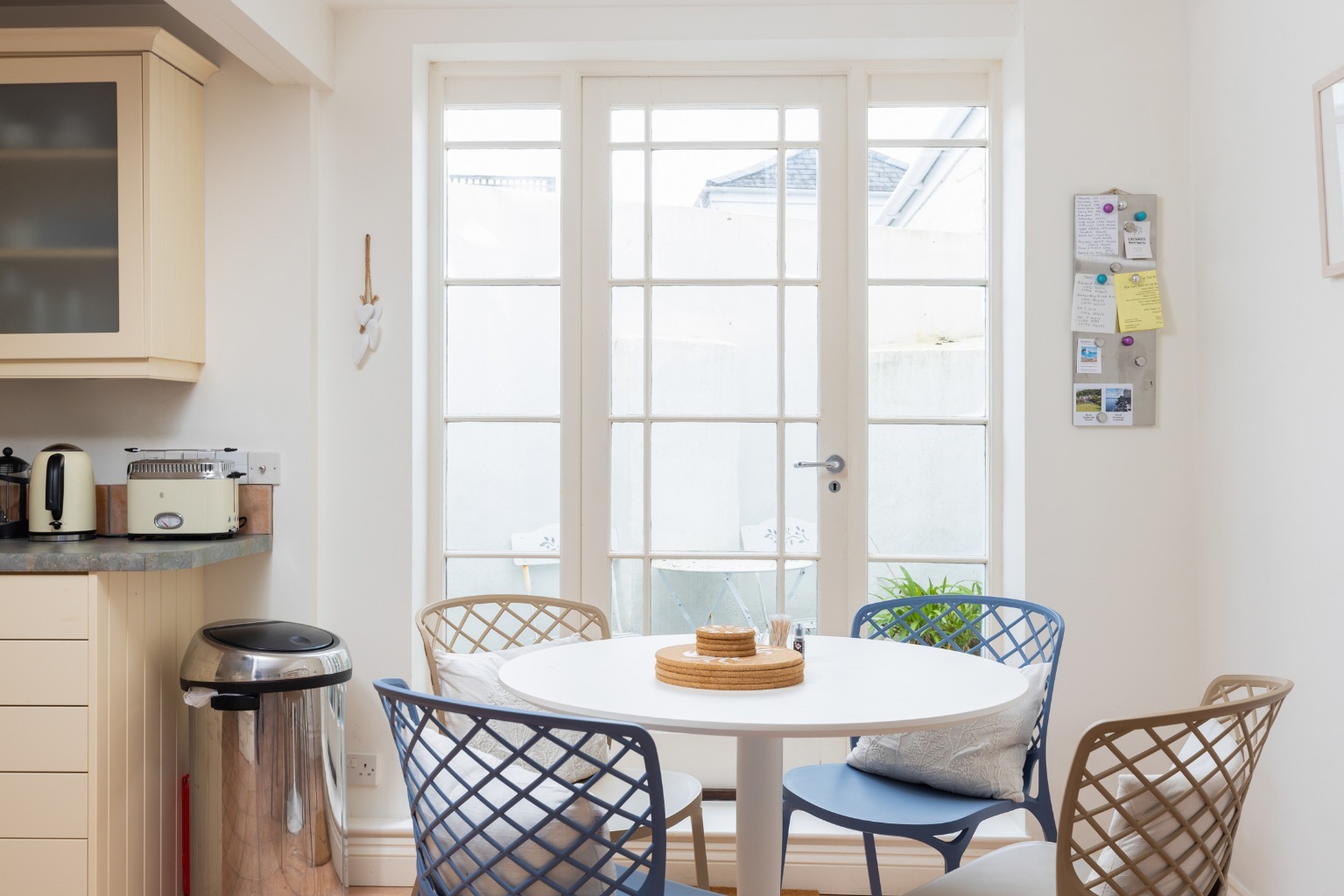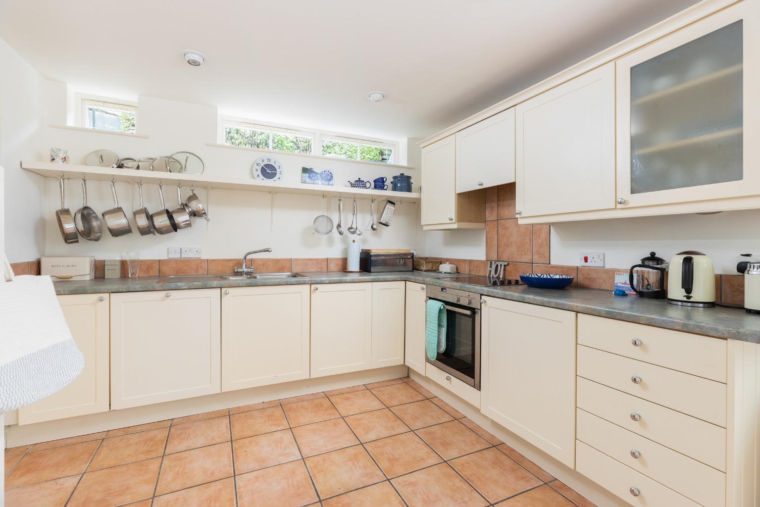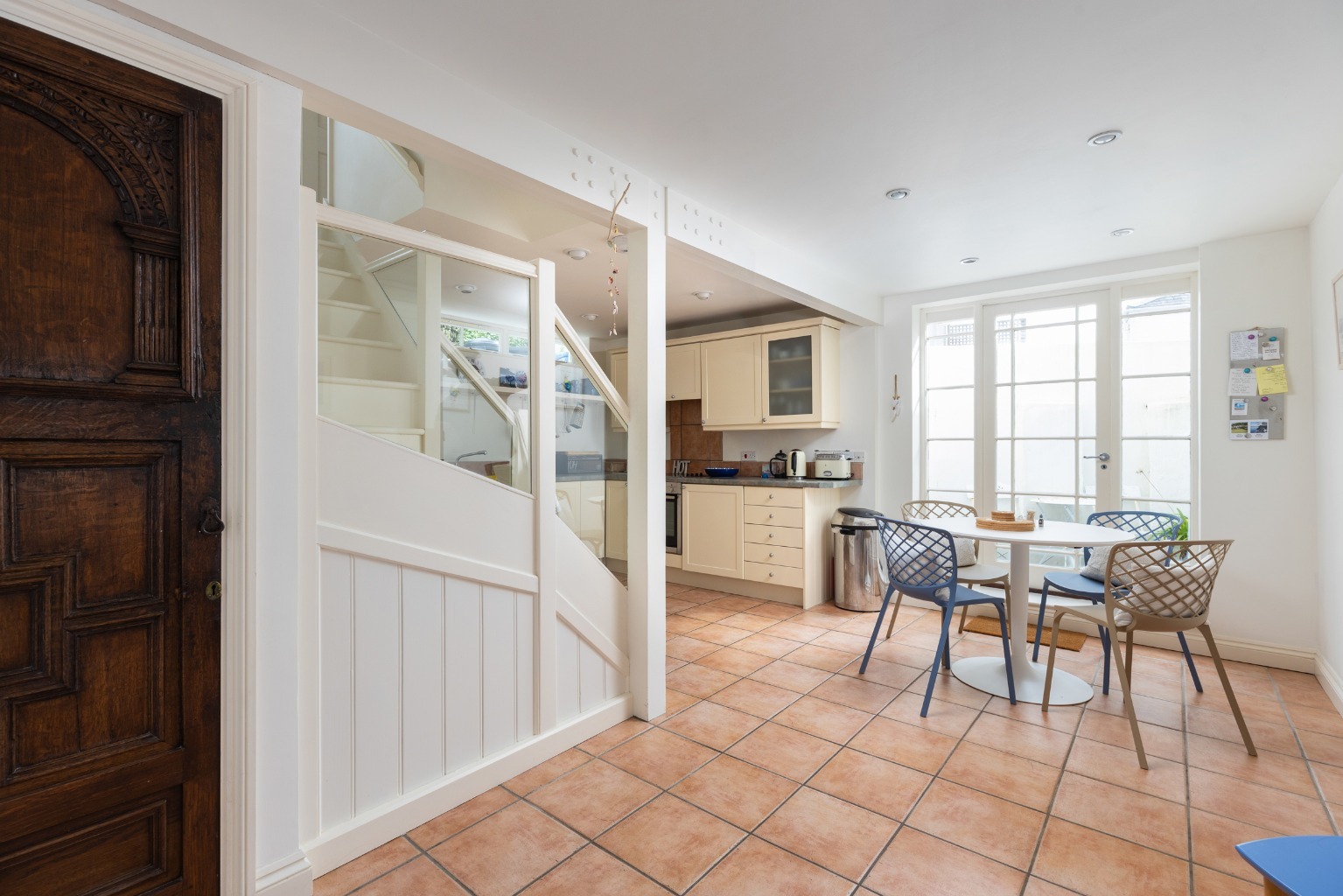 The shaker style kitchen is made by Out-of-Wood. Integrated Neff appliances include: stainless-steel oven, inset hob, concealed extractor unit, fridge and dishwasher. Under the property’s secondary staircase is a Utility Area with plumbing for a washing machine, and space for a dryer and freezer. In the Dining Area are elegant dual aspect panelled French doors with glazed side panels, one leading to a small patio, the other via steps with courtesy light over to the garden. A carved oak door (reputed to have originally been from St Just Church) opens to an Inner Lobby and Separate W/C beyond.