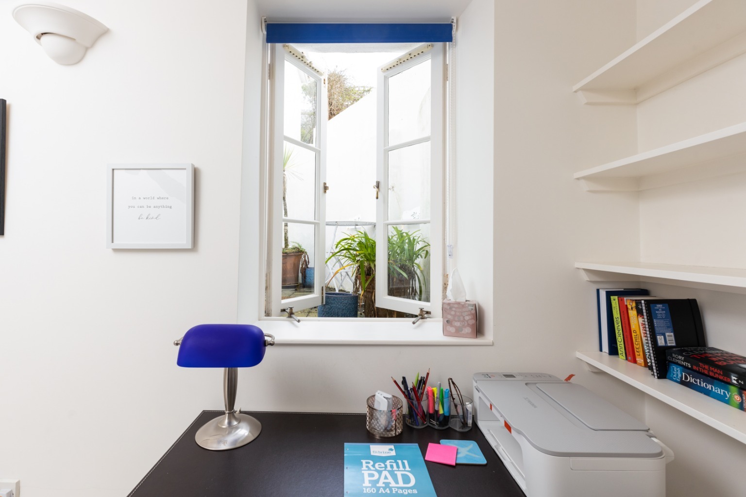 The Gardens, Sun Terraces and Detached Studio are all a major attribute of Bay Cottage. A French door from the Dining Room gives access to a courtyard with some steps which lead to a paved path, also accessed through the glazed door from the Rear Landing. Beside the path is a cold-water tap. The path continues on between wooden fencing and dog-legs past an approximate 10ft by 10ft timber shed, to the main garden. The colourful garden is landscaped with low maintenance in mind. It has a central lawn surrounded by flower and shrub borders including dracaena, camelia, bay, veronica, ceanothus, hydrangea, myrtle, bamboo, rhododendron, fuschia and rosemary.
