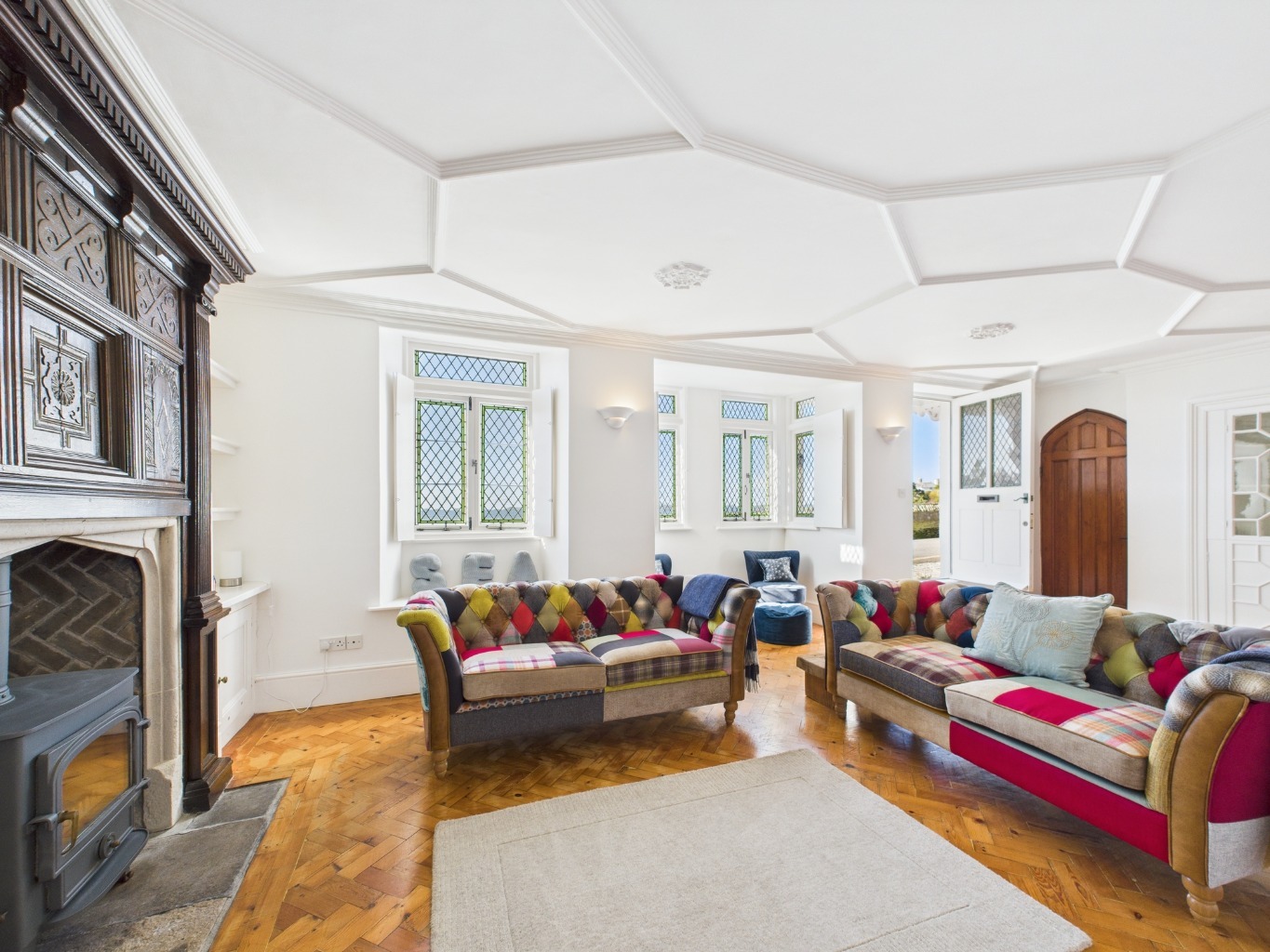 Enter through a leaded diamond pattern green coloured half glazed door, down a couple of steps, into a superbly spacious, light and airy, character Living Room. Its array of features include high moulded panel ceiling, herring bone pattern parquet floor, impressive fireplace with panelled and carved oak outer surround, carved stone inner surround, multi-fuel stove, and stone hearth with shelved alcoves to each side with cupboards under. To the side of the front door is a Cloaks cupboard with an attractive arched oak panelled door. A large bay window and a further window with seating both feature the leaded green coloured glazing yet also attract the wonderful water and countryside views beyond. Behind a delicately glazed and panelled door is a built-in illuminated drinks cupboard with fridge space below. A featured and principal staircase is at the rear of the room with pencil balustrade.