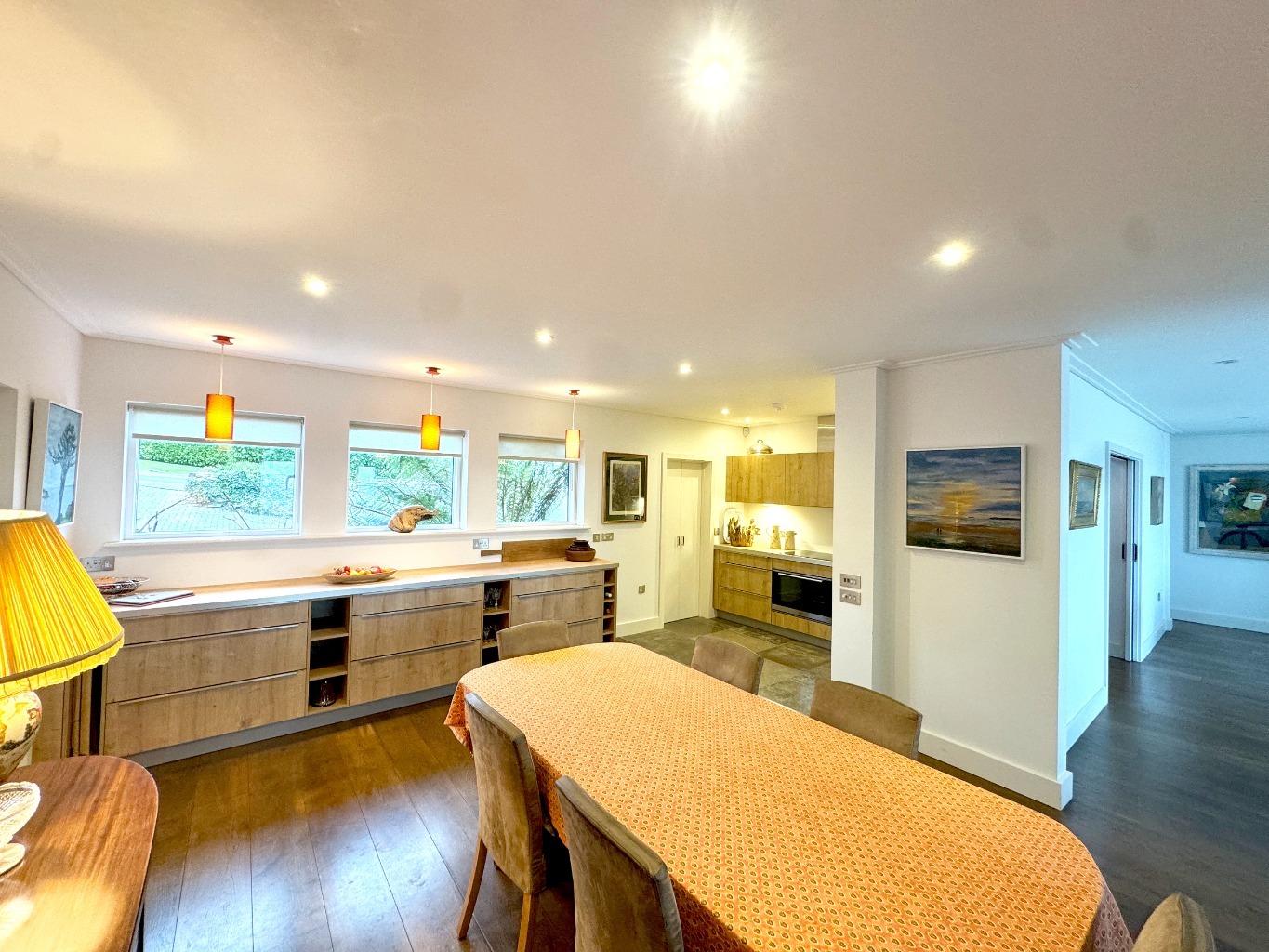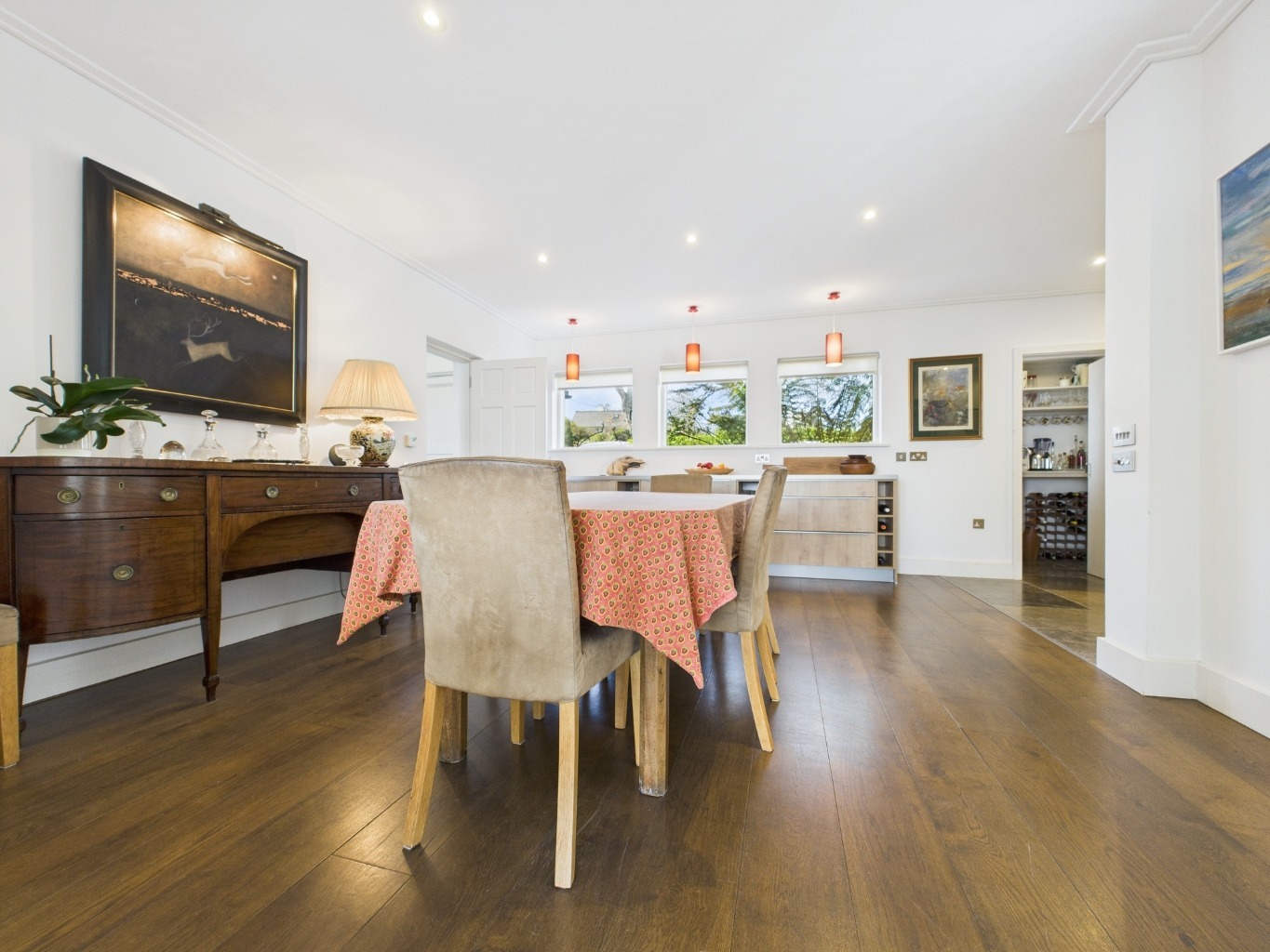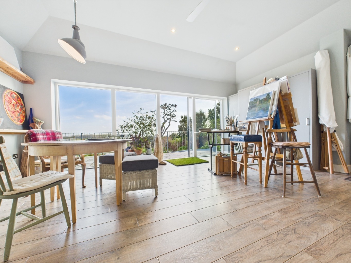 On the western side of the house, a separate entrance leads to an inner hallway, prep kitchen/utility room, shower room and a generous multi-use double-height studio. This entire wing can be easily adapted into a self-contained annexe—perfect for visiting family, an au pair, or as potential income accommodation.