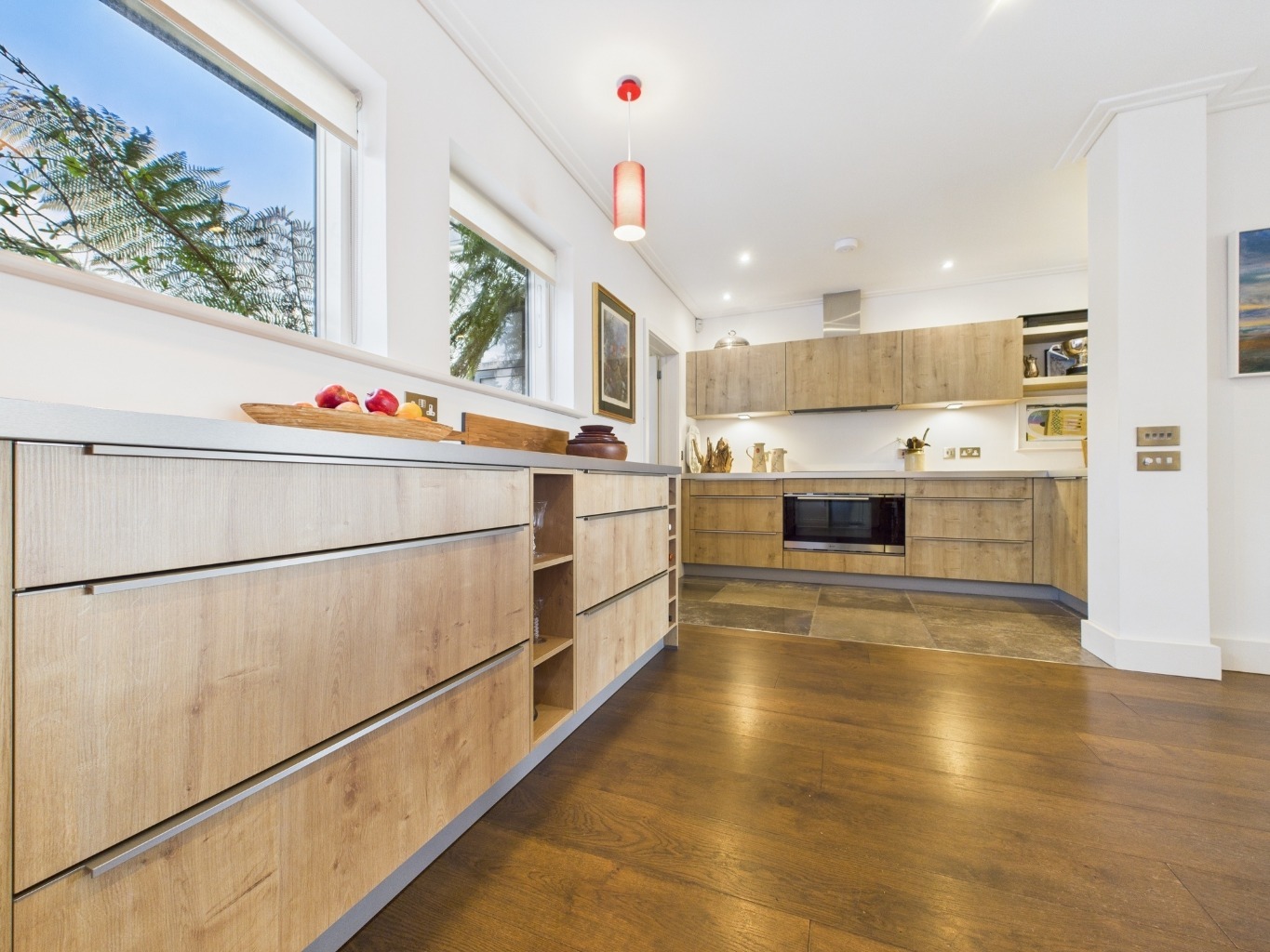 The landscaped rear gardens stretch to approximately half an acre, offering a south-facing suntrap filled with colour, scent and seasonal interest. Thoughtfully planted and gently sloping, they include a rich mix of rhododendrons, hydrangeas, camellias, roses, and fruit trees in a small orchard. Hidden pathways and sheltered seating spots add to the sense of privacy and peace.