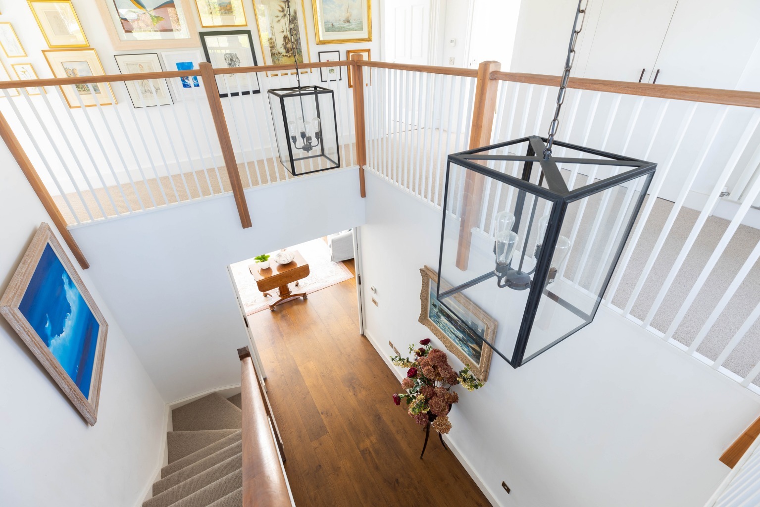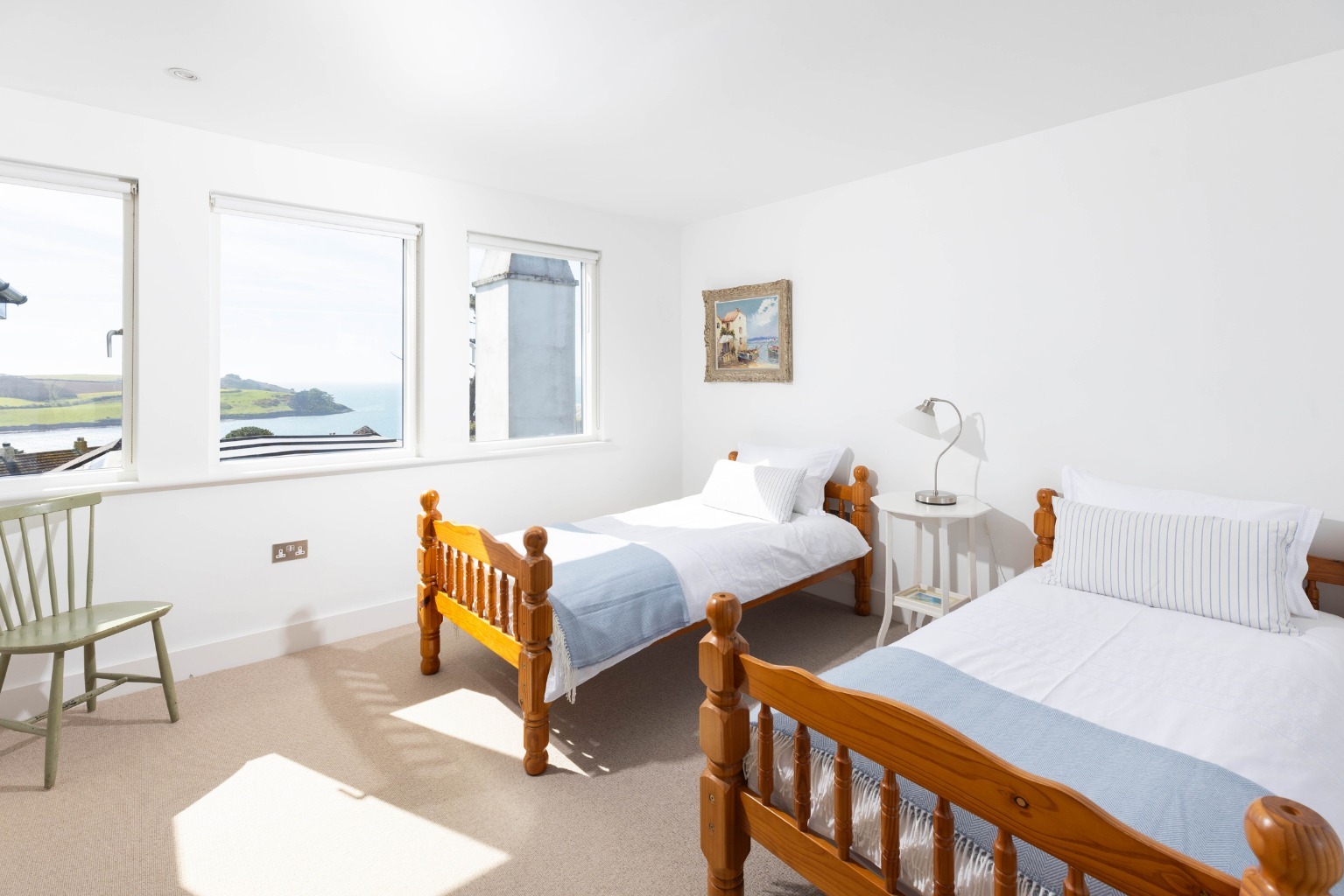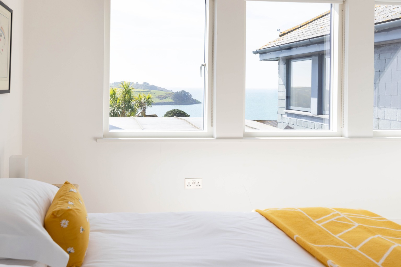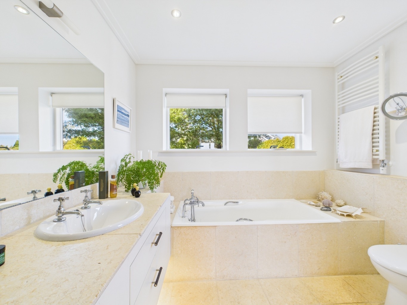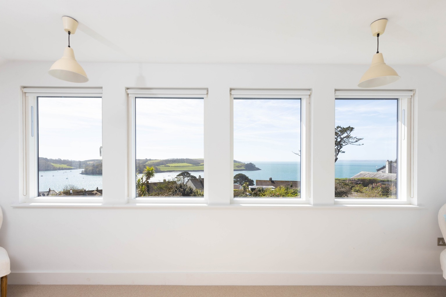 The first floor offers a further three double bedrooms. One is a standout guest suite with triple-aspect windows showcasing sweeping coastal vistas, while the other two share a stylish family bathroom and enjoy individual outlooks over land and sea.