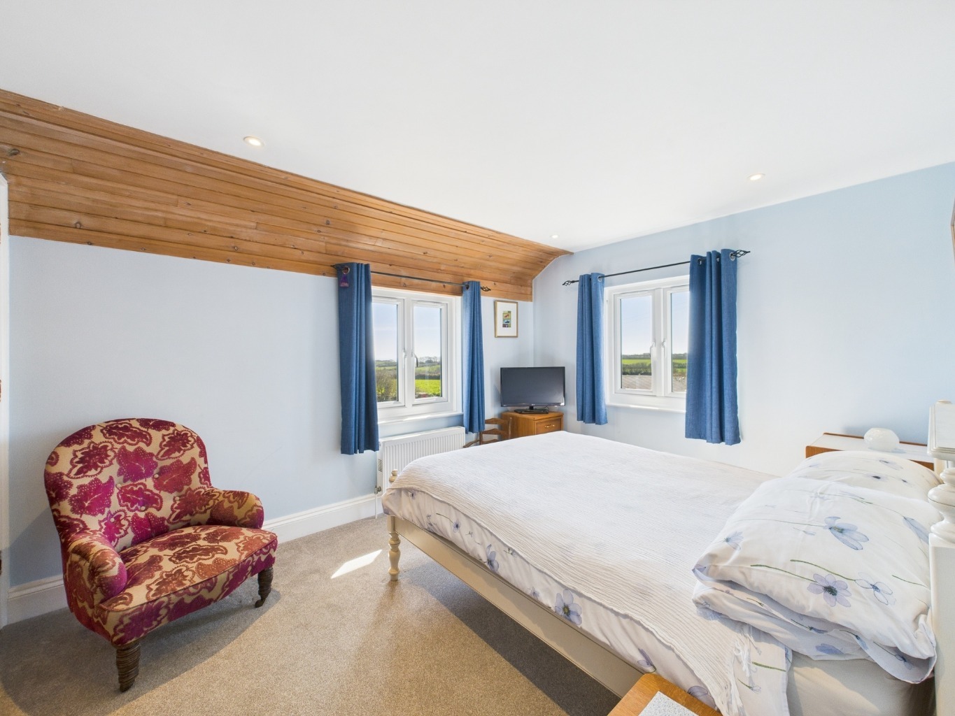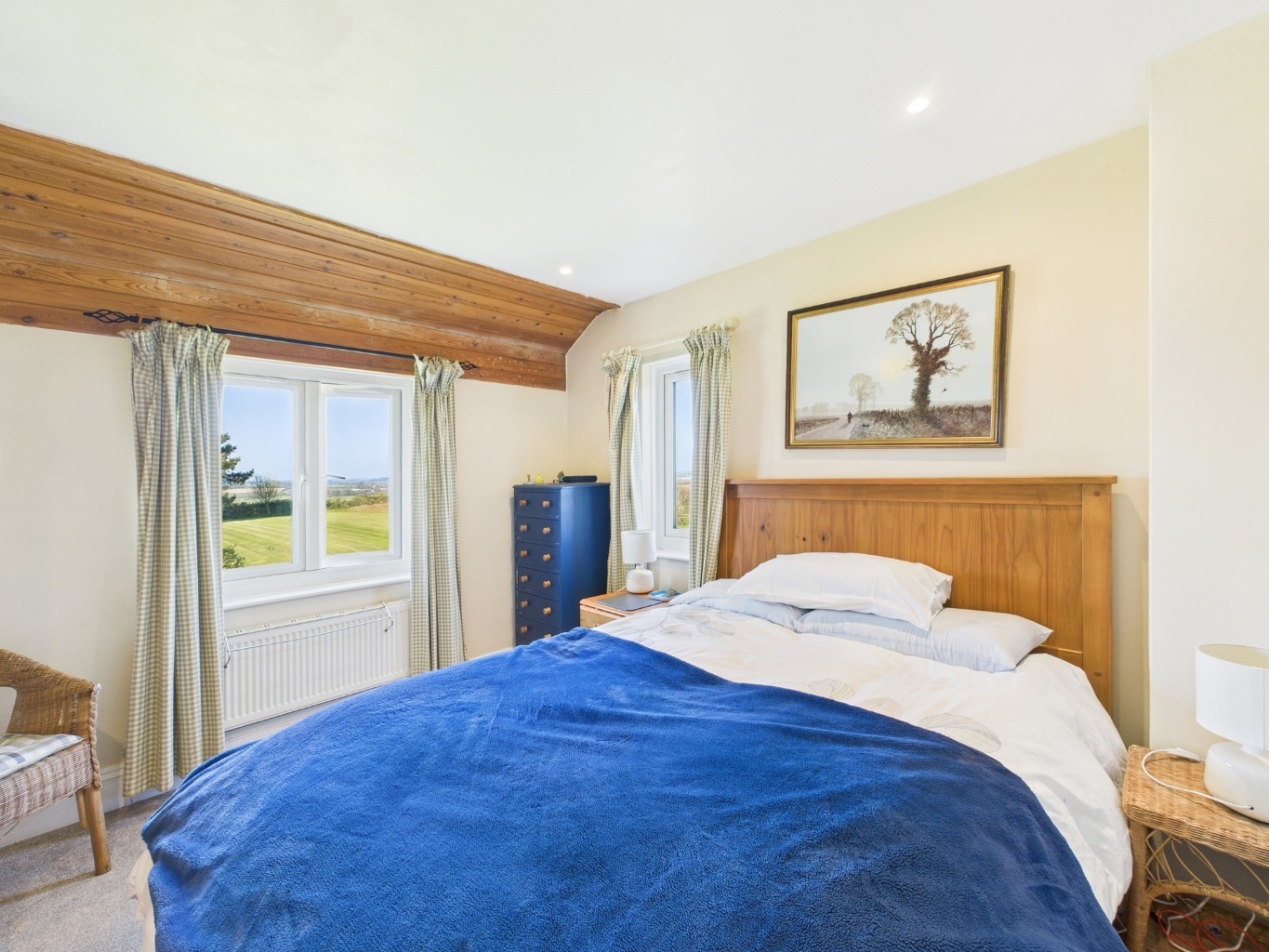 On the first floor, the primary bedroom enjoys double-aspect windows with distant sea views and its own en-suite shower room. There are two further double bedrooms on this level, both bright and spacious with views over the surrounding countryside. A family bathroom with shower over bath completes the upstairs accommodation.